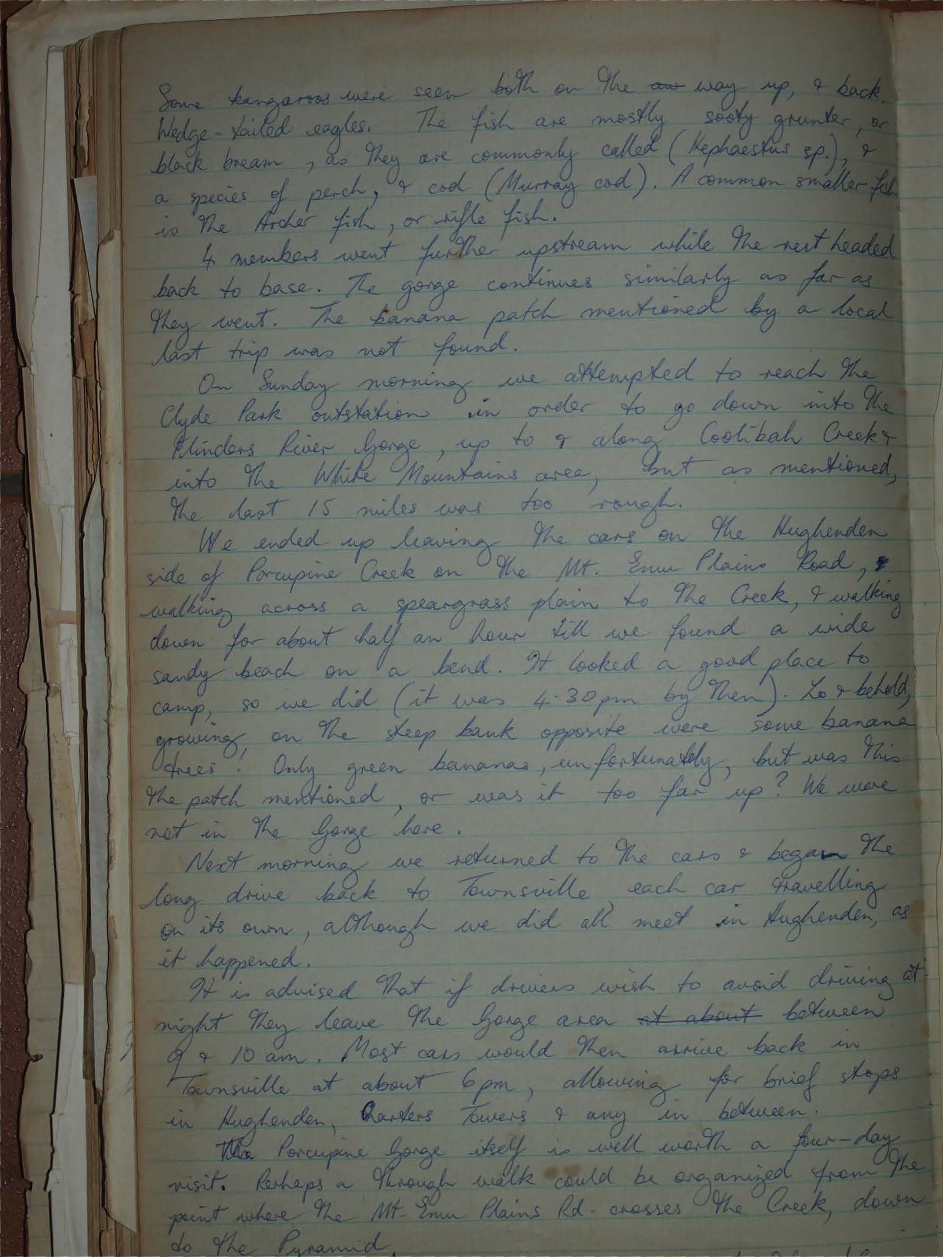 It is advised that if drivers wish to avoid driving at night they leave the Gorge area between 9 & 10 am. Most cars would then arrive back in Townsville at about 6pm, allowing for brief stops in Hughenden, Charters Towers & any in between. The Porcupine Gorge itself is well worth a four-day visit. Perhaps a through walk could be organized from the point where the Mt. Emu Plains Rd. crosses the Creek, down to the Pyramid.