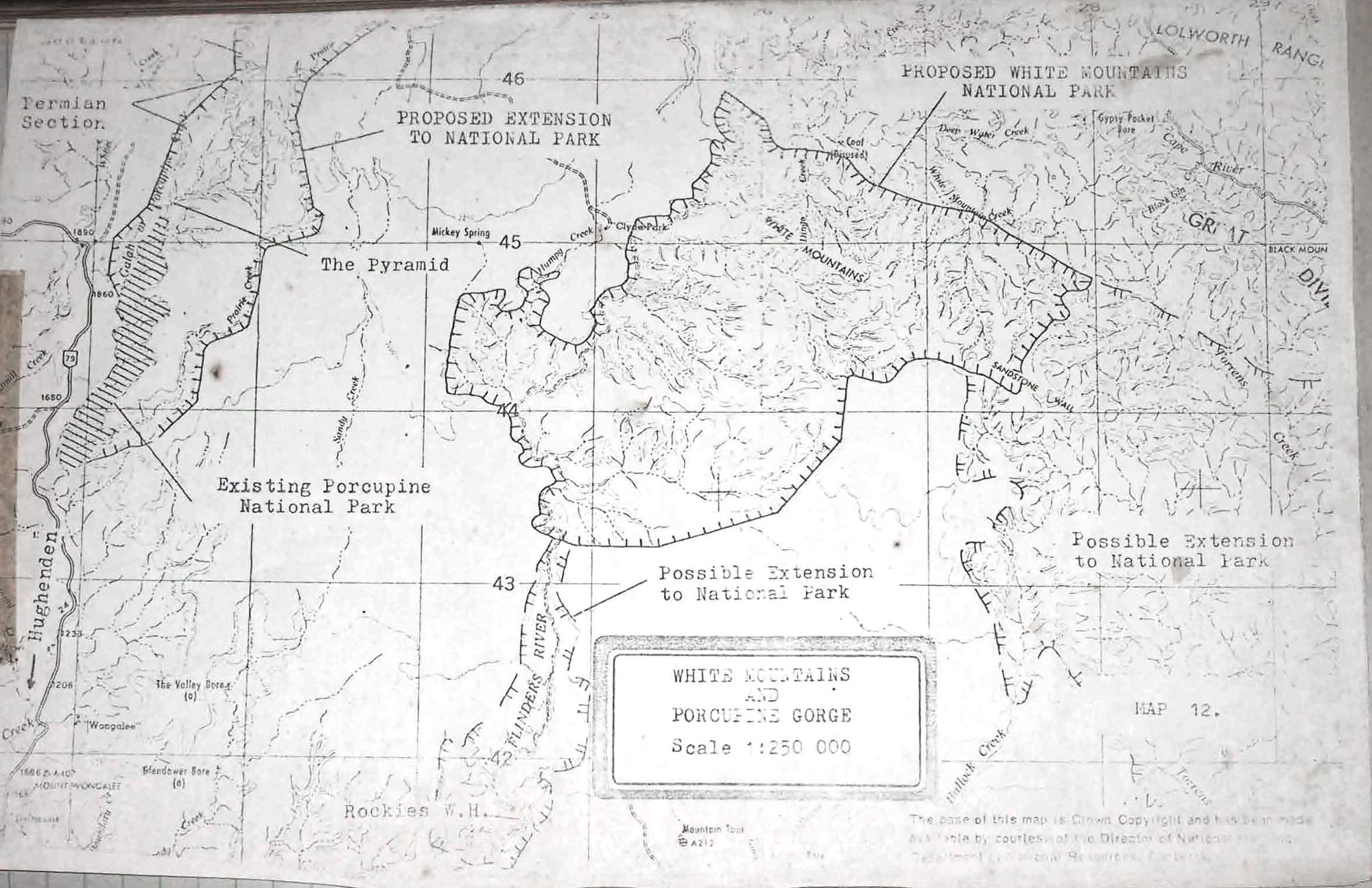 MAP: Hughenden 1:250,000 - also mud map drawn for us in a letter by Mr. Morton, owner of Strathway Station - This man owns part of the White Mountains area which we had also intended to visit but did not as the last 15 miles, i.e. the track to Clyde Park, was too rough for conventional vehicles. Anyone hoping to get into this area in future is advised to take 4-wheel drive vehicles or any other with high clearance. Also note that this is black soil country, which doesn't need much rain to become boggy.