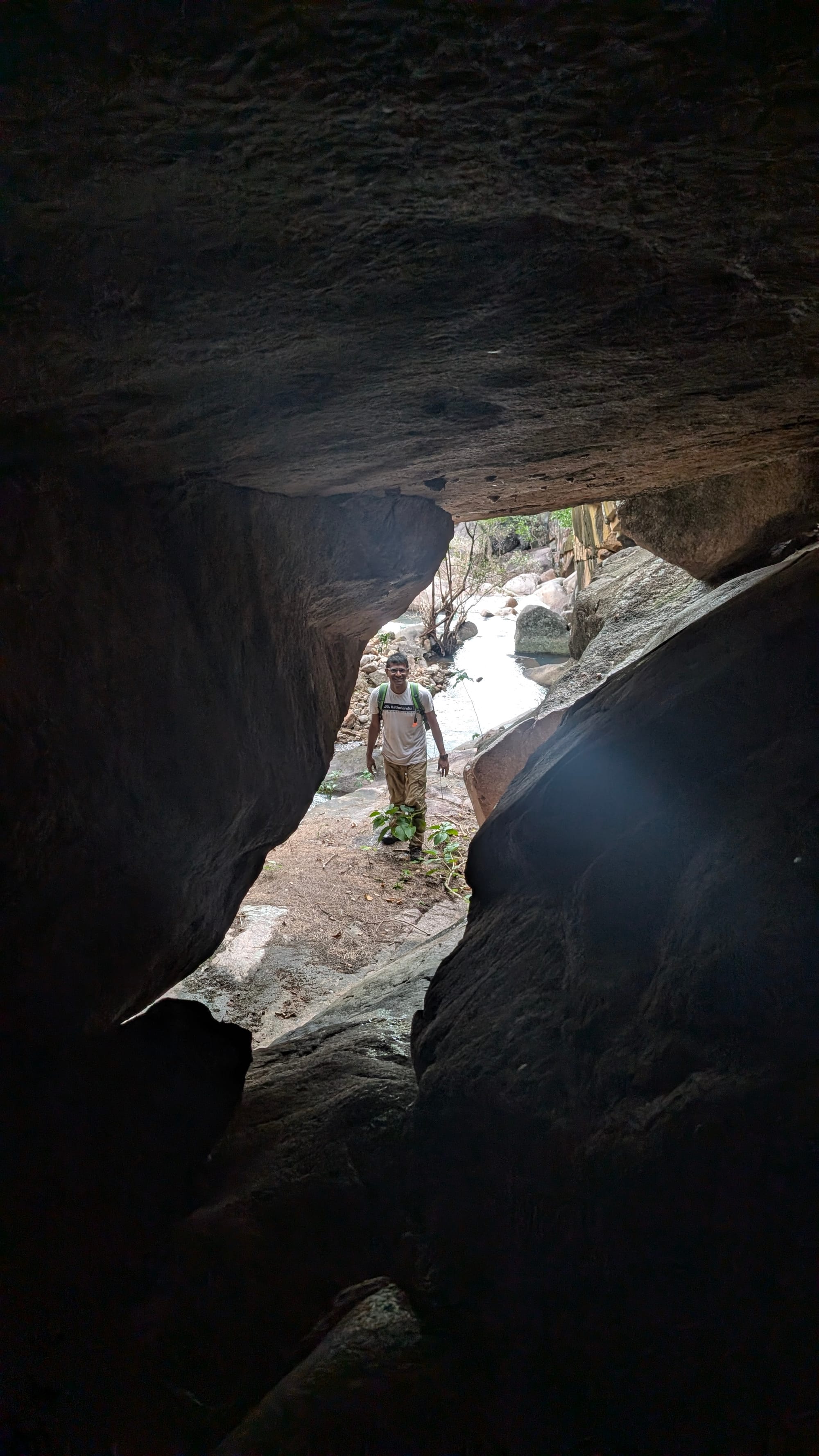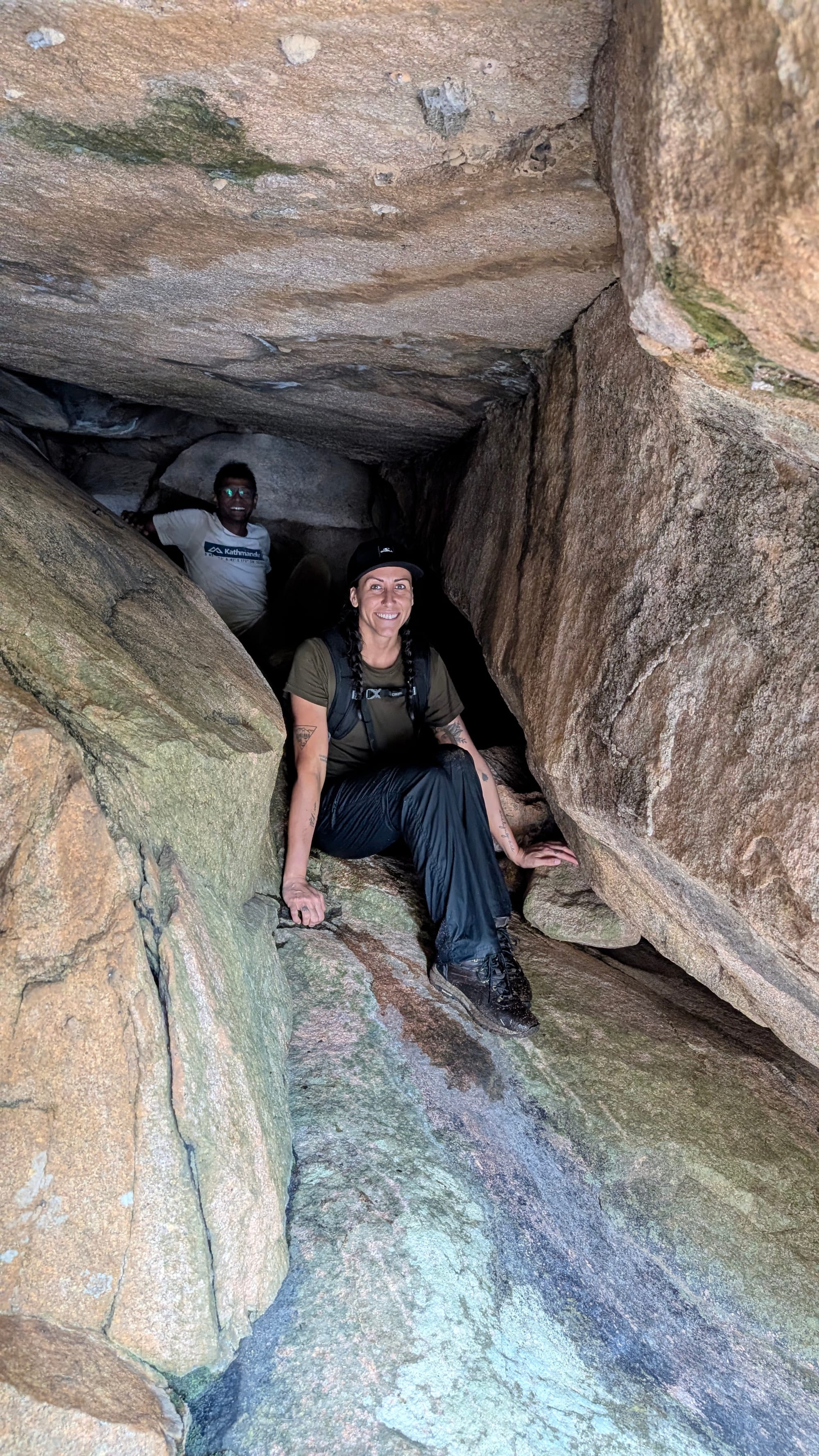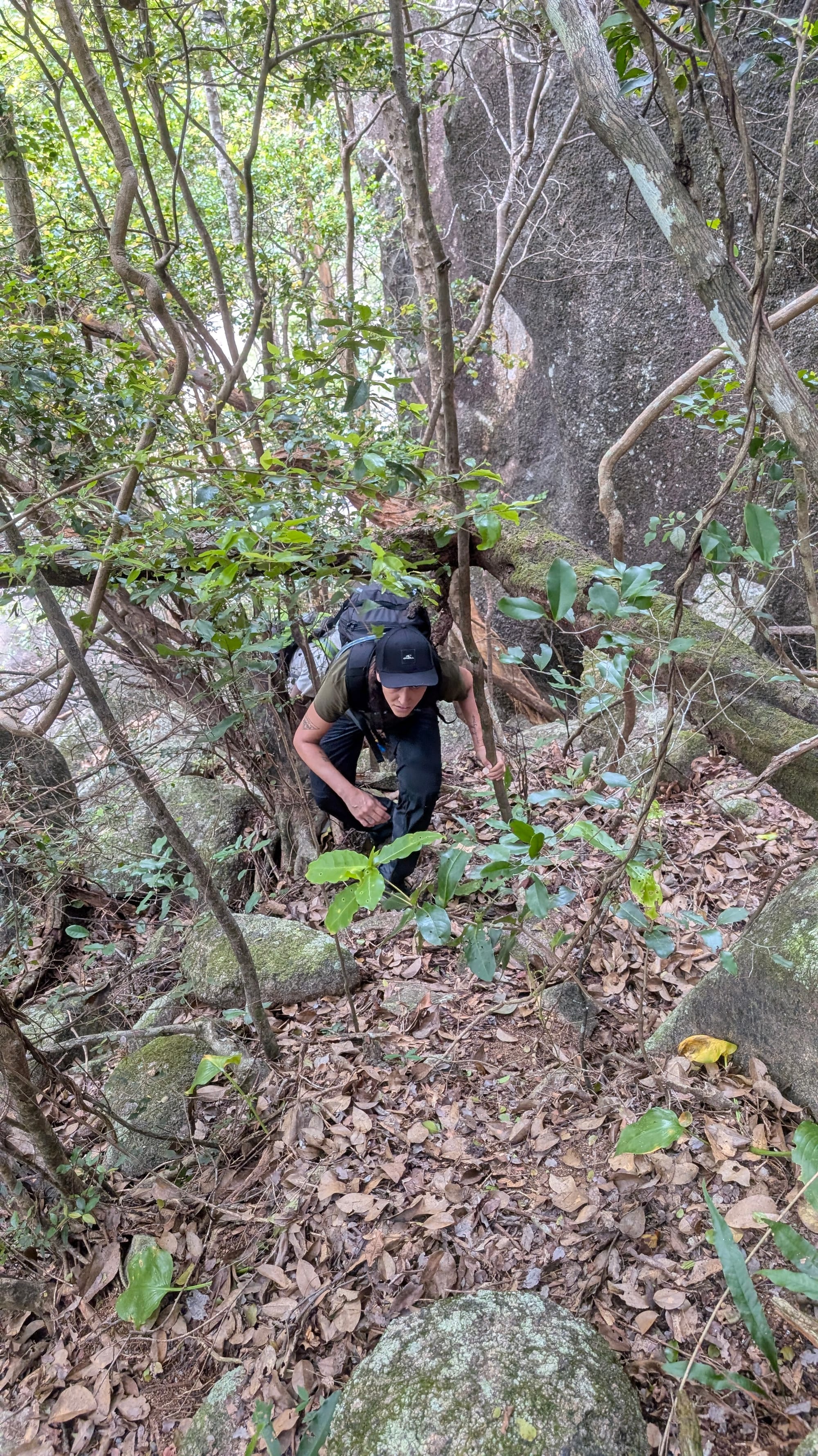 This creek is very rocky and technical, requiring constant rock hopping, scrambling and careful climbing upstream through the granite boulders. Progress was slow but fun, the kind of terrain that keeps you fully engaged with every step. The further we climbed, the larger the granite boulders became. Partway upstream we reached one of the creek’s most unusual features - a large granite cave tucked beneath a massive overhanging block.