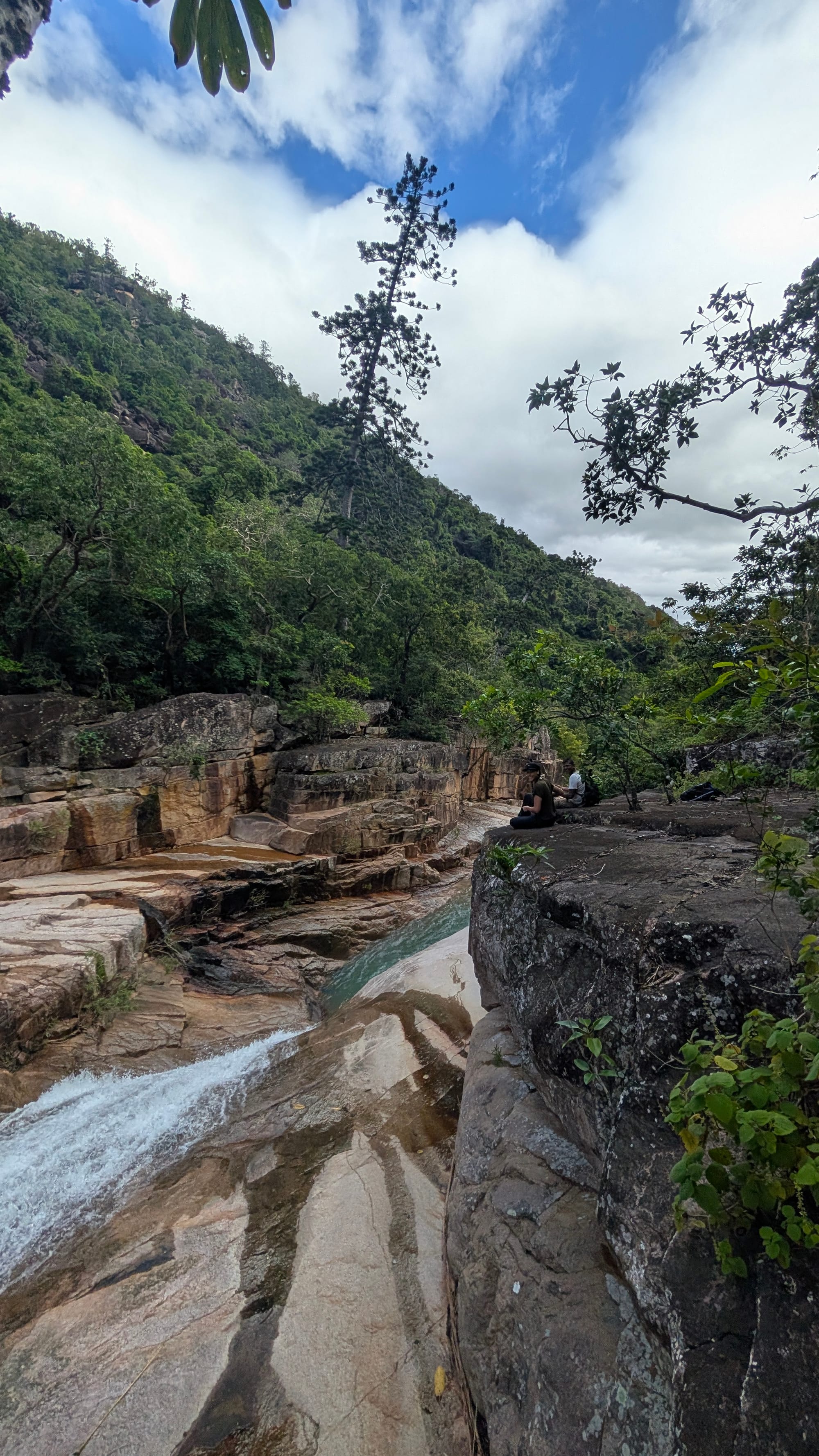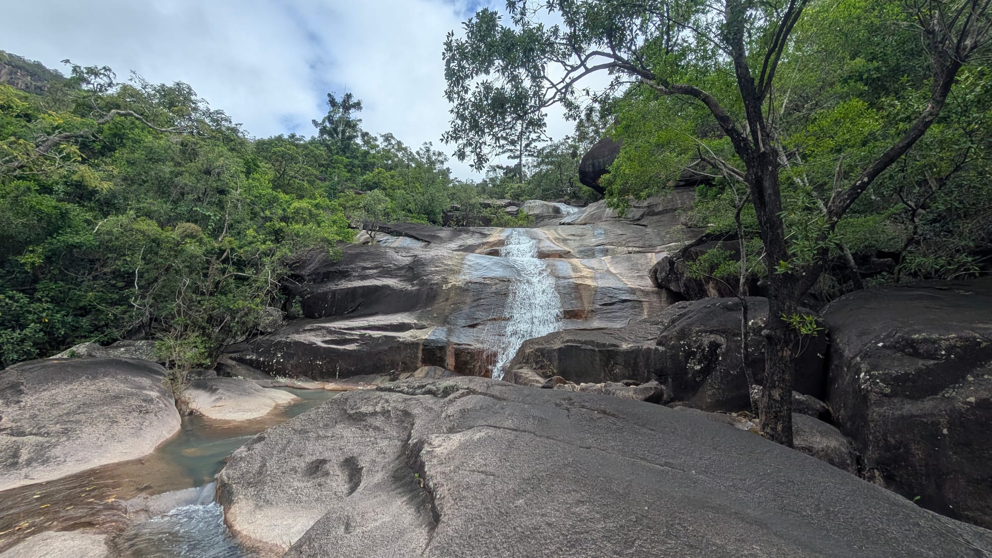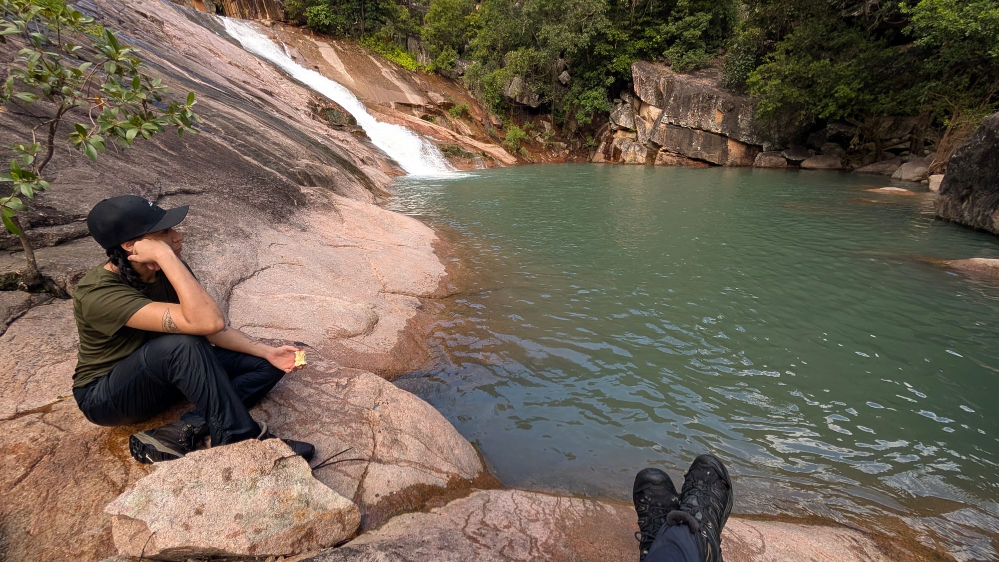Not long after the cave we reached the main waterfall - a beautiful slabby cascade dropping into a clear swimming hole. Granite walls framed the pool and the water slid down polished rock into the basin below. It was the perfect place to stop.