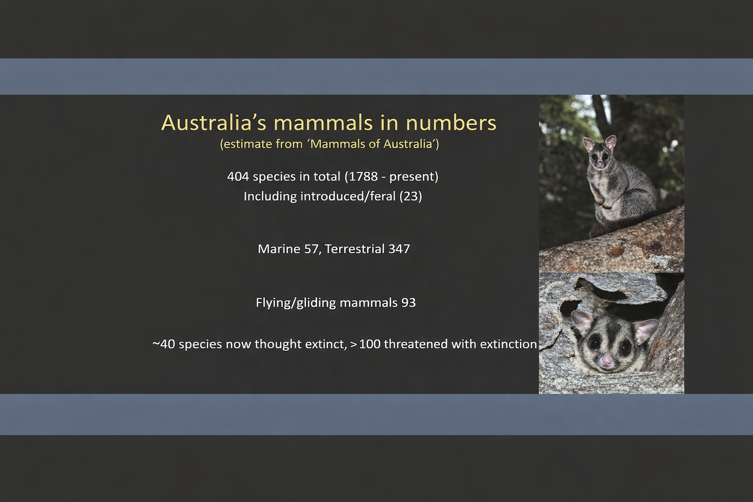 Since 1788, Australia has recorded 404 mammal species. Around 40 are now thought to be extinct, and more than 100 are threatened with extinction. Australia leads the world in mammal extinctions. Globally, wild mammals now make up just 4 percent of total mammal biomass, with humans and livestock accounting for the rest. In the past 50 years alone, vertebrate populations worldwide have declined by around 60 percent. These are big numbers, but they translate into small, local realities – fewer gliders in the canopy, fewer small marsupials in creek lines, quieter nights in the bush.
