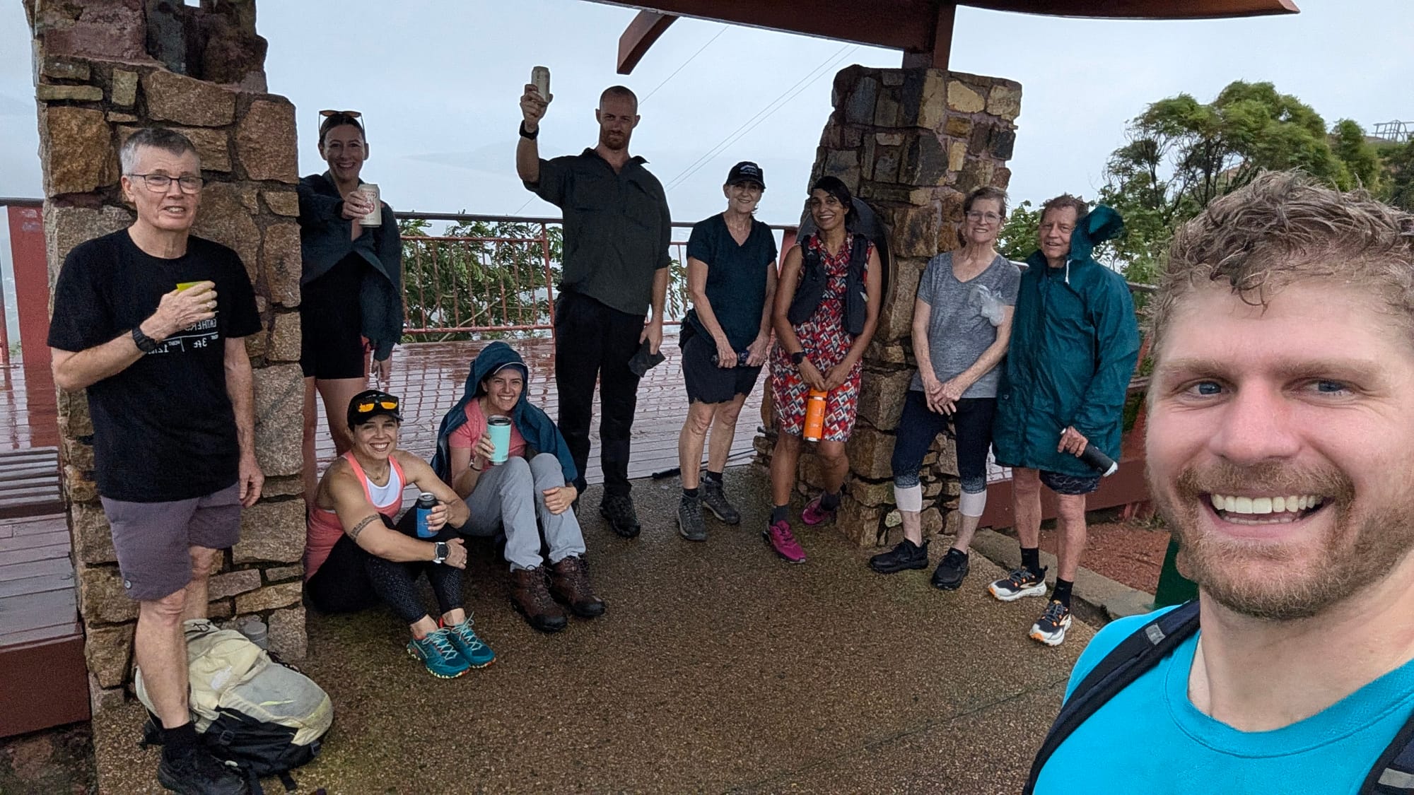 06/03/26 Ladies Track Stroll and Sip on Castle Hill turned out to be a great little event, even though it was rainy and very windy. After a few weather-related no-shows, ten of us still met Friday at 5:30 pm on Castle Hill Road and made our way up Ladies Track to the summit, where we enjoyed a cool, windswept drink under shelter before strolling back down the road. A fun and slightly wild evening out – proof that a bit of weather does not always ruin the adventure.