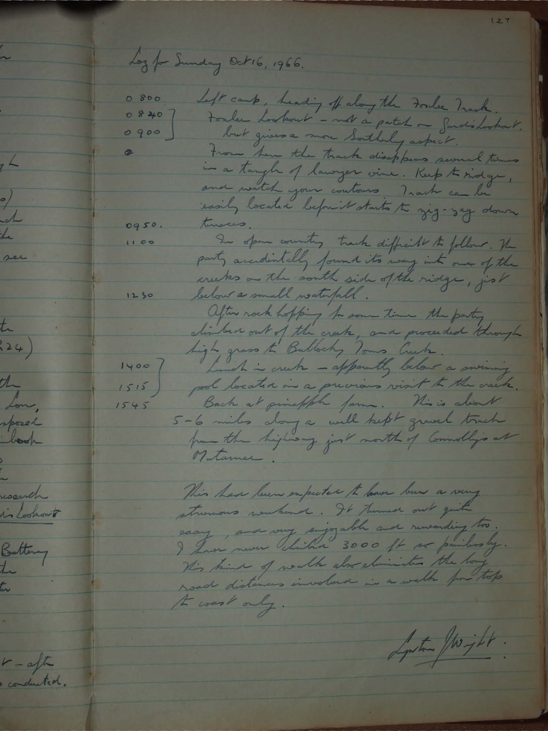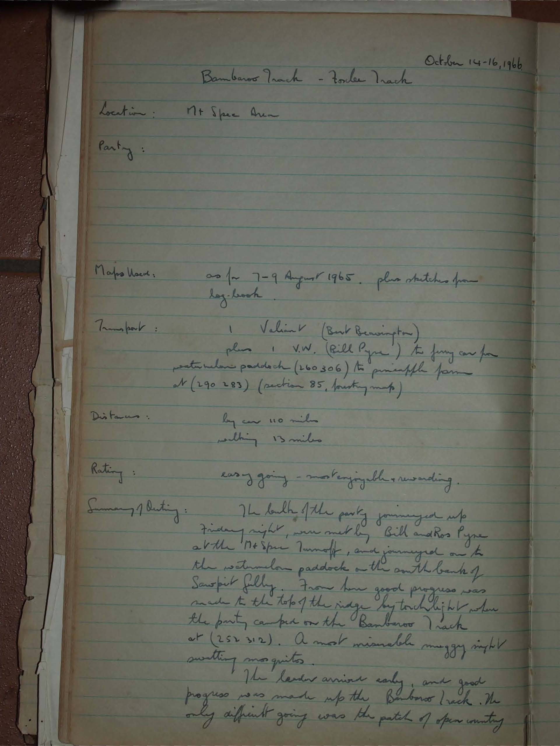 1230 After rock hopping for some time the party climbed out of the creek, and proceeded through light grass to Bullocky Toms Creek.