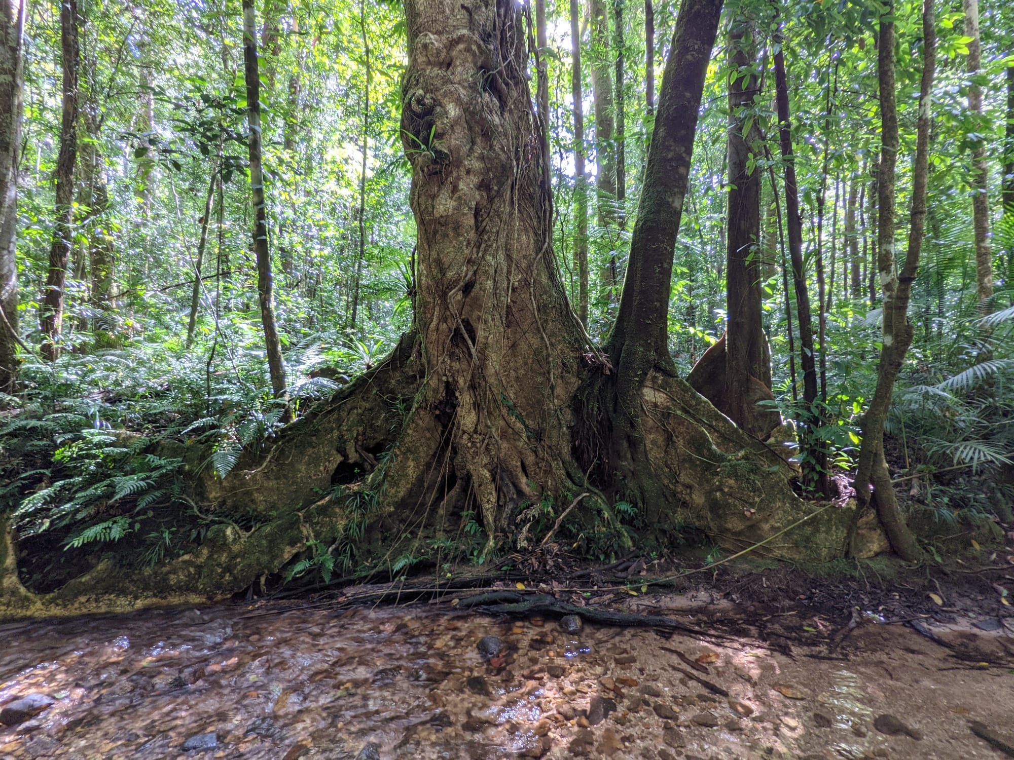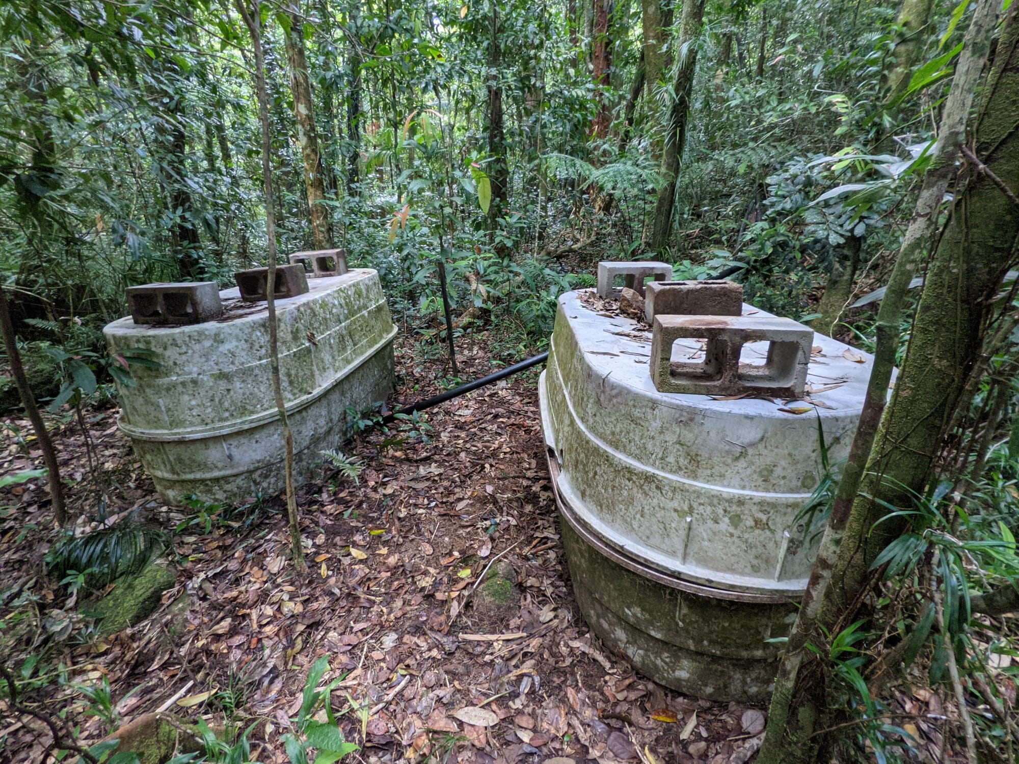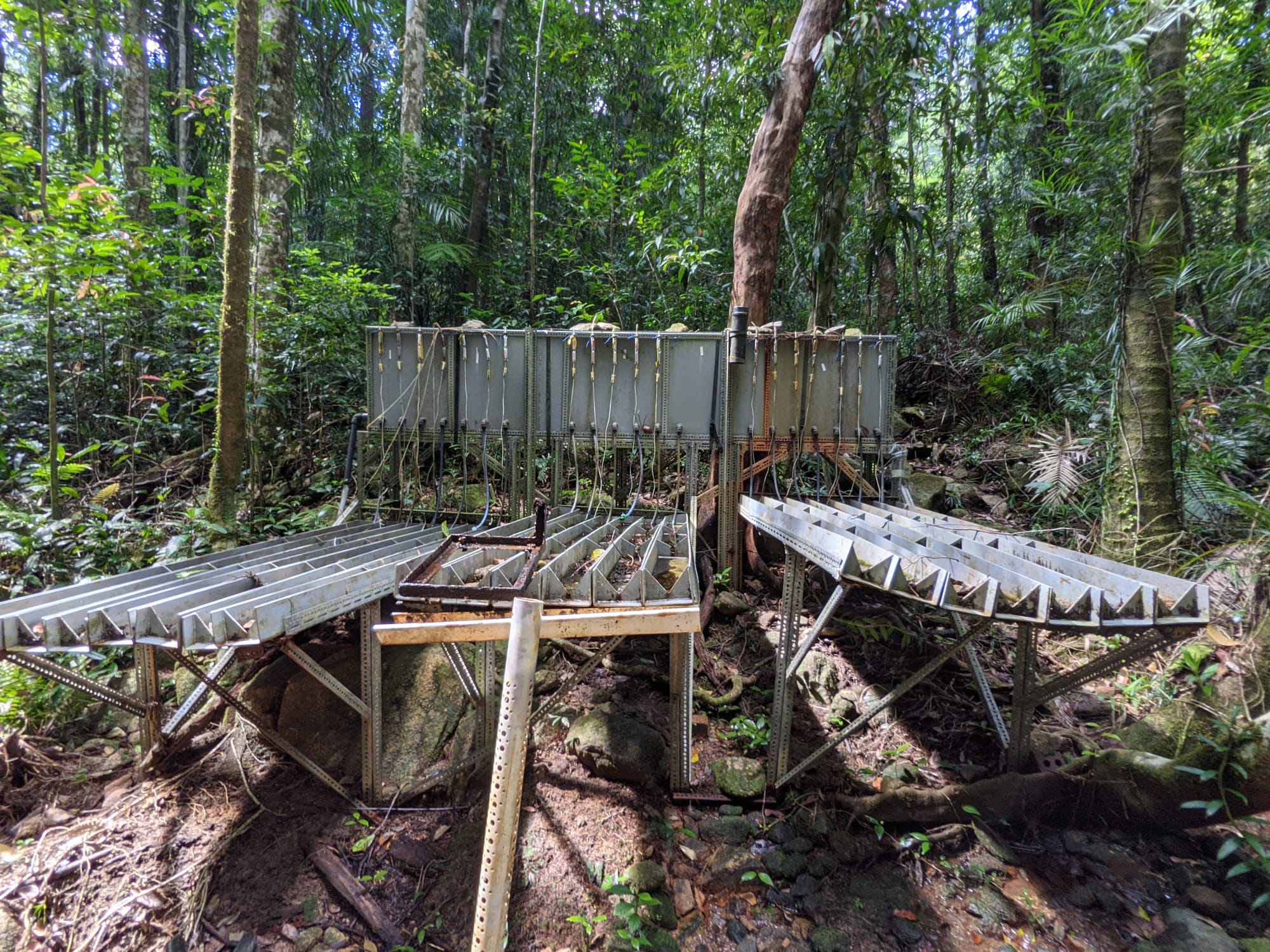 As we continued upstream, one disappointing feature of the walk was the scattered plastic and rubbish caught along the creekline, which became more noticeable as we approached the abandoned JCU Research Station. Despite that, this section was fascinating to explore. The old research infrastructure gave a glimpse into how scientific data had once been collected in the area, and it was interesting to imagine the work that had taken place there over the years. Wilfred and his team had already done a clean-up there not long before this walk, and we (Wilfred, myself and co) returned a few weeks later on the weekly Thursday trail maintenance to remove more rubbish from the site.