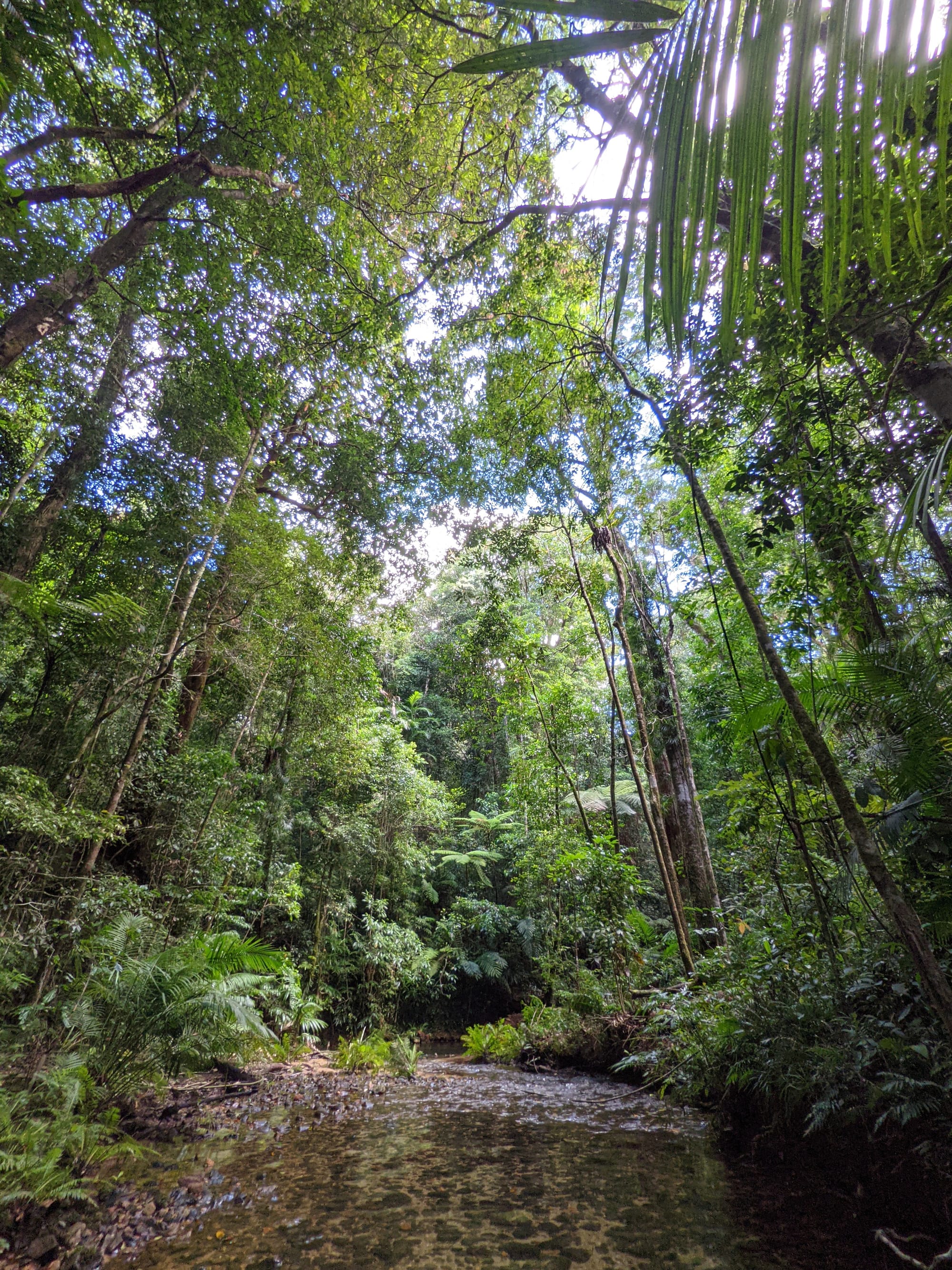 Starting from the Paluma Dam Road bridge, we dropped down to the creek and began making our way upstream. It was a beautiful start to the day, with lush green rainforest, clear water, and mostly easy creek walking. The creek here was fairly flat, with small rocks underfoot that made progress straightforward. Every now and then, we came to deeper pool sections, which we either waded through or sidled around. A small cascade provided an easy little climb and added to the fun.