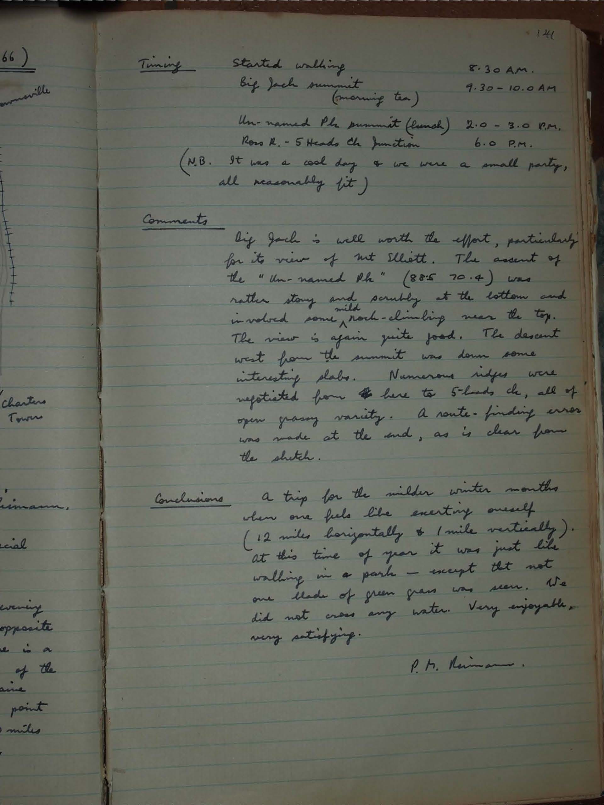 Big Jack is well worth the effort, particularly for its view of Mt Elliott. The ascent of the "Un-named Pk" (885 70.4) was rather stony and scrubby at the bottom and involved some mild rock-climbing near the top. The view is again quite good. The descent went from the summit was down some interesting slabs. Numerous ridges were negotiated from here to 5-heads ch, all of open grassy variety. A route-finding error was made at the end, as is clear from the sketch.