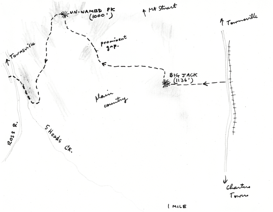 A car was left the previous evening on the upper Ross R. road just opposite the 5 Heads Ck junction. Here there is a cleared patch on the eastern side of the road safe from bushfires. Lorraine Campbell drove us to our starting point on the road to Charters Towers, 10 miles from Townsville, opposite Big Jack.