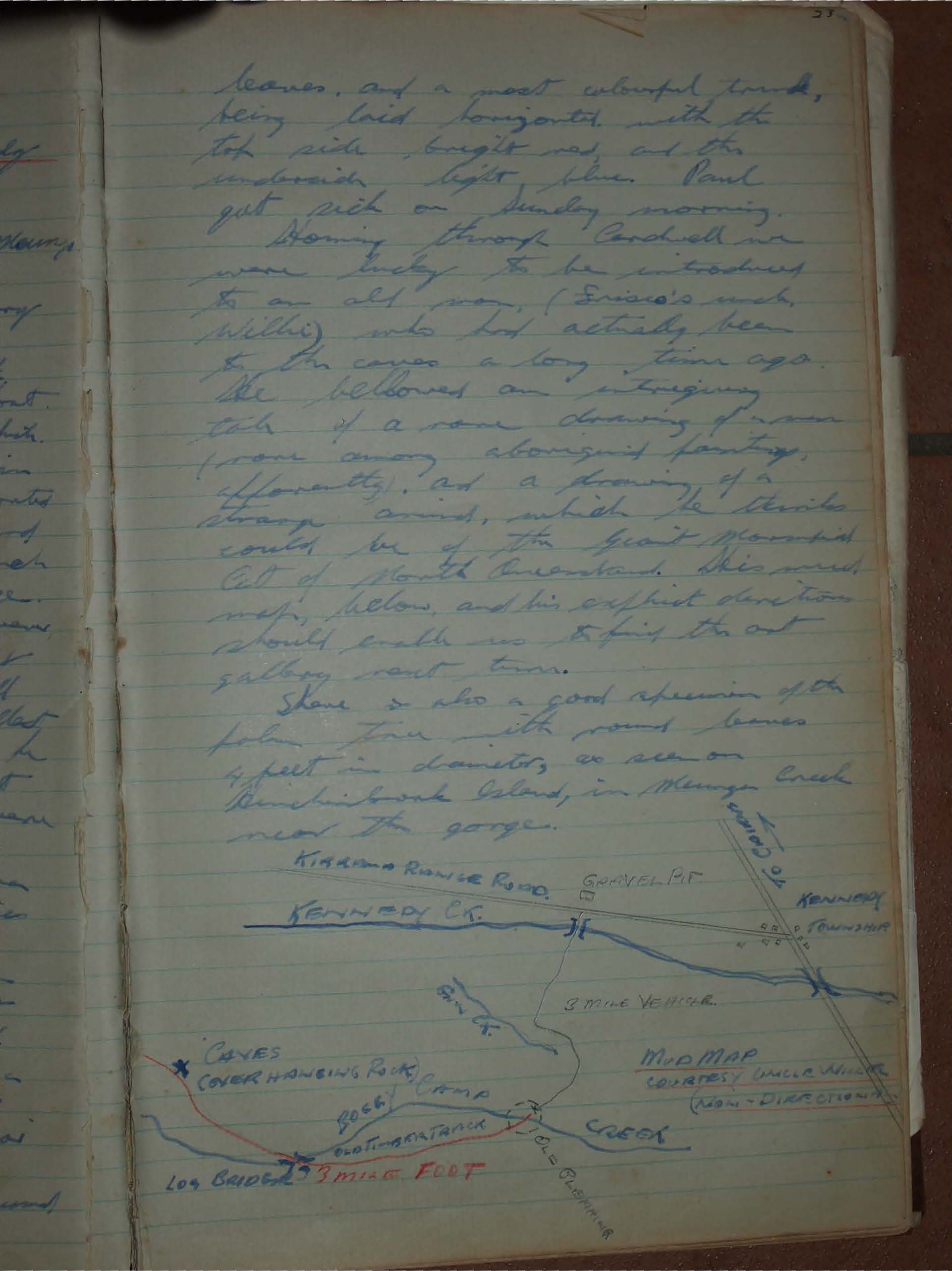 Coming through Cardwell we were lucky to be introduced to an old man, (Eric's uncle, Willie) who had actually been to the caves a long time ago. He bestowed an intriguing tale of a row of aboriginal paintings from among aborigines (apparently), and a drawing of a strange animal, which he thinks could be of the Giant Marsupial Cat of North Queensland. His own map, below, and his explicit direction would enable us to find the art gallery next time.
