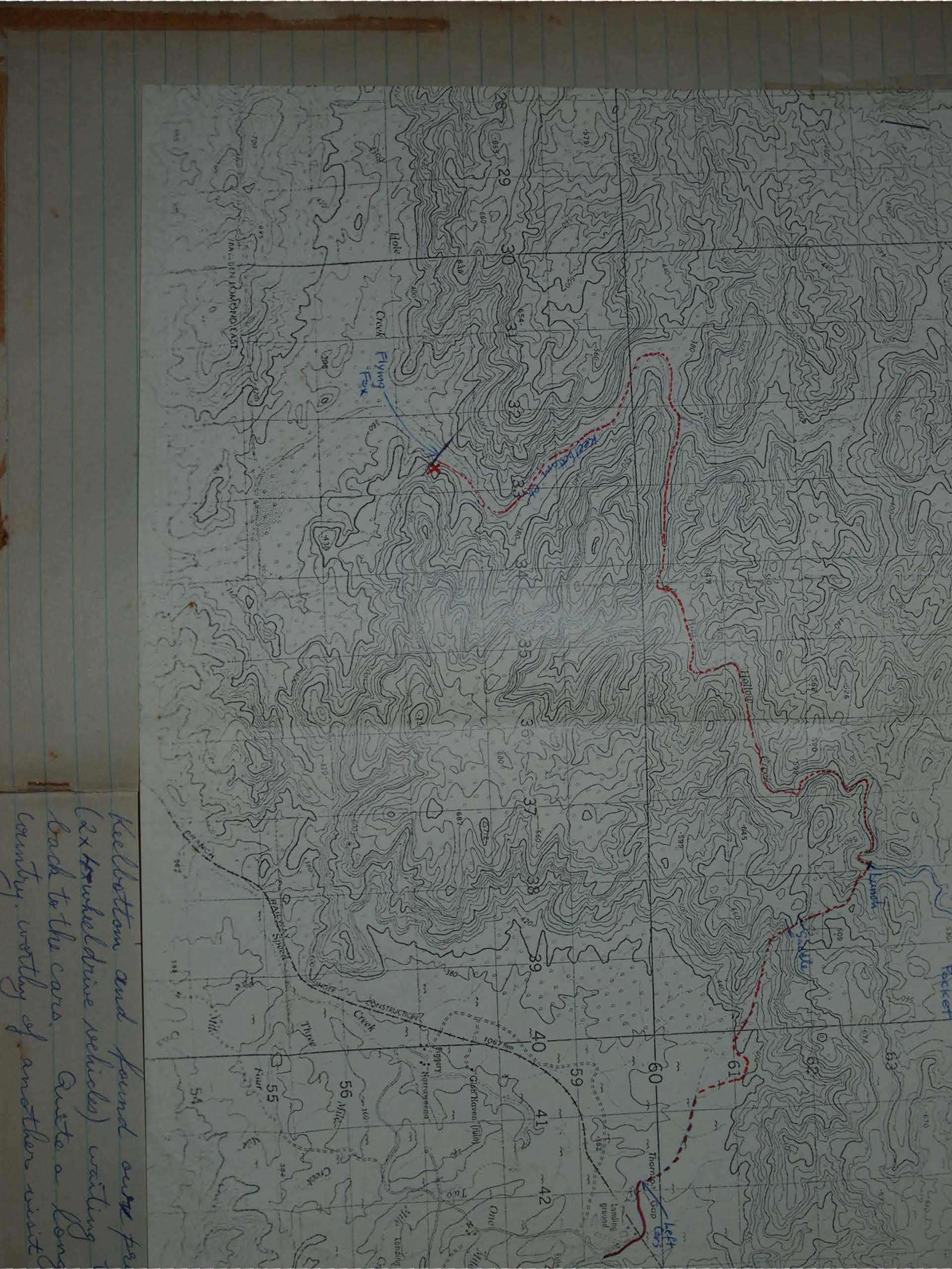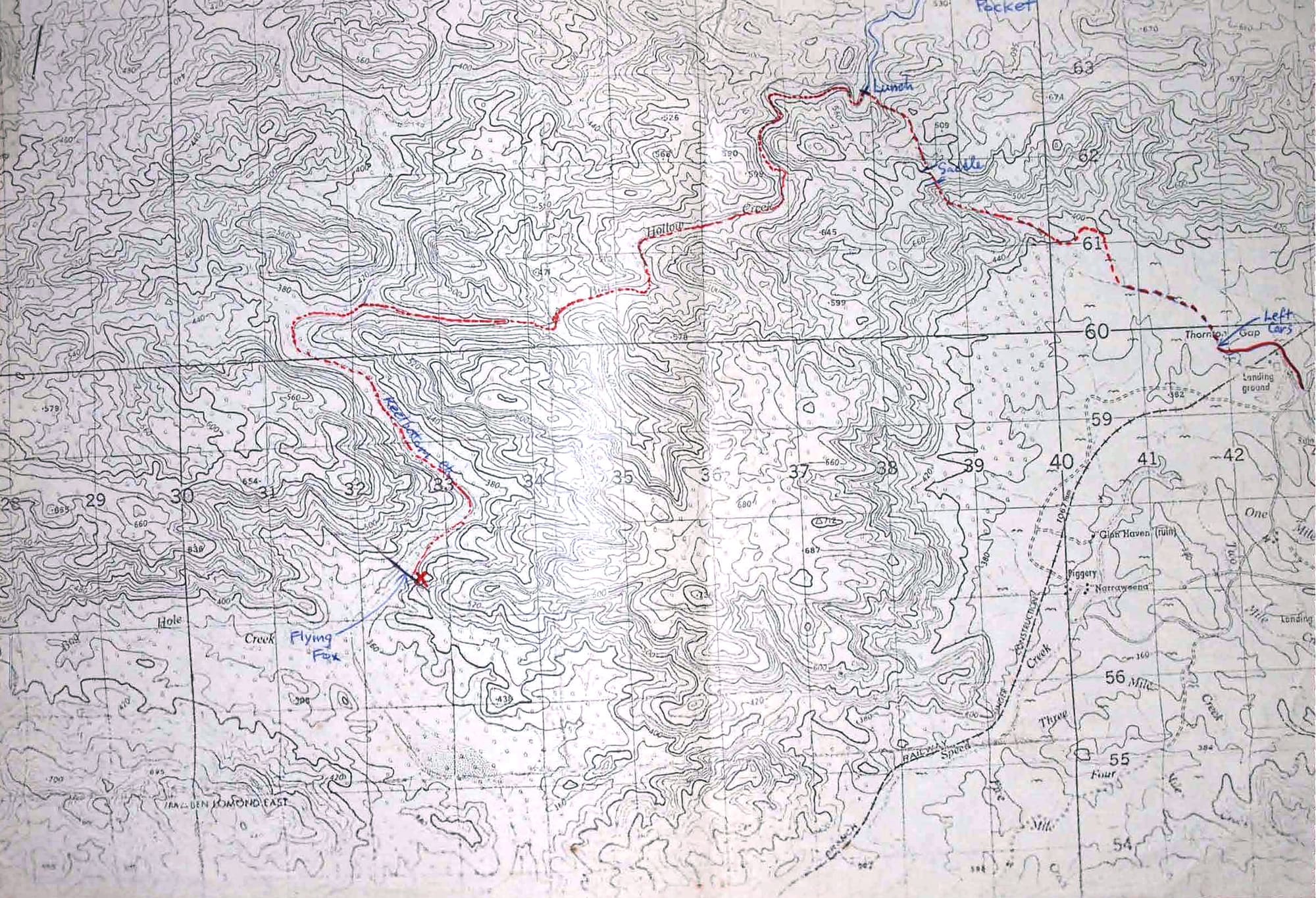 Then followed Bog Hollow Ck down, mostly dry with a number of pools, casuarinas abundant & hoop pines on the gorge walls. The gorge was quite interesting in the last mile where it ran almost straight between walls several hundred feet high in places. Emerged into Keelbottom Ck - also very impressive & on a larger scale. This Ck was still flowing slowly & had some magnificent pools, with sandy stretches & rock hopping alternating to make the walking interesting. At about 5pm we reached the flying fox across the Keelbottom and found our pre-arranged transport (2x 4 wheel drive vehicles) waiting to take us 14 miles back to the cars. Quite a long day but interesting country, worthy of another visit.