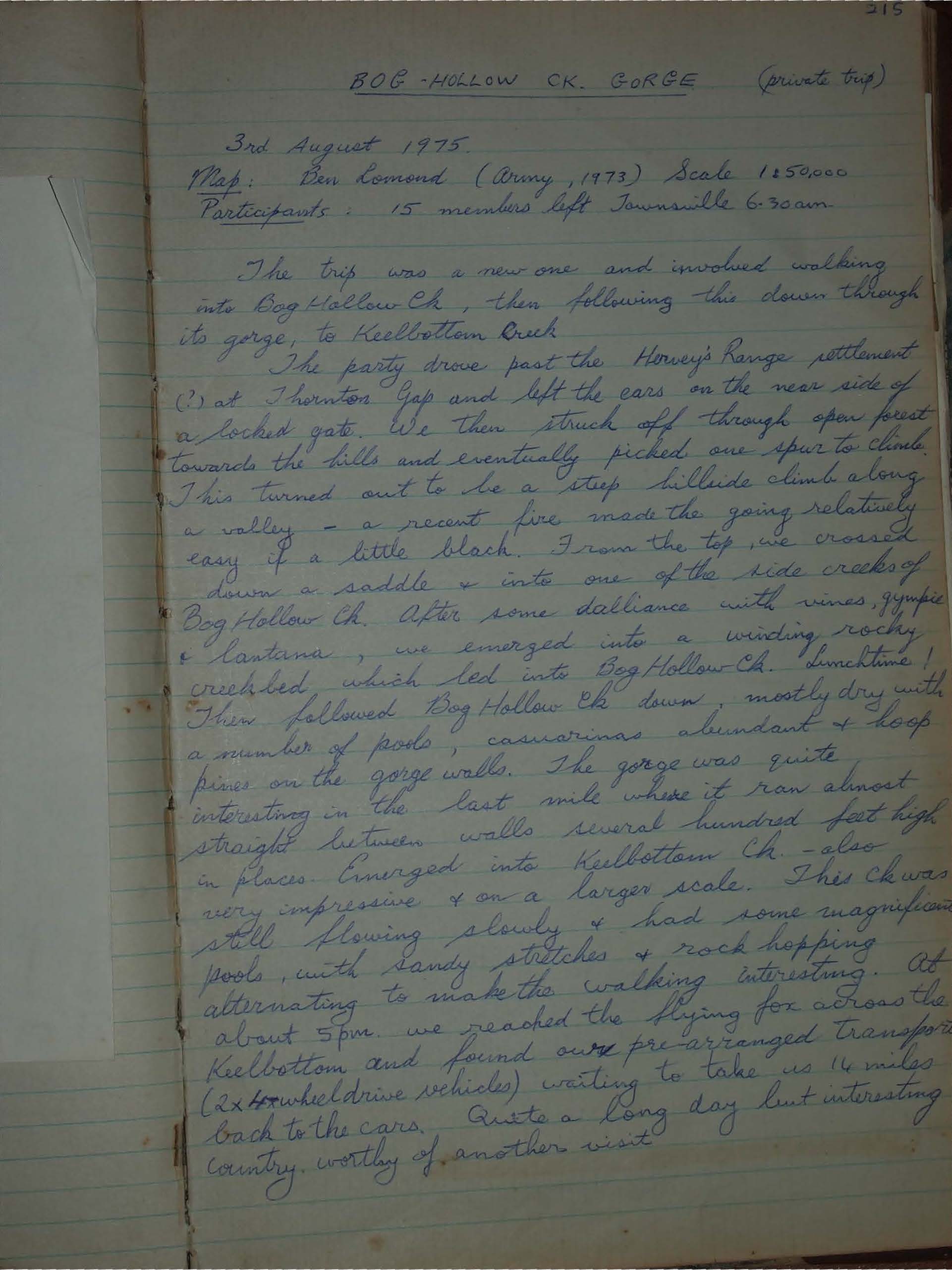 Bog Hollow Creek Gorge hike, Aug 1975: a rugged private trip from Hervey’s Range into steep spurs, rainforest vines, and rocky creekbeds. The gorge revealed casuarinas, hoop pines, towering cliffs, and pools before meeting Keelbottom Creek—an adventurous North Queensland bushwalking route.