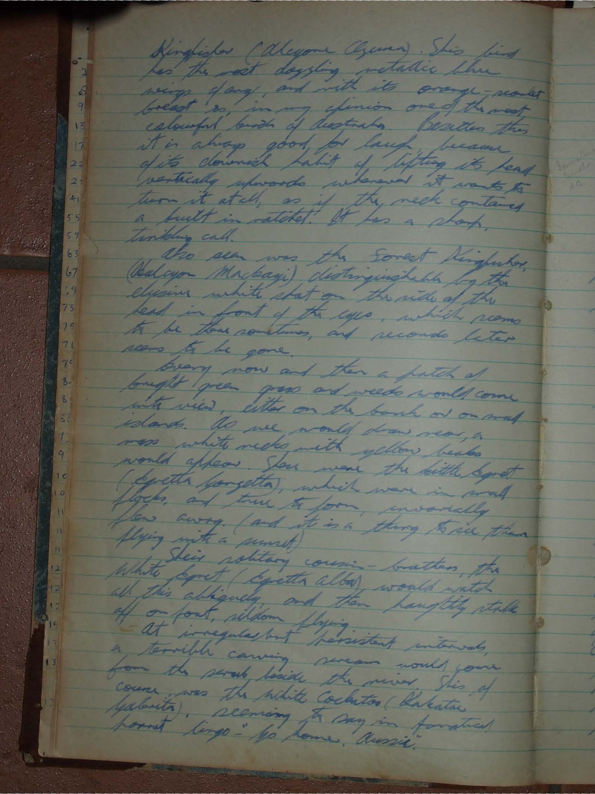 Most priceless was the Azure Kingfisher (Alcyone Azurea). This bird has the most dazzling metallic blue wings of any, and with its orange-scarlet breast is, in my opinion one of the most colourful birds of Australia. Besides this it is always good for laugh because of its clownish habit of lifting its head vertically upwards whenever it wants to turn it at all, as if the neck contained a built in ratchet. It has a sharp, tinkling call.