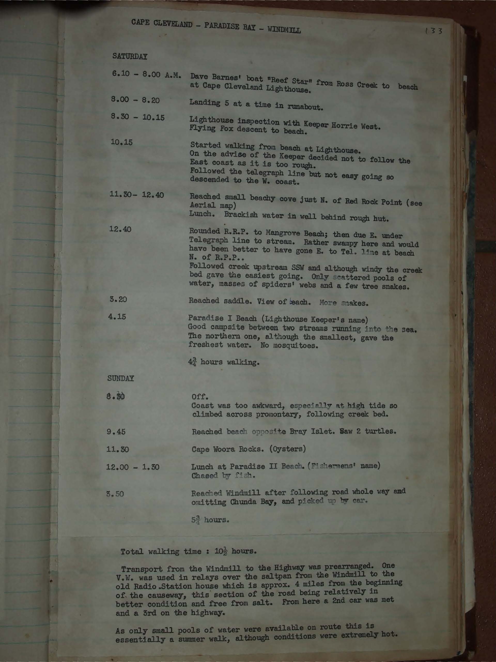 12.40 Rounded R.R.P. to Mangrove Beach; then due E. under Telegraph line to stream. Rather swampy here and would have been better to have gone E. to Tel. line at beach N. of R.R.P.. Followed creek upstream SSW and although windy the creek bed gave the easiest going. Only scattered pools of water, masses of spiders' webs and a few tree snakes.