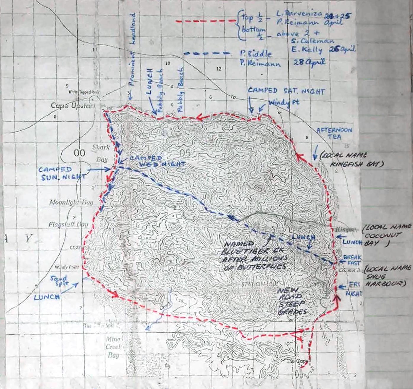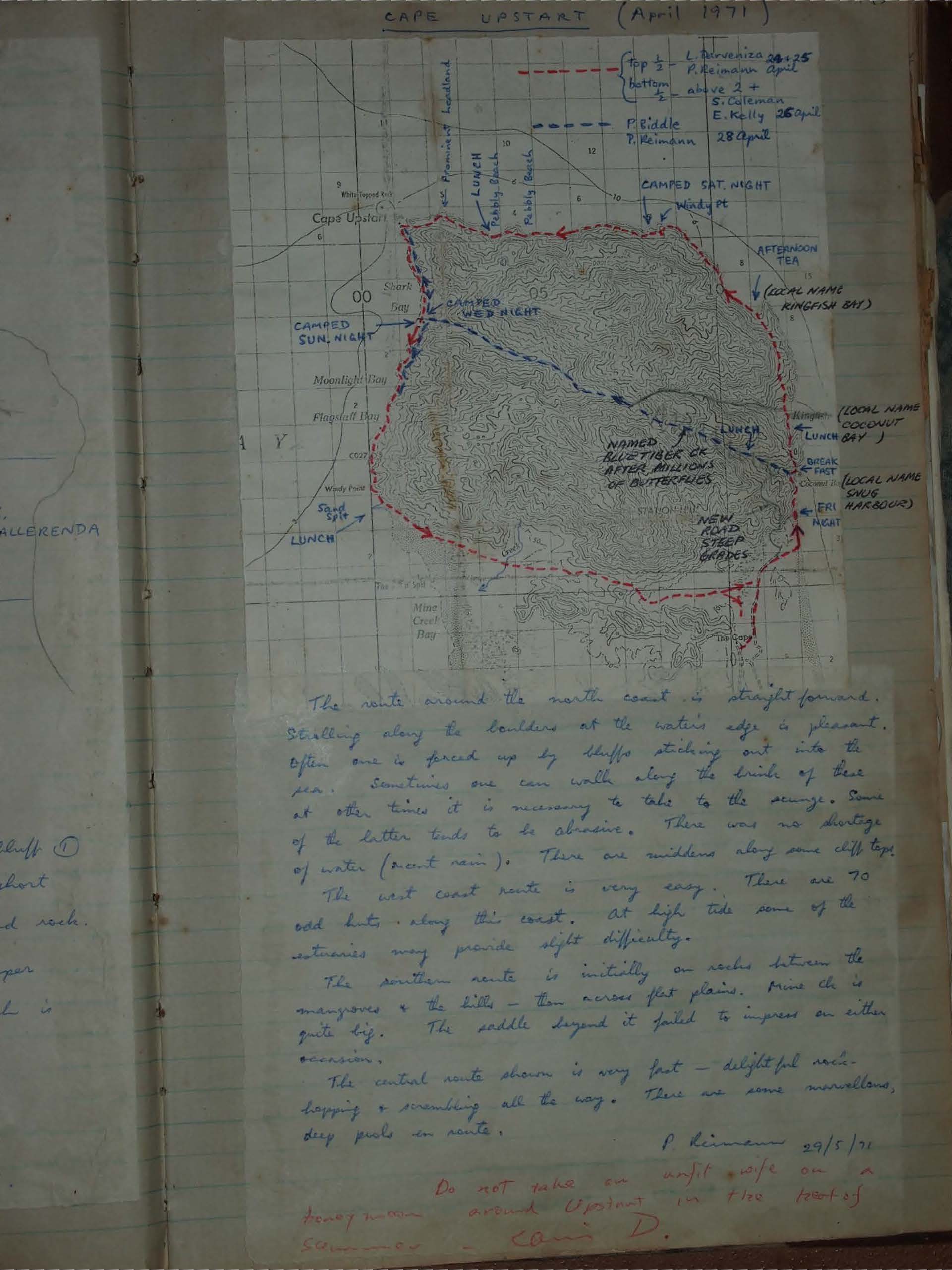 Cape Upstart, April 1971: a rugged coastal trek with routes past Pebbly Beach, Moonlight Bay, Shark Bay and Kingfish Bay. Hike along bluffs, scrunge, and rock-hopping tracks, discover middens, deep pools, and butterfly-filled creeks. A classic North Queensland adventure on land and sea.