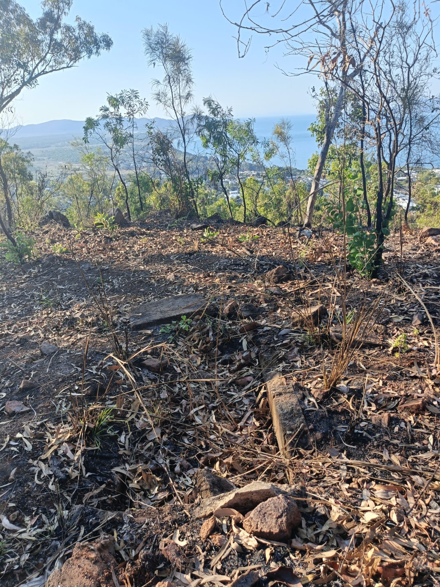 - Searchlight tower site: Short side trip to the concrete pads of the searchlight emplacement, recently exposed by a controlled burn. We spotted several old camp terraces nearby. Stories of AWAS polishing the searchlight mirror to sweep across Cleveland Bay.
