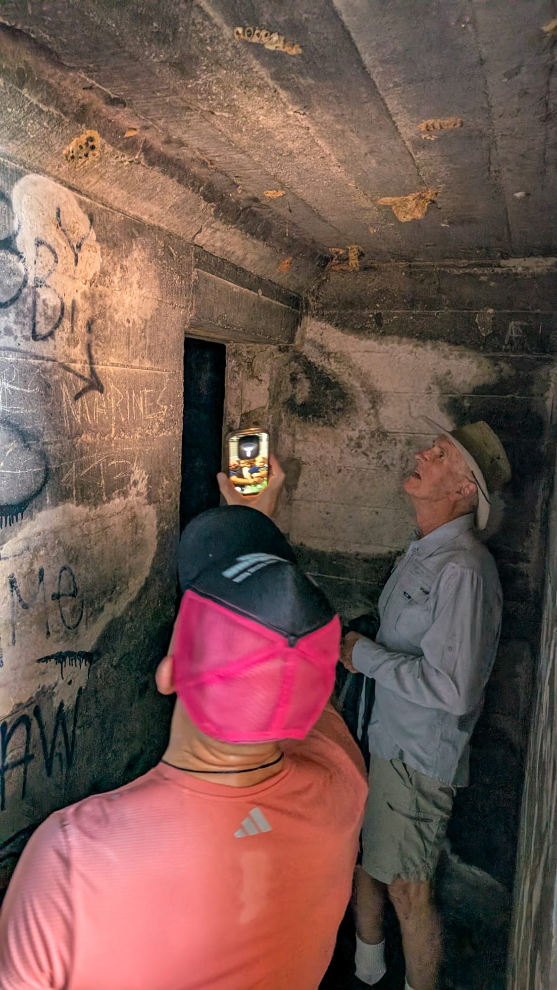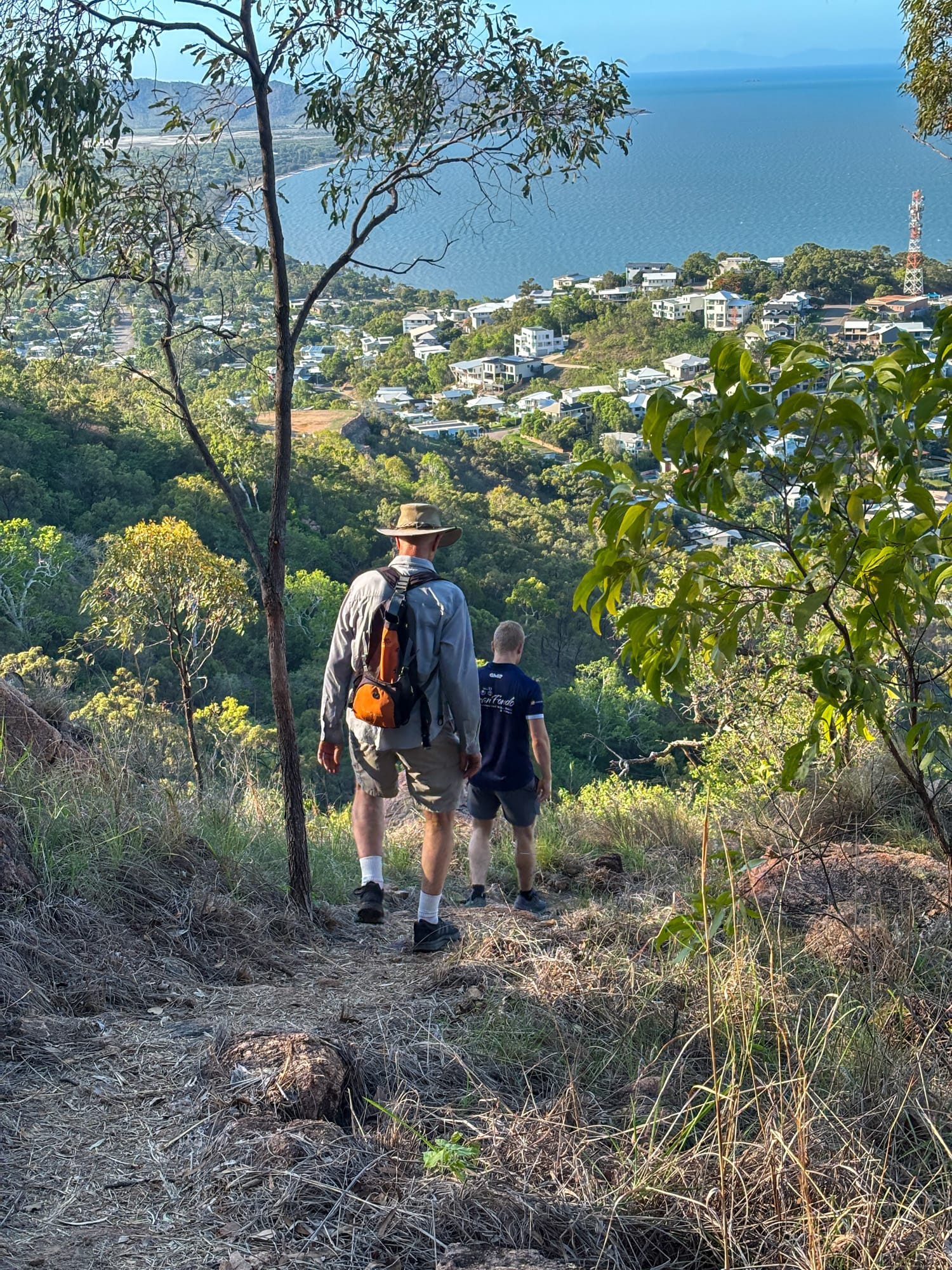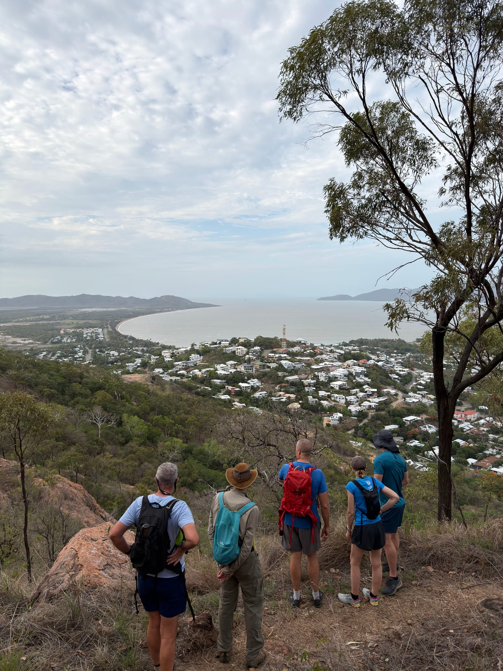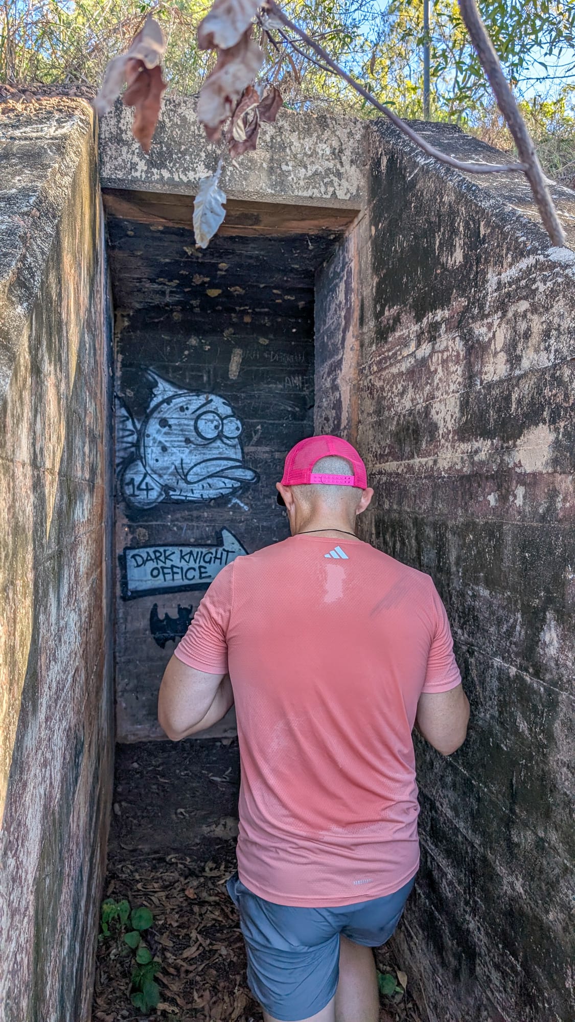 Both groups continued to the summit precinct via Ladies Track. The pillboxes and cliff-edge command post felt especially atmospheric in the late-afternoon light. With the smaller group on the final walk, we spent more time exploring the different vantage points and discussing the communications link between the summit post, Magnetic Island’s RAN Station 21, and the coastal defence network. As well as the modern zip line between the summit and the bunker.