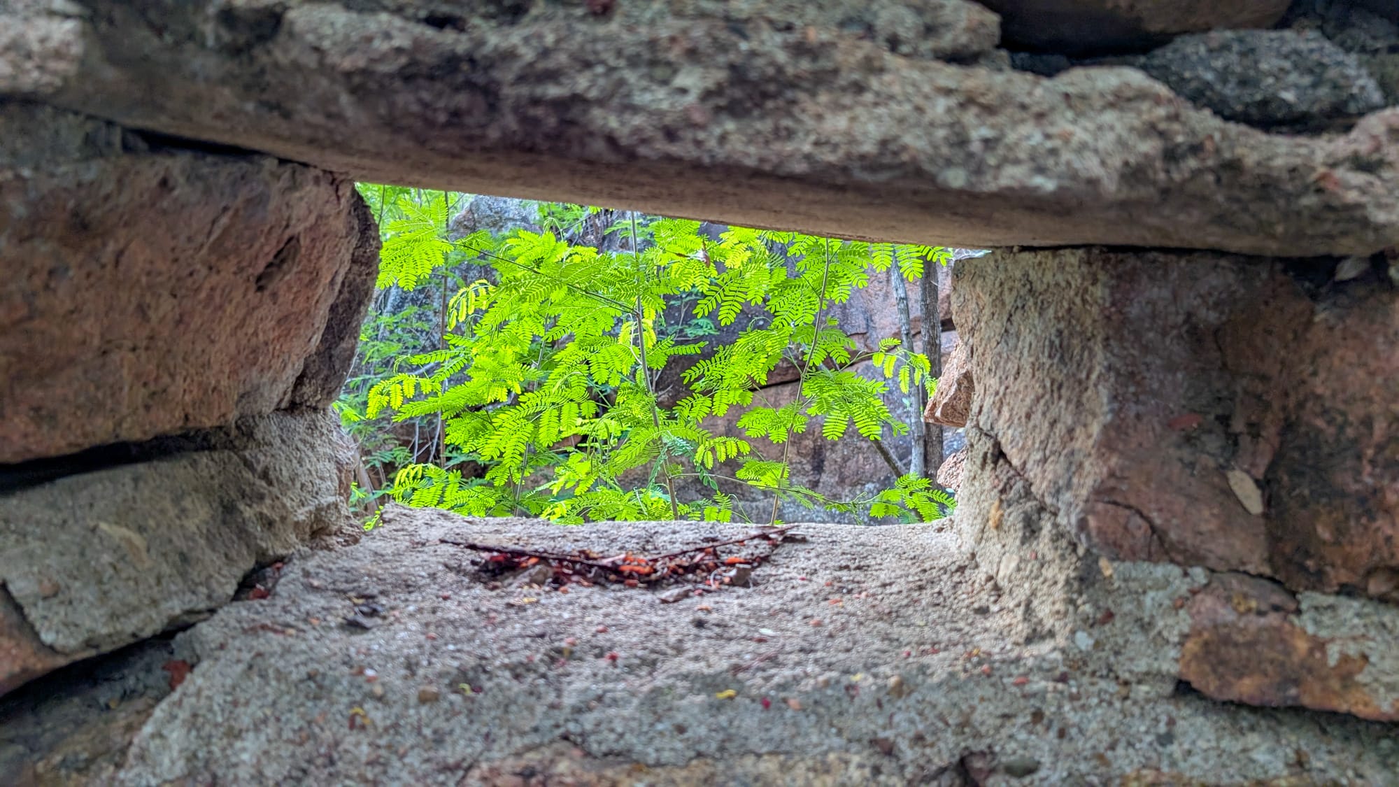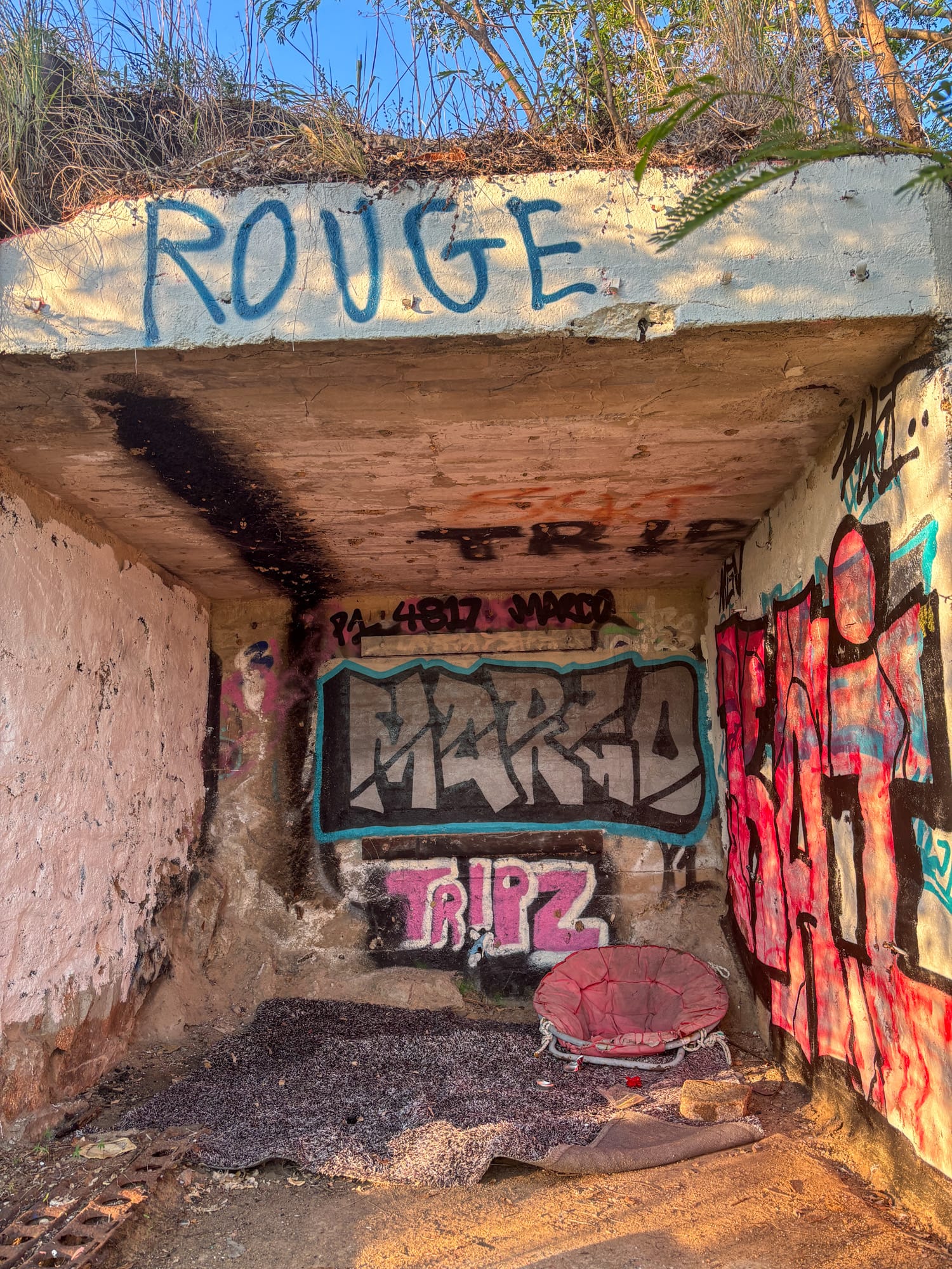 From the quarry edge, we took off-track pads down toward the Francis and Sidney Street gullies. The stone terraces and so-called gun-ports again proved popular, particularly as newer walkers compared wartime myths with the more mundane origin story: a pre-war residence with a pool wall, garden beds and quirky stonework.