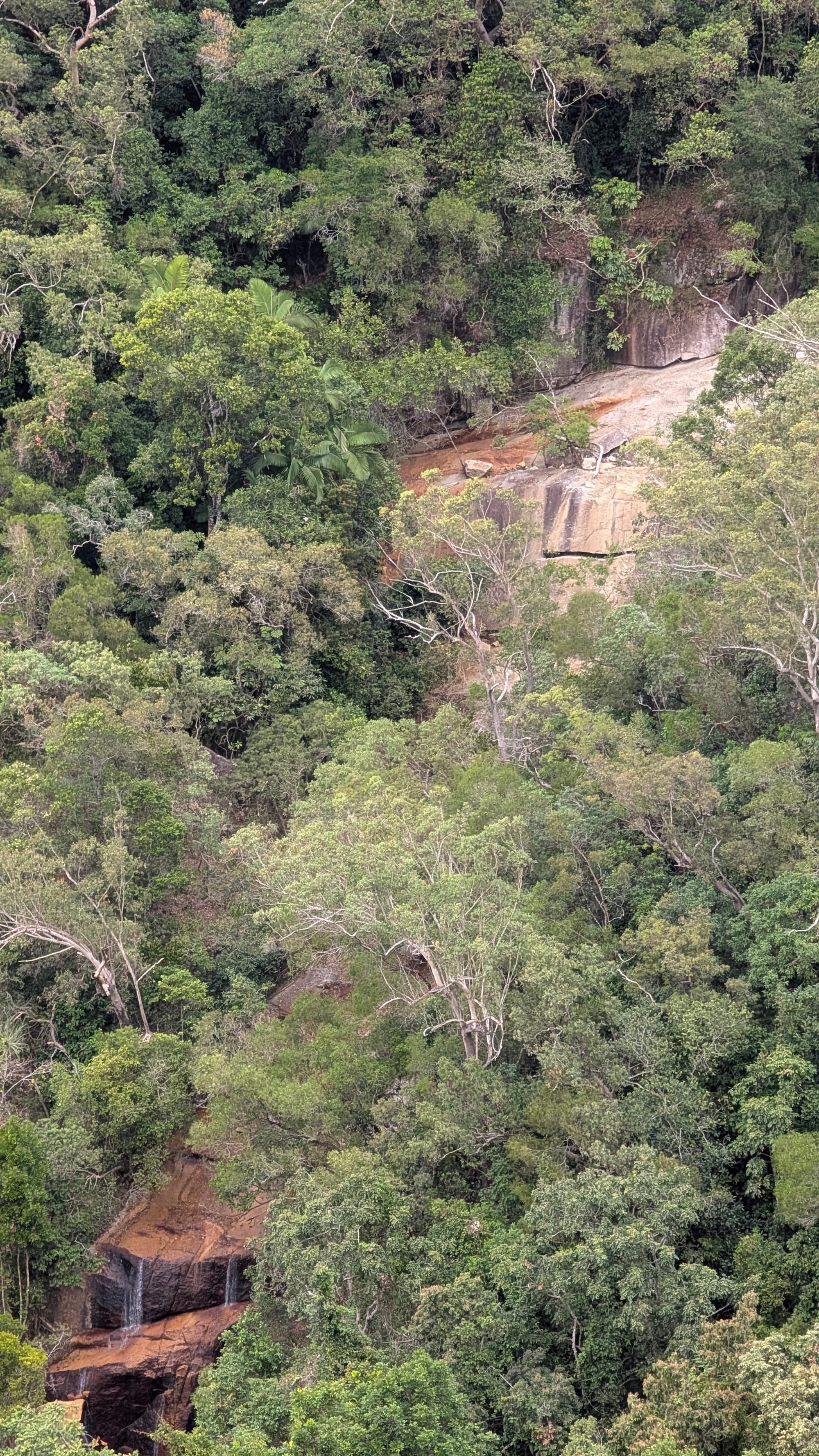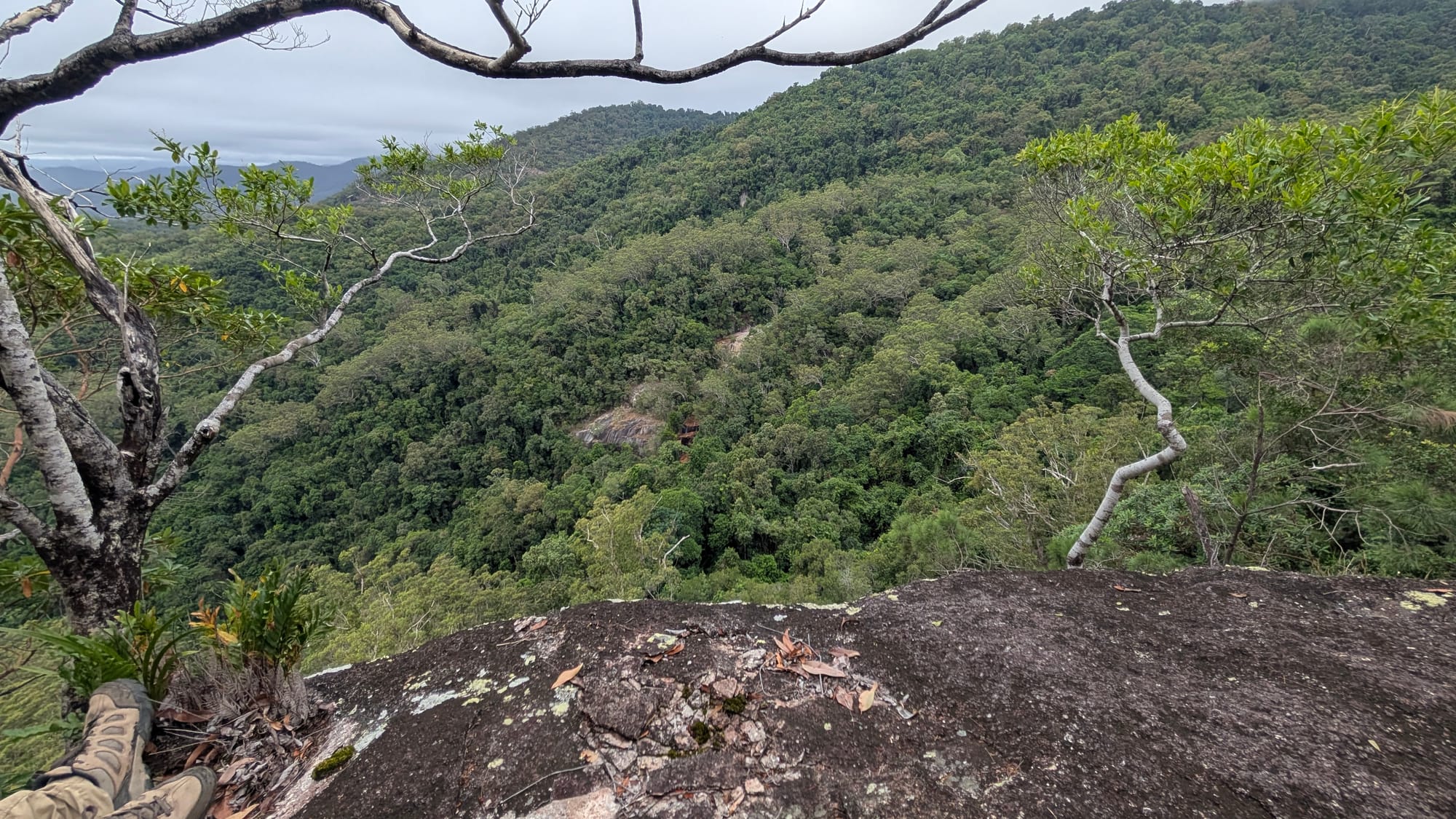 The morning climb warmed the legs, and at roughly 380 m elevation, we paused briefly at a small opening beside the track where a rocky platform offers glimpses through the trees. About 50 m further along, a better rocky lookout sits perched on a cliff edge, providing wide views across the rainforest-covered valleys of the Paluma Range and over to our destination. It was a perfect place to take a breather before leaving the security of the track and heading off into the forest.