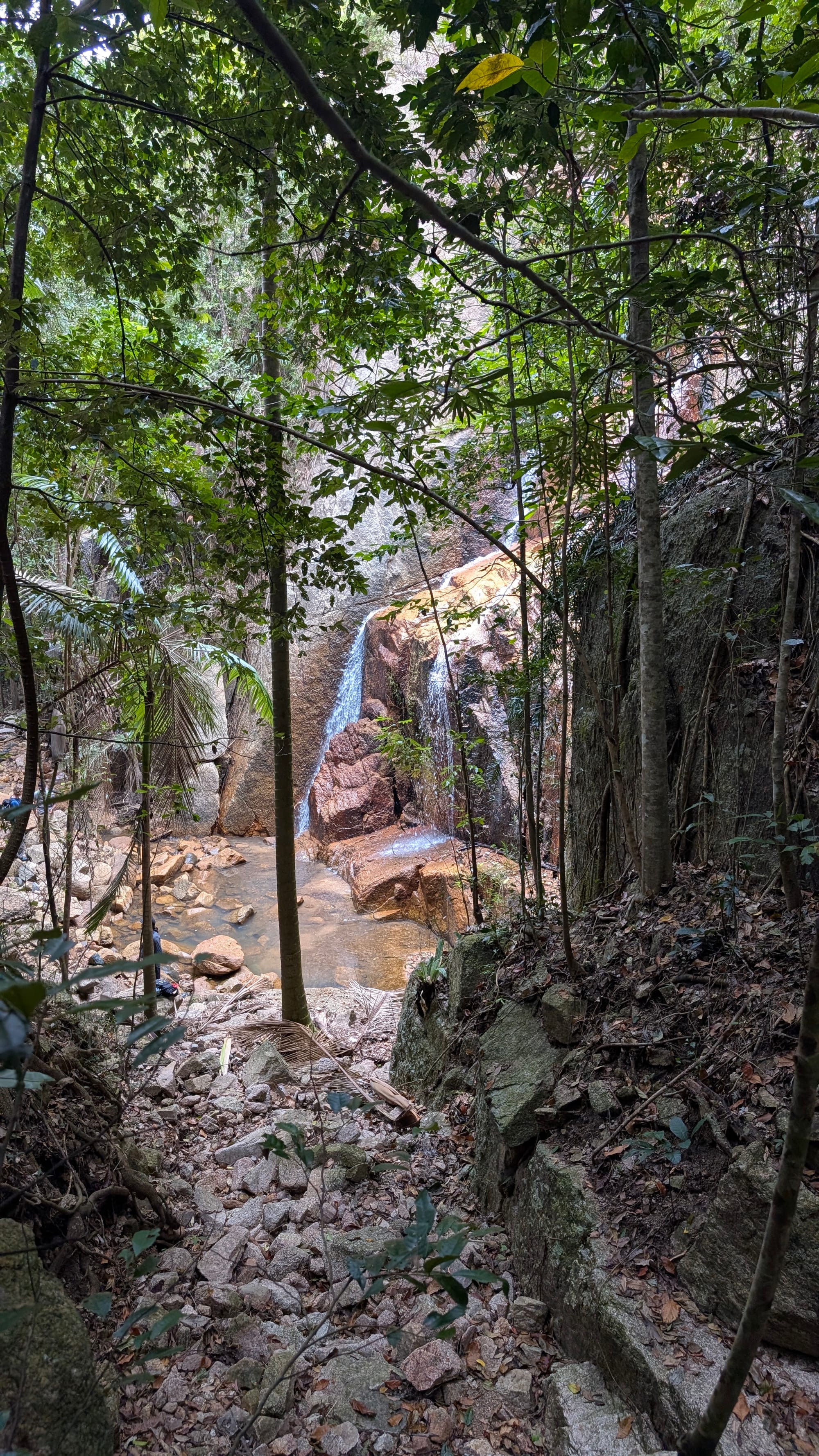 From the lookout area we dropped down a steep gully toward the creek below, navigating carefully through the dense rainforest and crossing a mostly dry creek bed before reaching the base of a striking waterfall. This fall, unofficially christened "Shower Falls" by fellow walk leader Madoc, spills down a steep granite face into a sheltered pool below. The name seemed fitting as the water fans out across the rock, creating a natural curtain of cool spray.