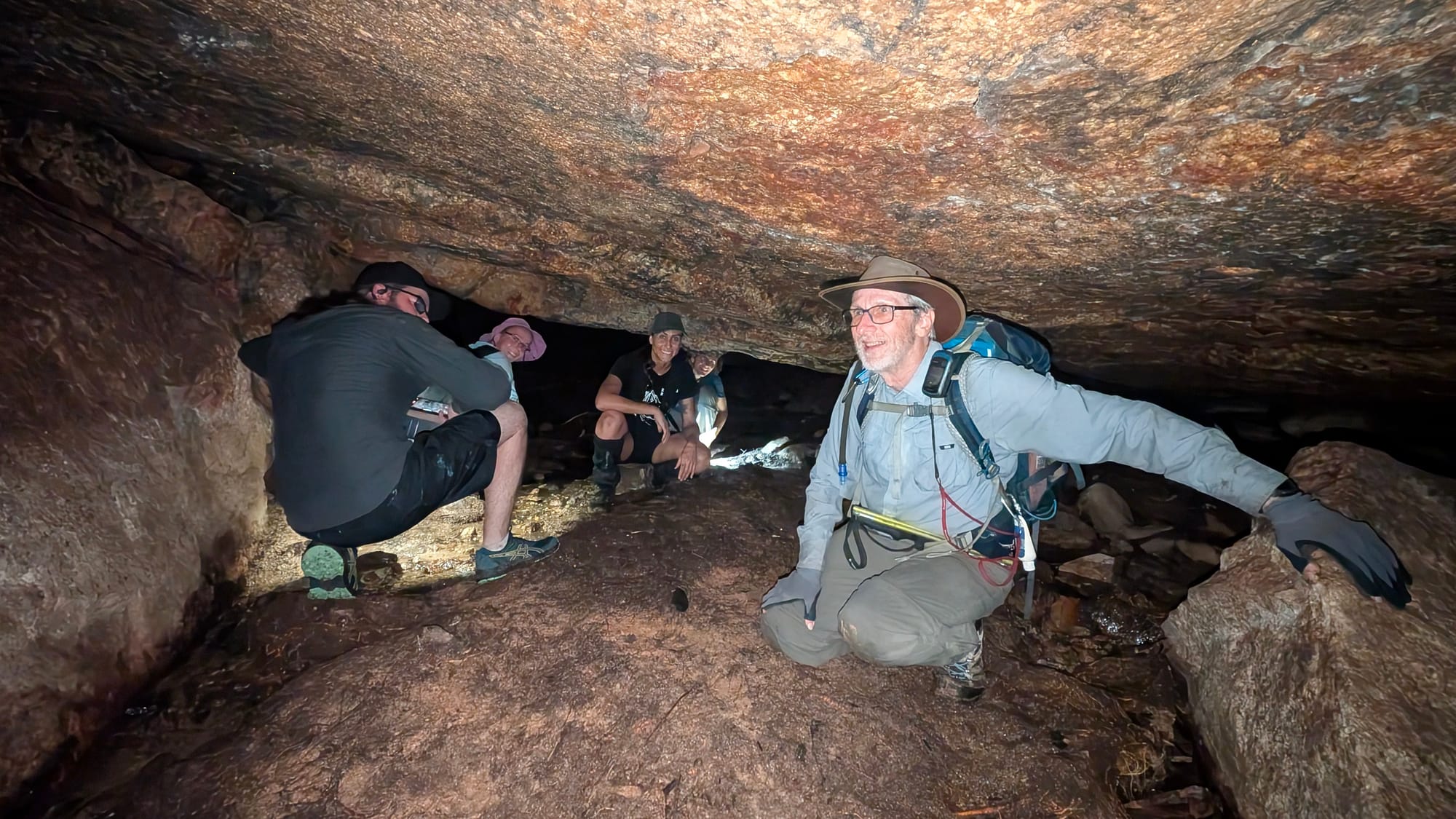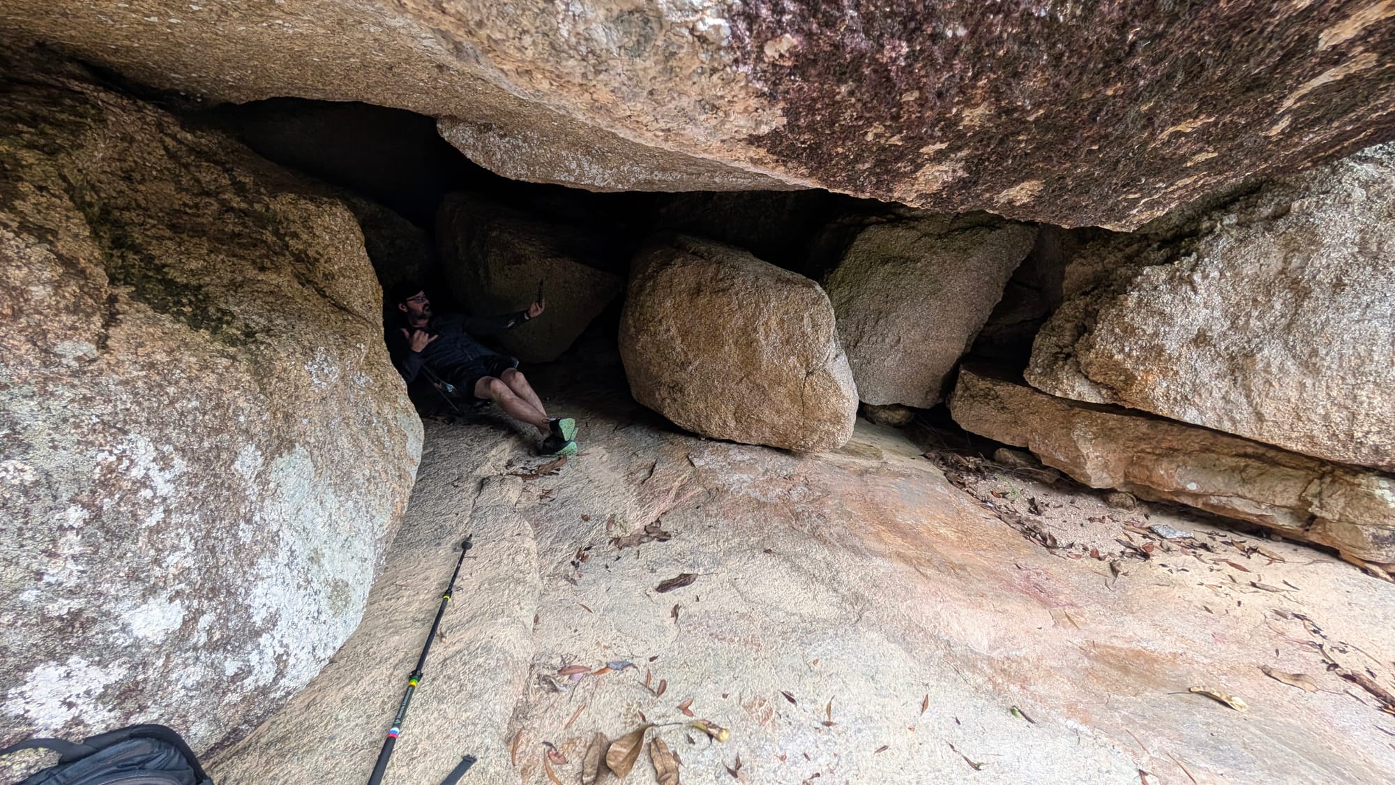 Continuing further up the creek, the terrain became more enclosed as large boulders began to dominate the stream bed. Before long we arrived at a substantial rock overhang formed by a massive granite boulder, creating a surprisingly spacious cave beneath. Inside, a very small colony of bats hung quietly from the rock ceiling, adding a sense of discovery to the exploration.