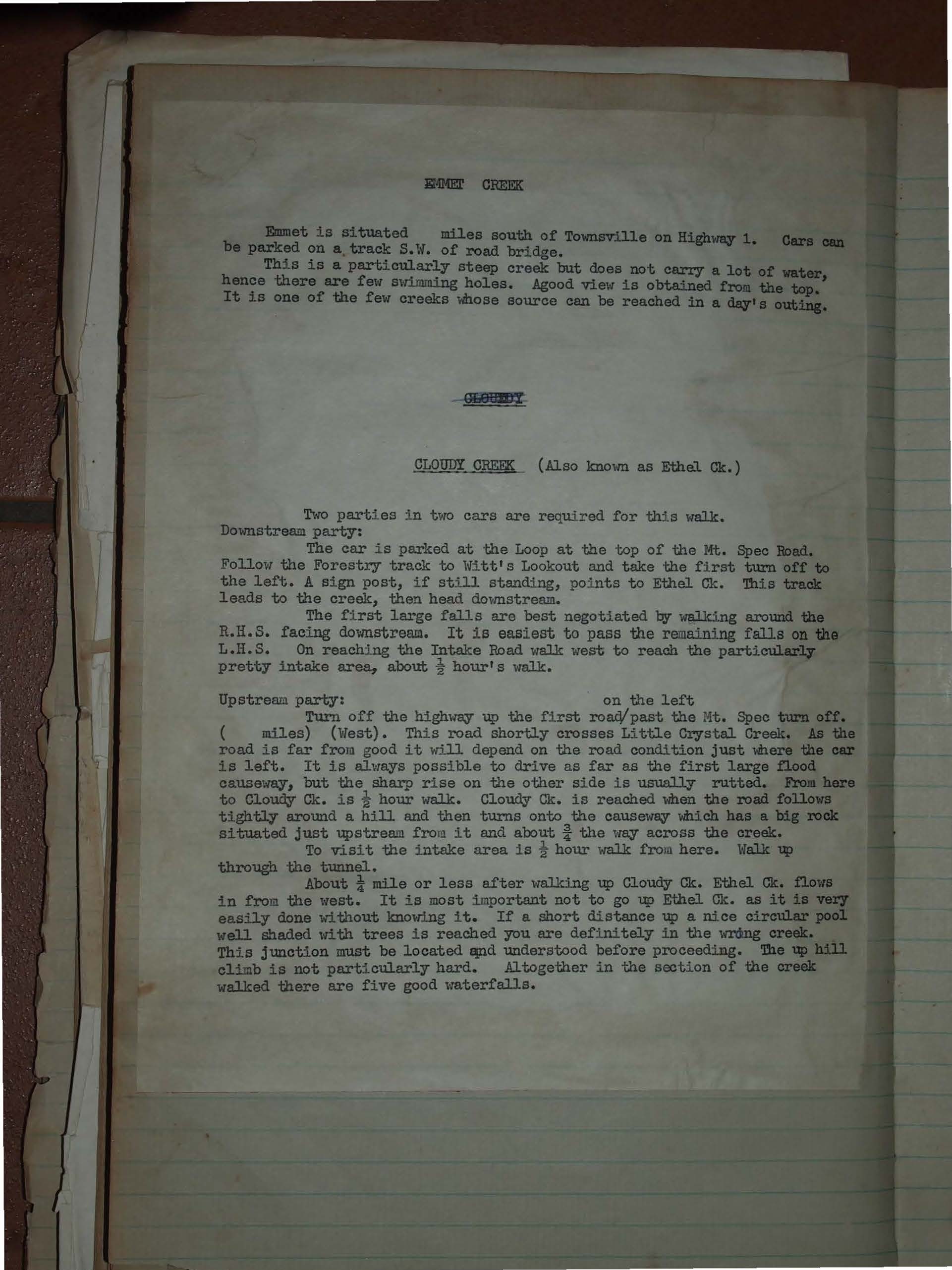 Turn off the highway up the first road on the left past the Mt. Spec turn off. (__ miles) (West). This road shortly crosses Little Crystal Creek. As the road is far from good it will depend on the road condition just where the car is left. It is always possible to drive as far as the first large flood causeway, but the sharp rise on the other side is usually rutted. From here to Cloudy Ck. is ½ hour walk. Cloudy Ck. is reached when the road follows tightly around a hill and then turns onto the causeway which has a big rock situated just upstream from it and about ¾ the way across the creek.