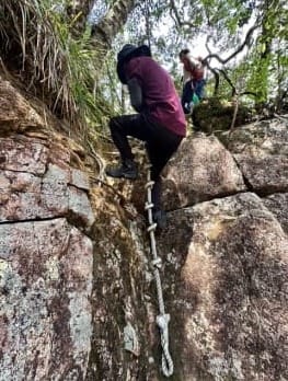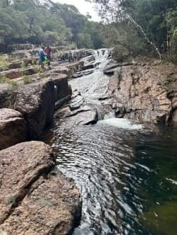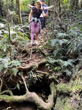 We set off for a rainforest bushwalk to Gold Creek Falls. Two creek crossings were easy. Arrived at the top of the main waterfall, then scrambled down using the rope to the main pool. One person braved a swim, lot of yelping (it is always cold that pool). A nice scenic spot.