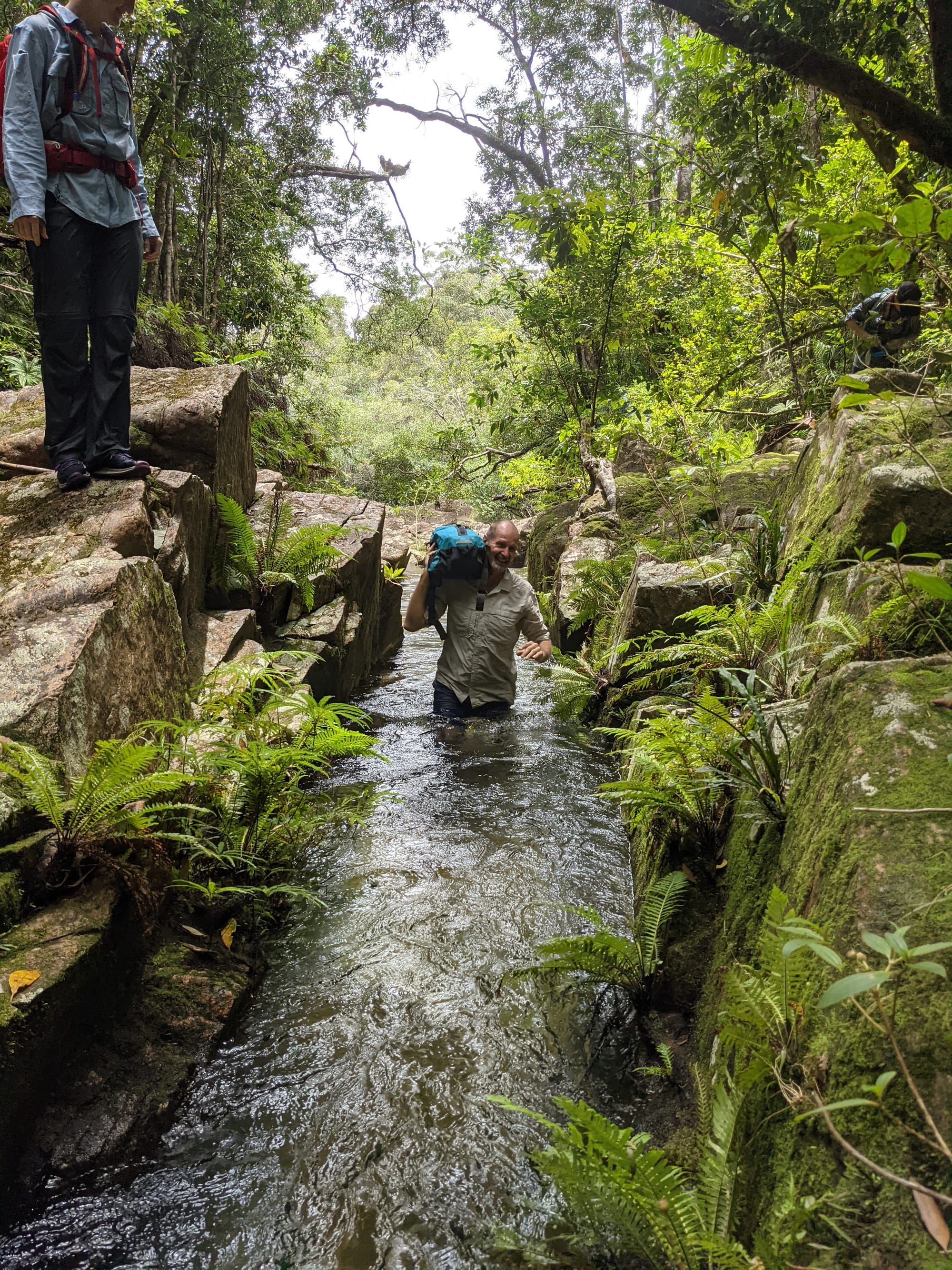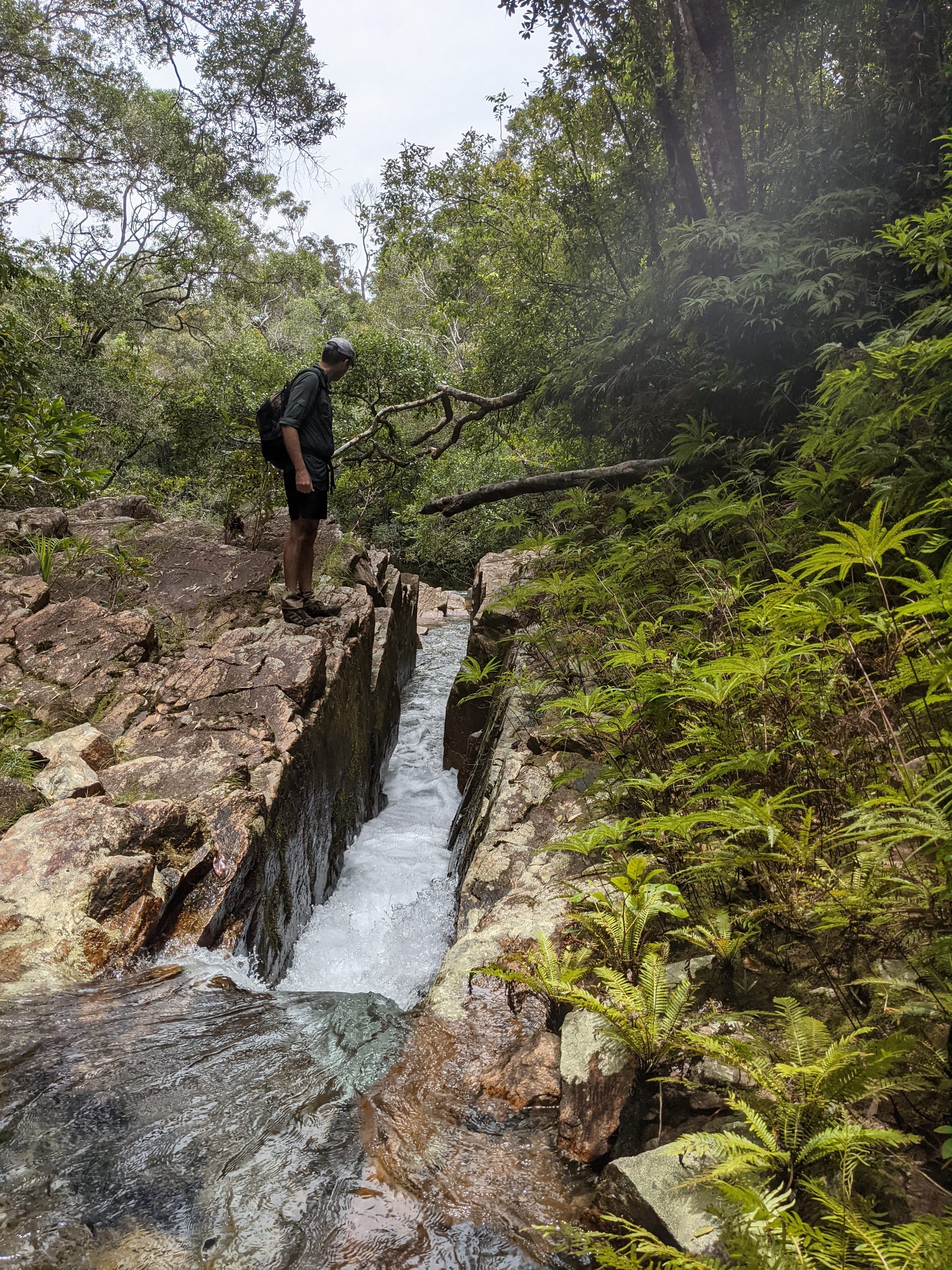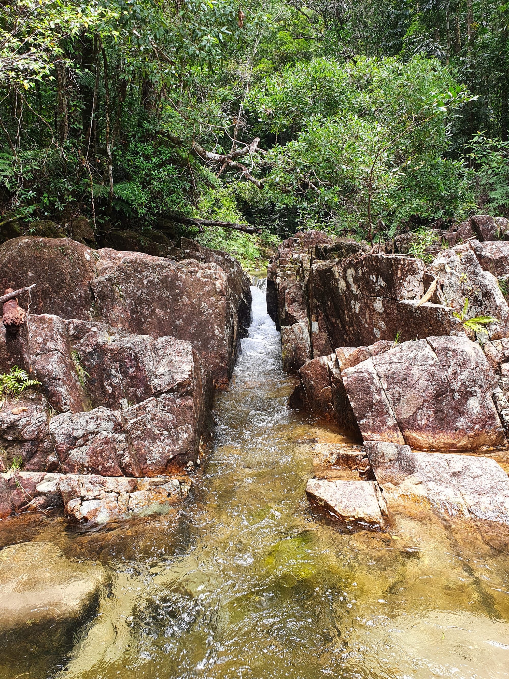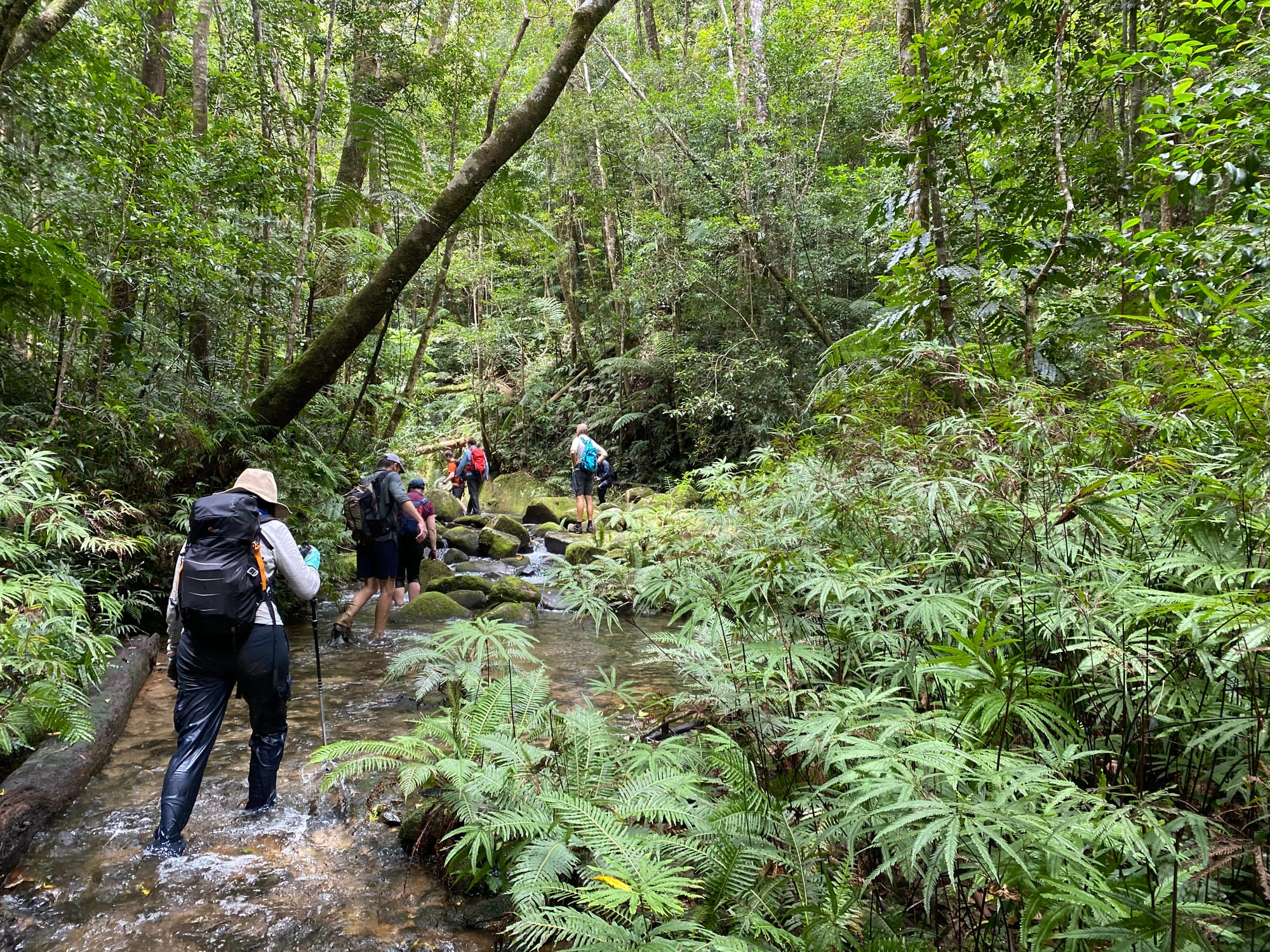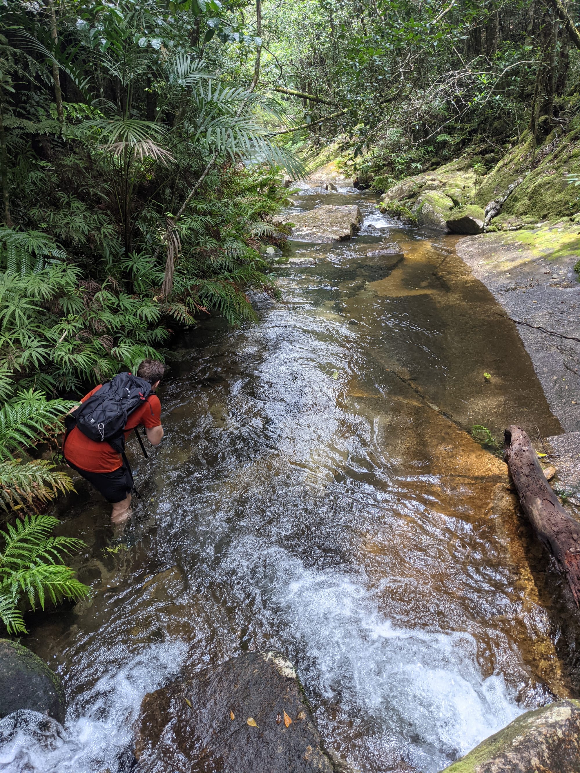 The rainforest here is lush and vibrant, with dense green foliage and towering trees shading the creek. The water was crystal clear, flowing gently over smooth stones and granite slabs. Before long, boots were wet and we settled into the rhythm of creek walking - wading through cool water, stepping between boulders, and occasionally scrambling along the banks. It did not take long before signs of the past began to appear.