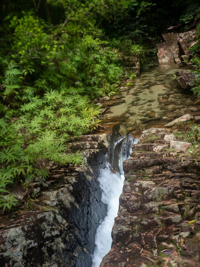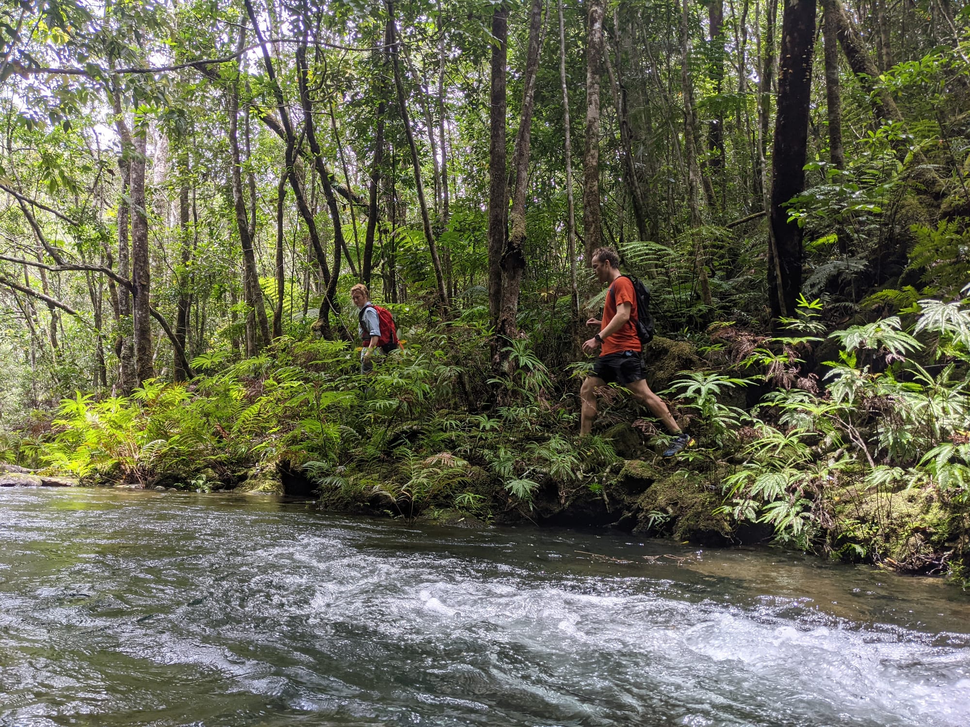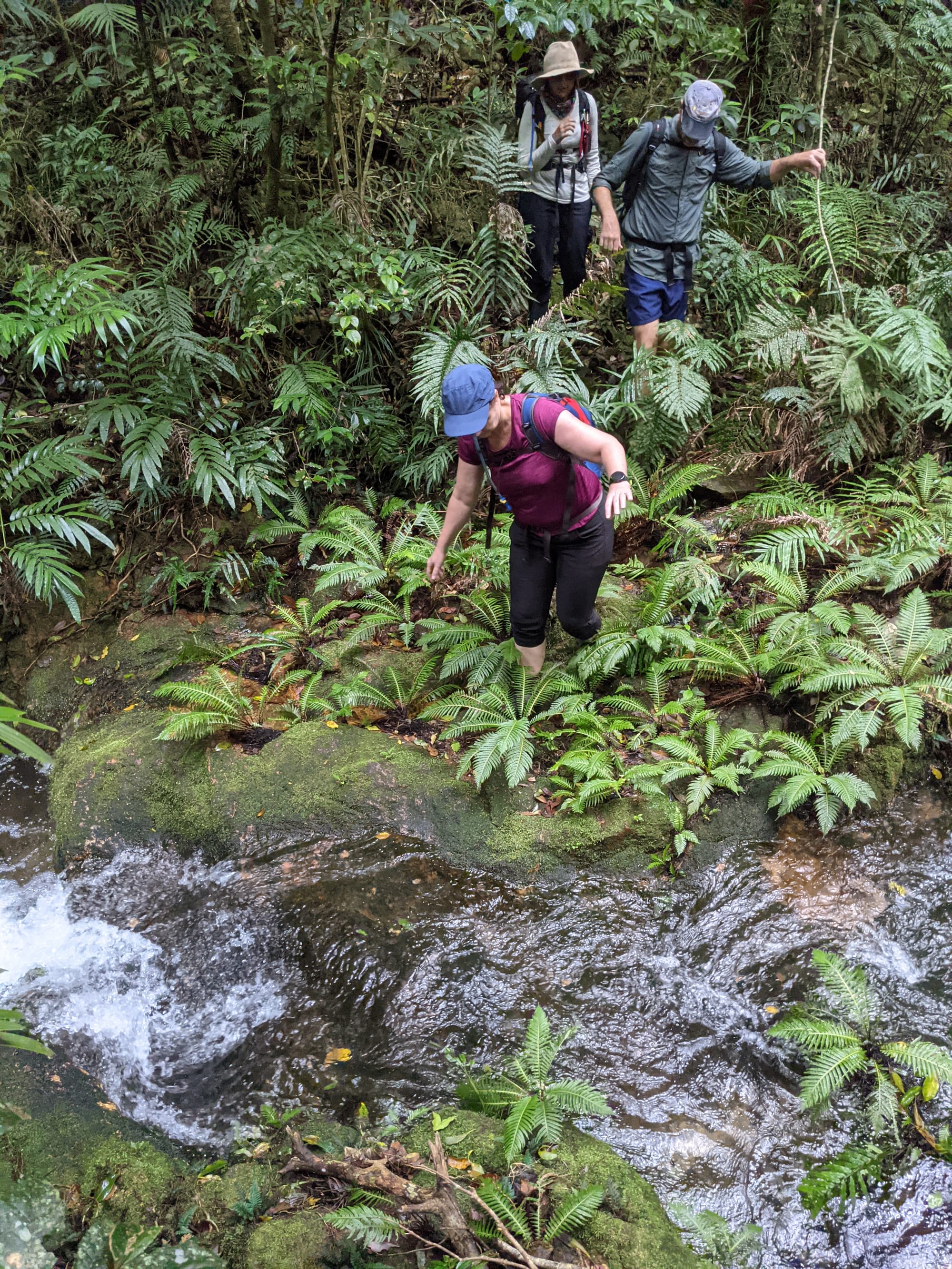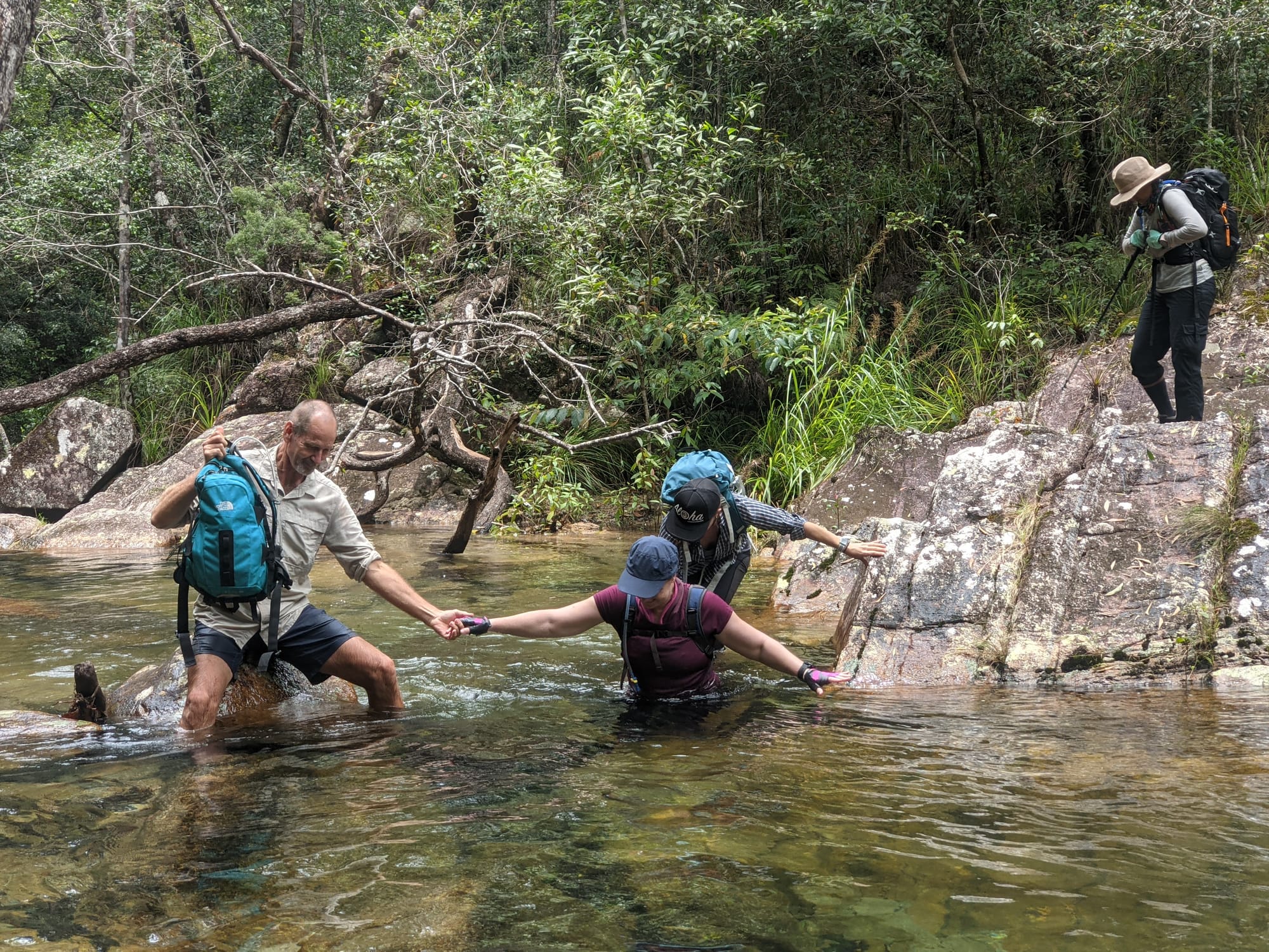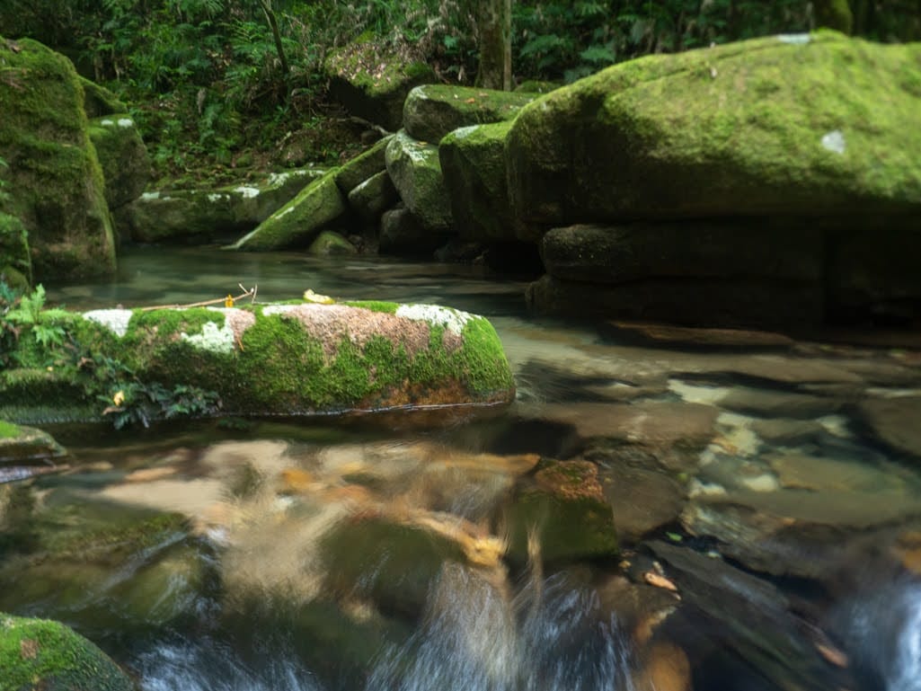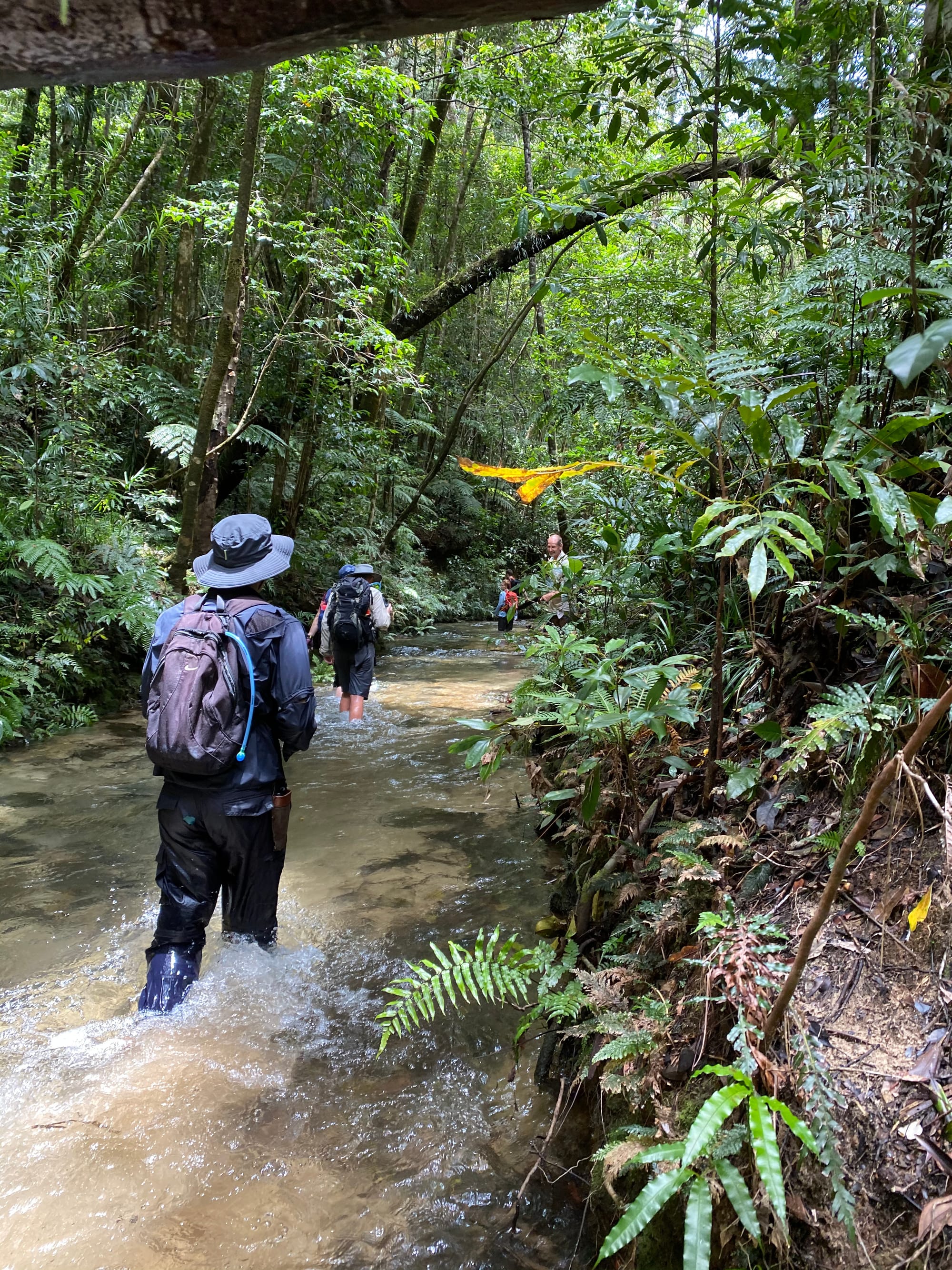 The rainforest here is lush and vibrant, with dense green foliage and towering trees shading the creek. The water was crystal clear, flowing gently over smooth stones and granite slabs. Before long, boots were wet and we settled into the rhythm of creek walking - wading through cool water, stepping between boulders, and occasionally scrambling along the banks. It did not take long before signs of the past began to appear.