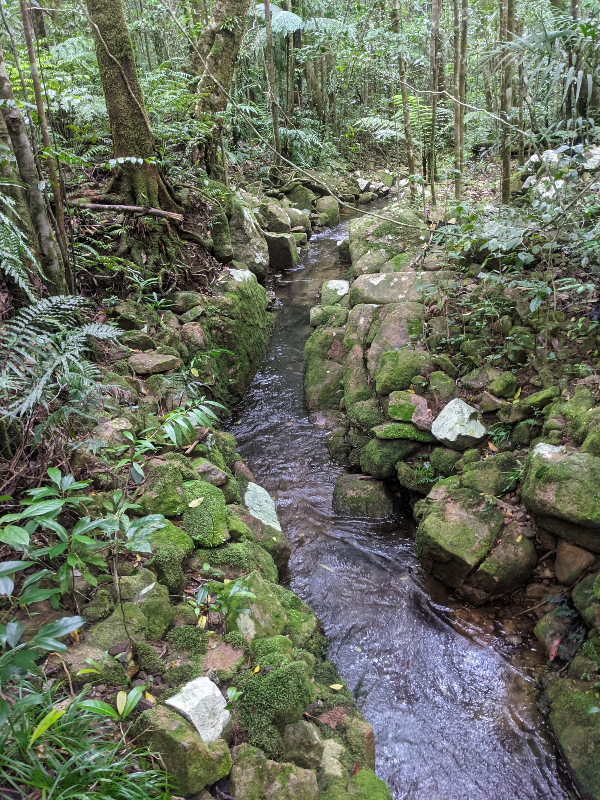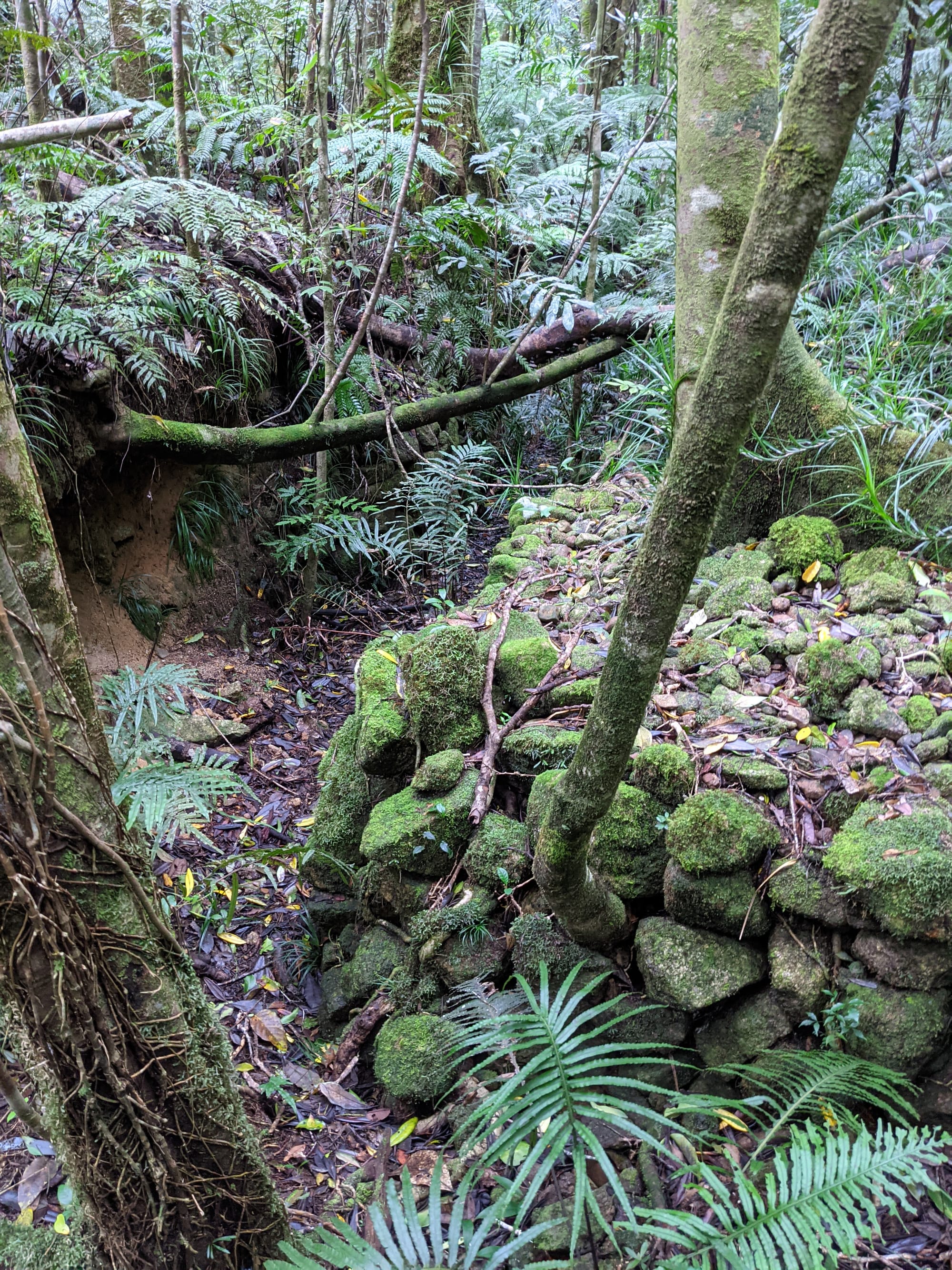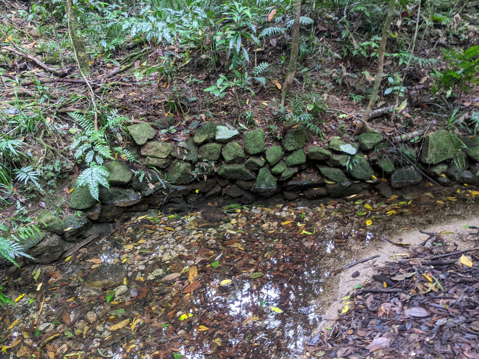 Along the creek we found old tin mining diggings and an impressive network of water races carved into the earth. These channels once directed water to wash away soil and expose tin deposits. In several places the miners had built surprisingly substantial stone walls, carefully stacked by hand. Standing there in the rainforest, it is hard not to imagine the sheer effort required to build these structures more than a century ago.