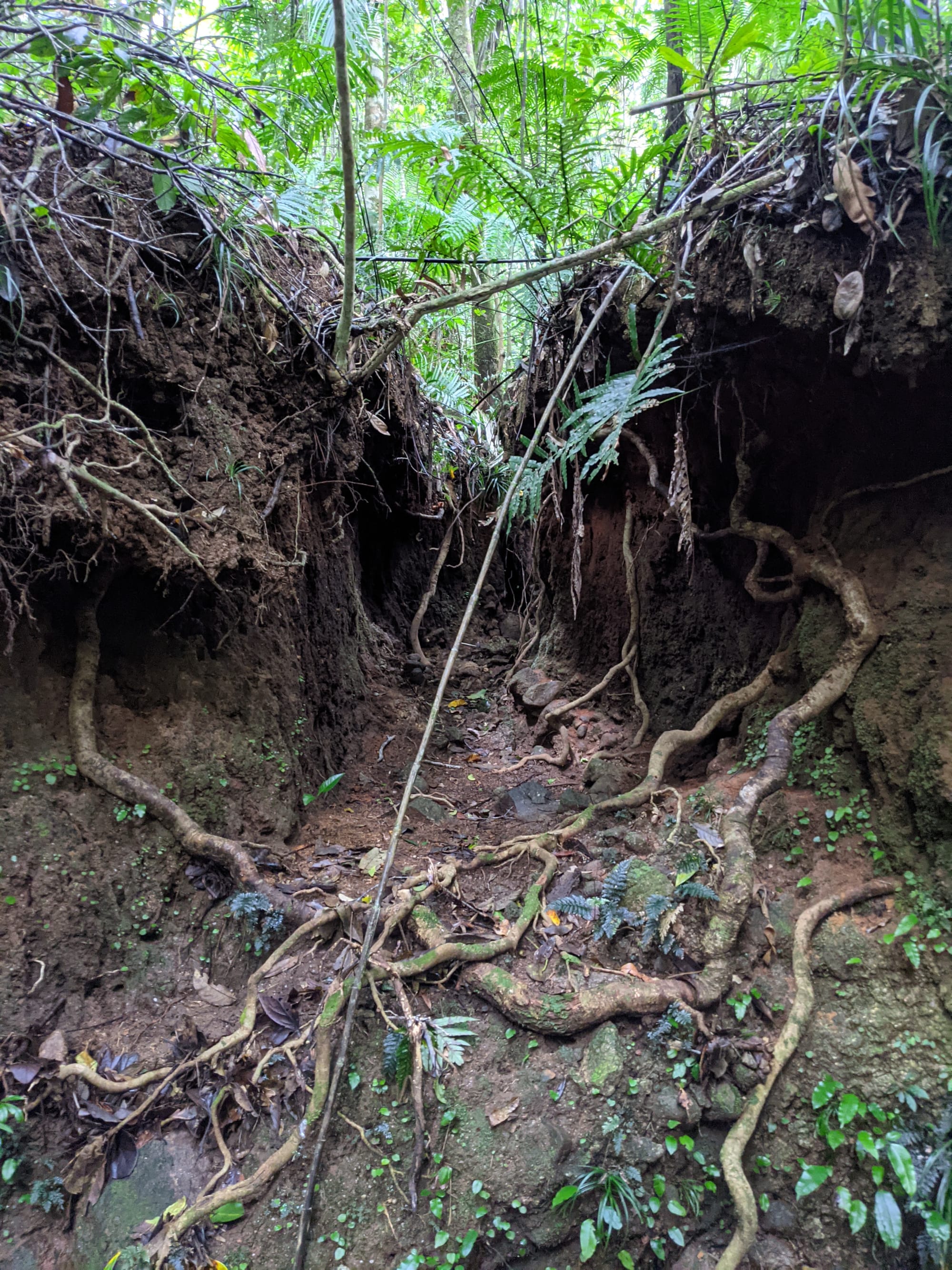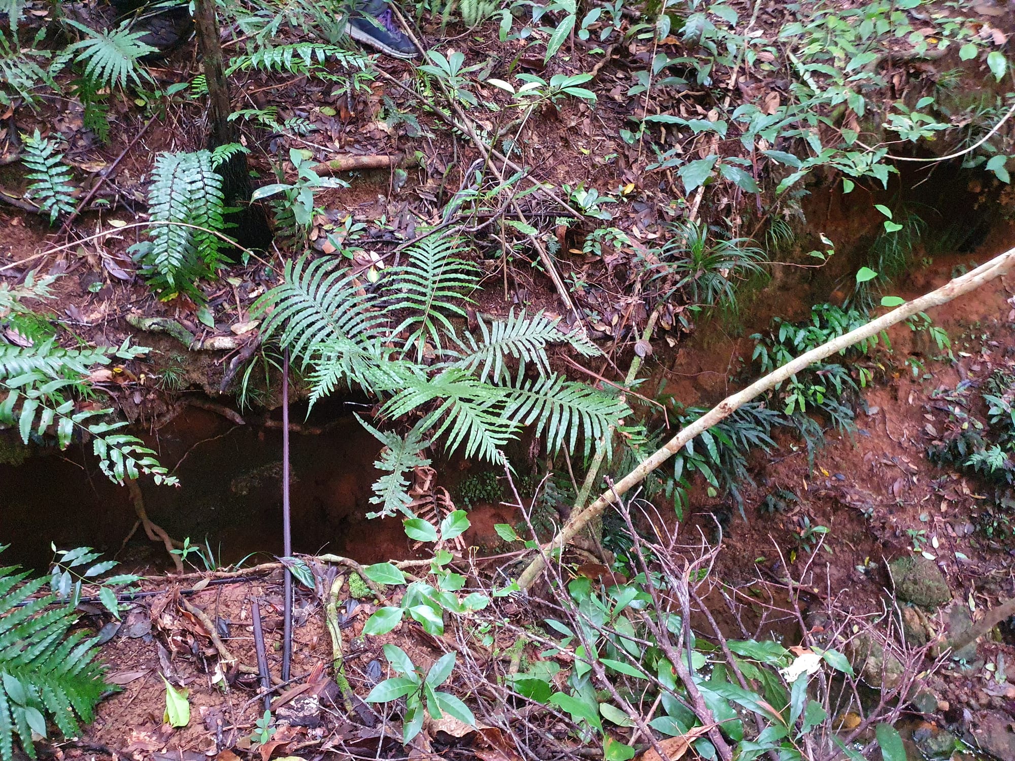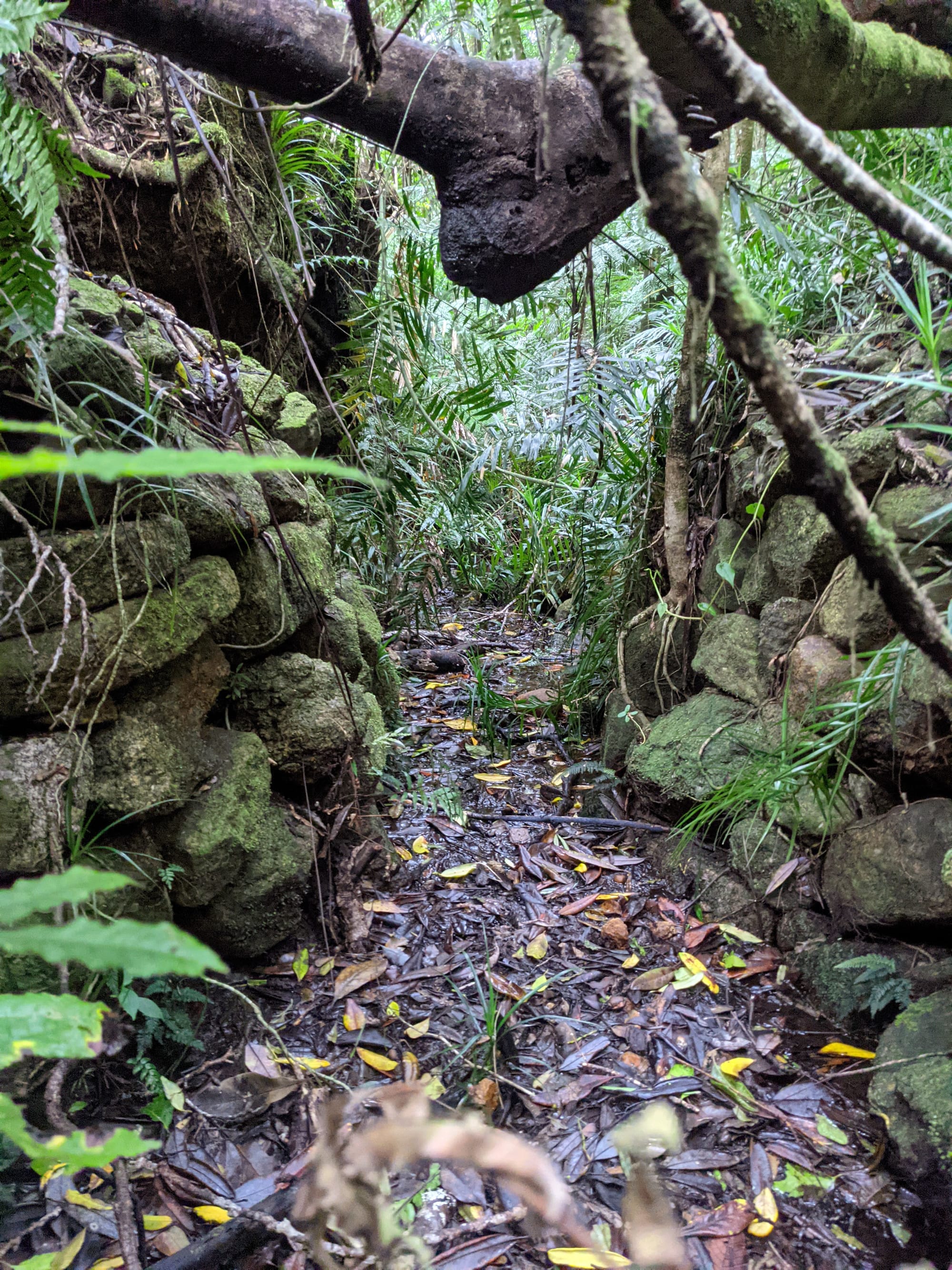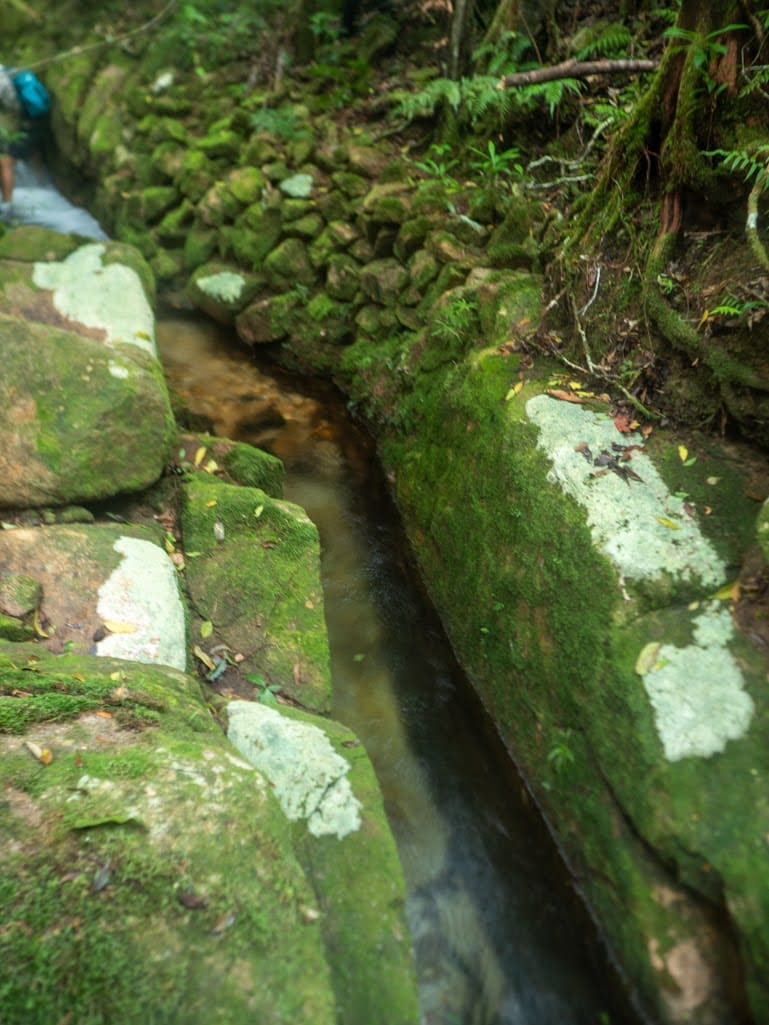 Along the creek we found old tin mining diggings and an impressive network of water races carved into the earth. These channels once directed water to wash away soil and expose tin deposits. In several places the miners had built surprisingly substantial stone walls, carefully stacked by hand. Standing there in the rainforest, it is hard not to imagine the sheer effort required to build these structures more than a century ago.