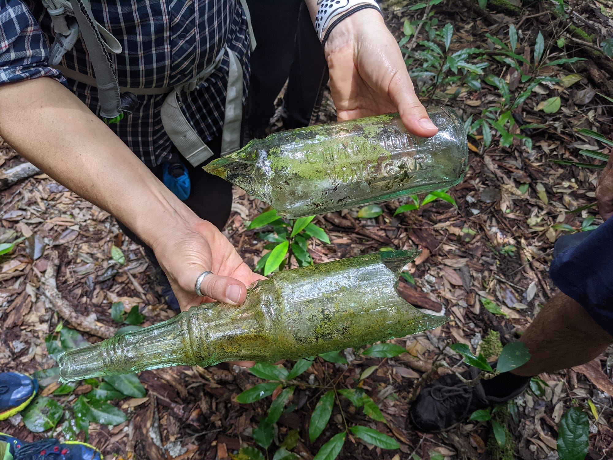 As we continued exploring the old mining area, more relics appeared. Among them was a broken glass vinegar bottle, once used by miners to help make bread in remote camps. Even small artefacts like this hint at the everyday lives of the people who once worked these creeks.