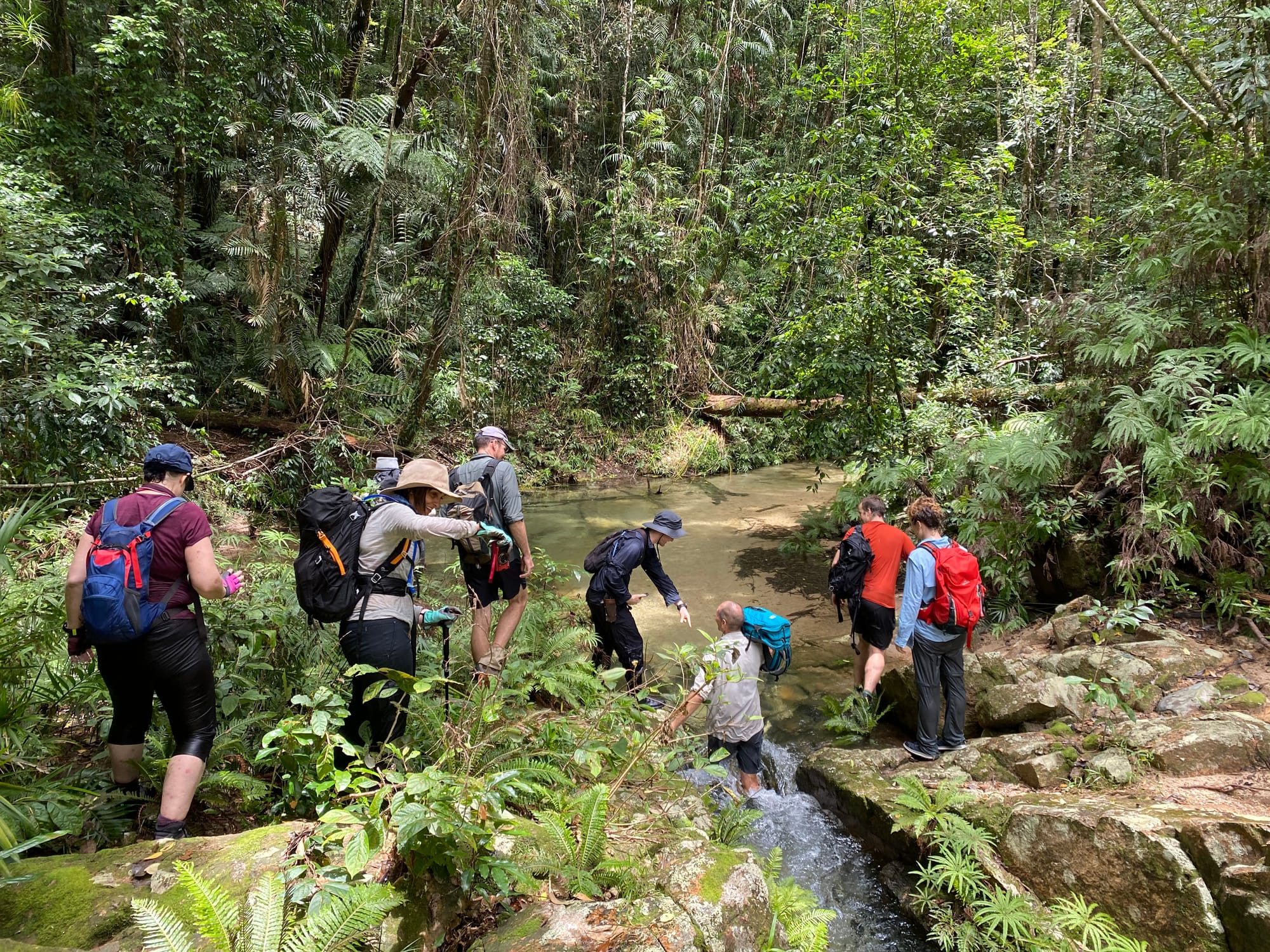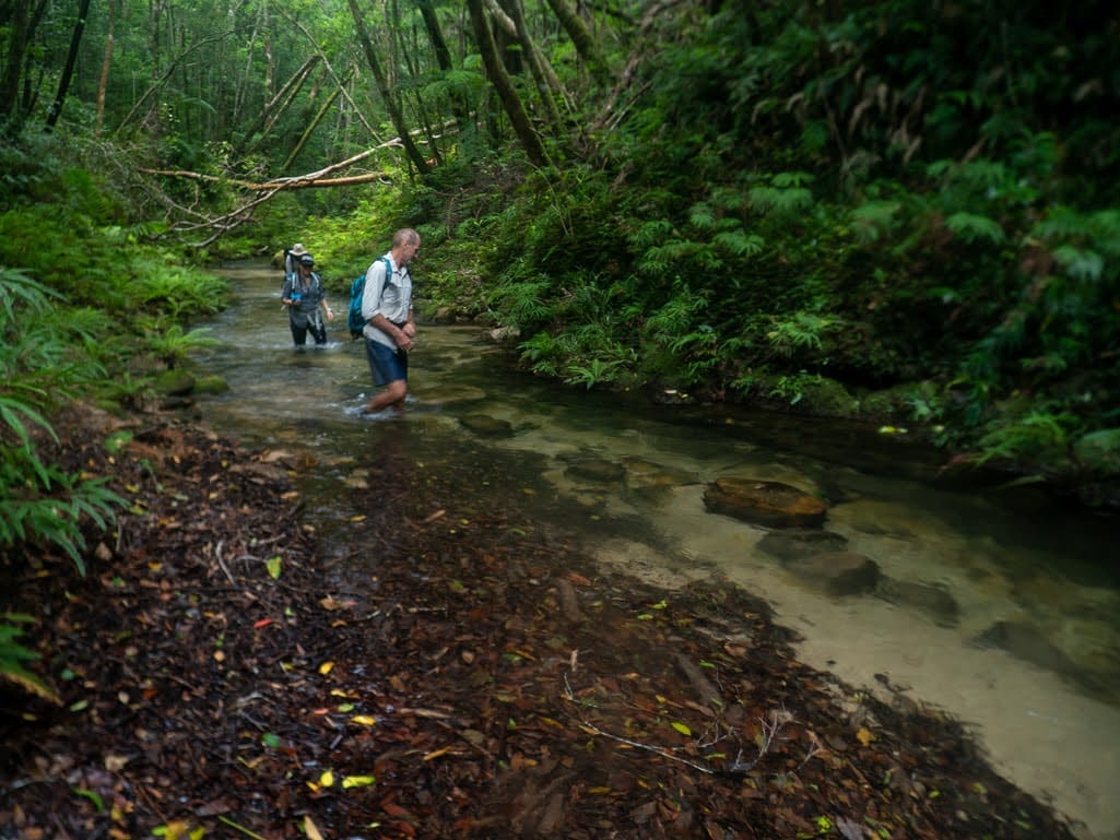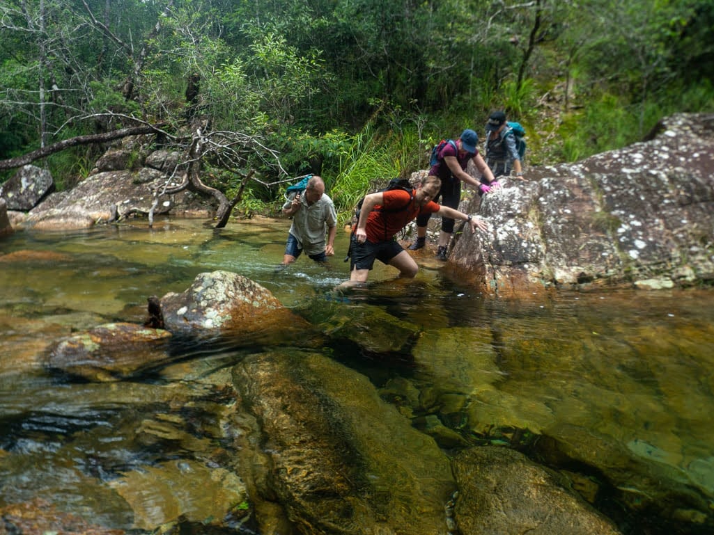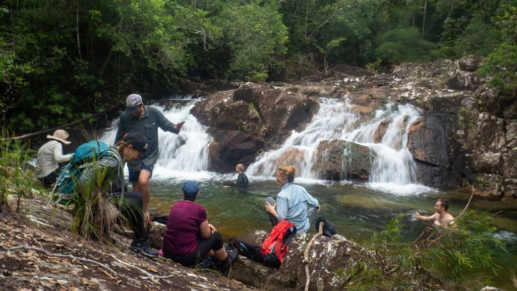 Explore Dolby Creek and upper Crystal Creek in Paluma Range National Park on this off-track rainforest adventure near Townsville. Wade through clear creeks, swim at Junction Spa Pools, and discover historic tin mining diggings, stone walls, and old artefacts.