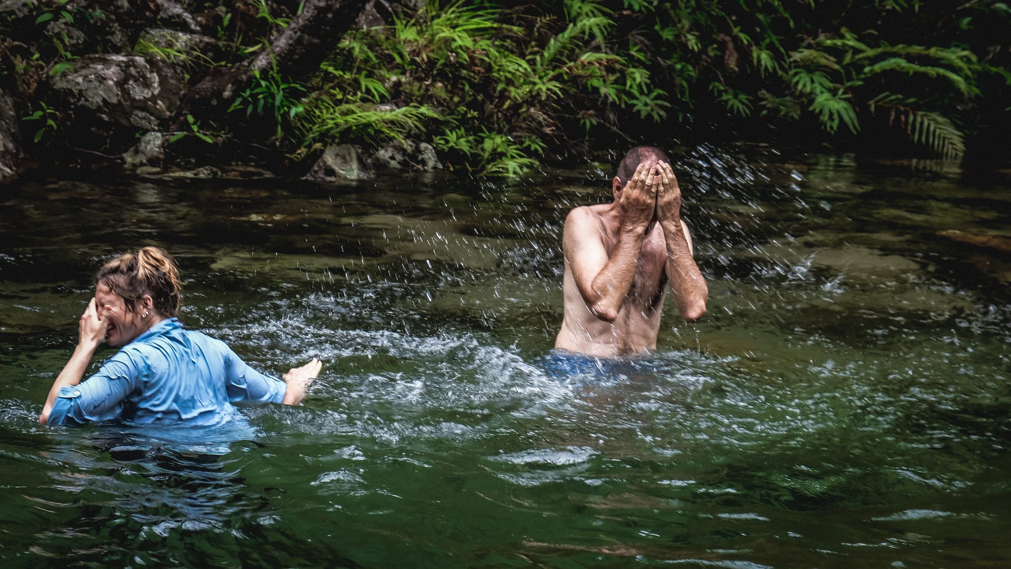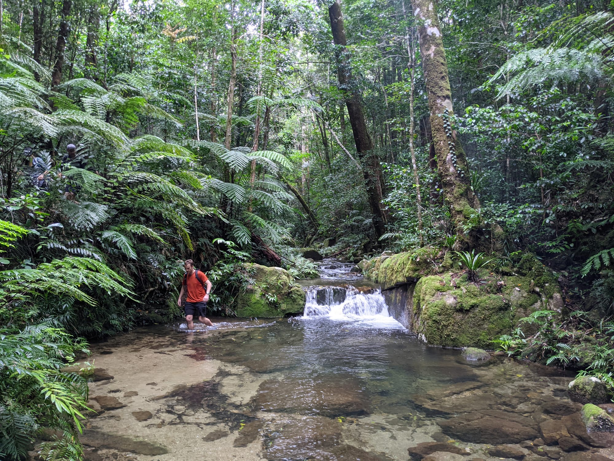 After lunch and a swim, we continued the loop by heading upstream along Crystal Creek. This section of the walk involved more wading and occasional swims through narrow rock sections and shallow channels. The creek here is incredibly clear, and the bright green moss and ferns clinging to the rocks make the entire place feel alive.