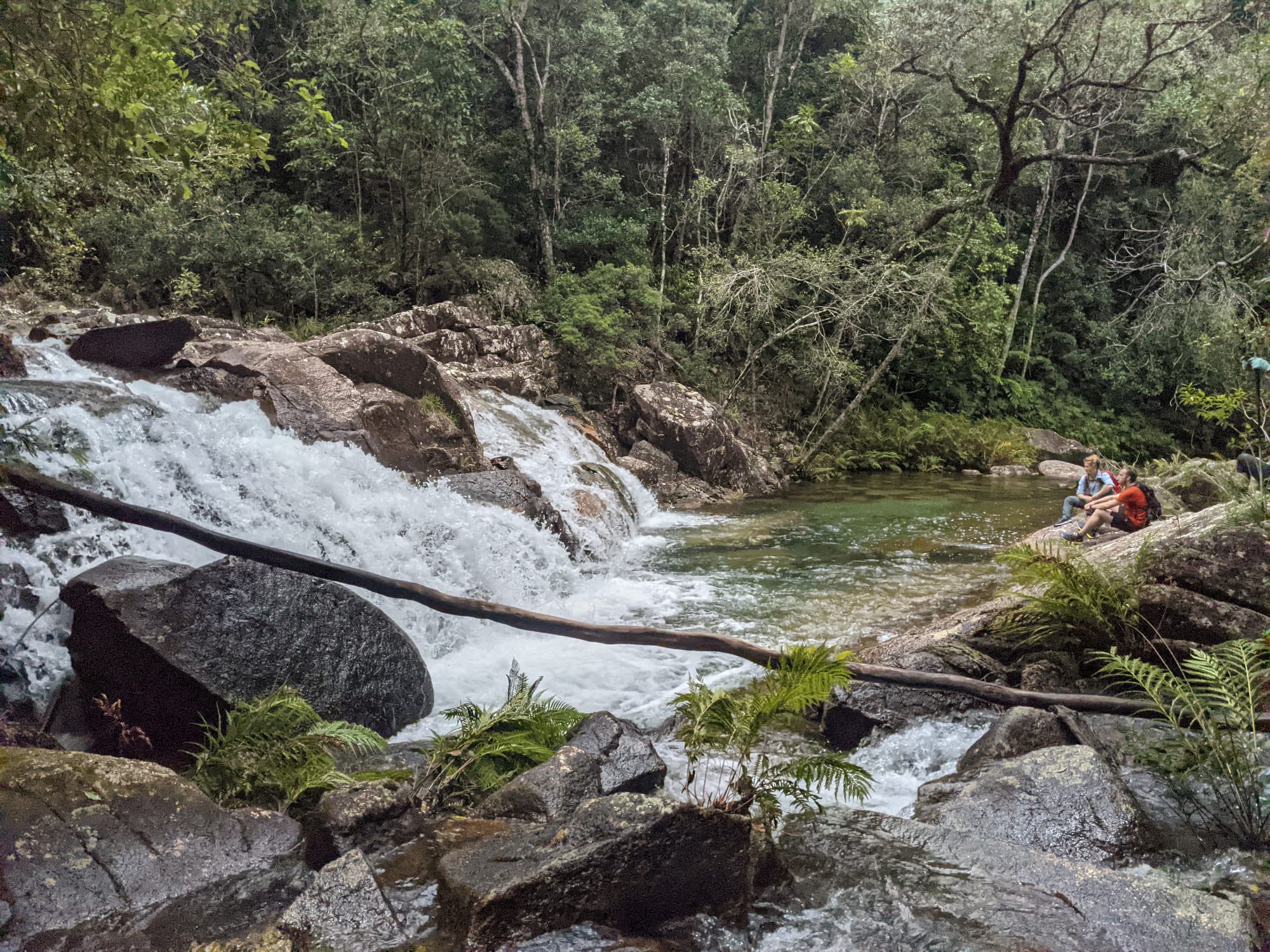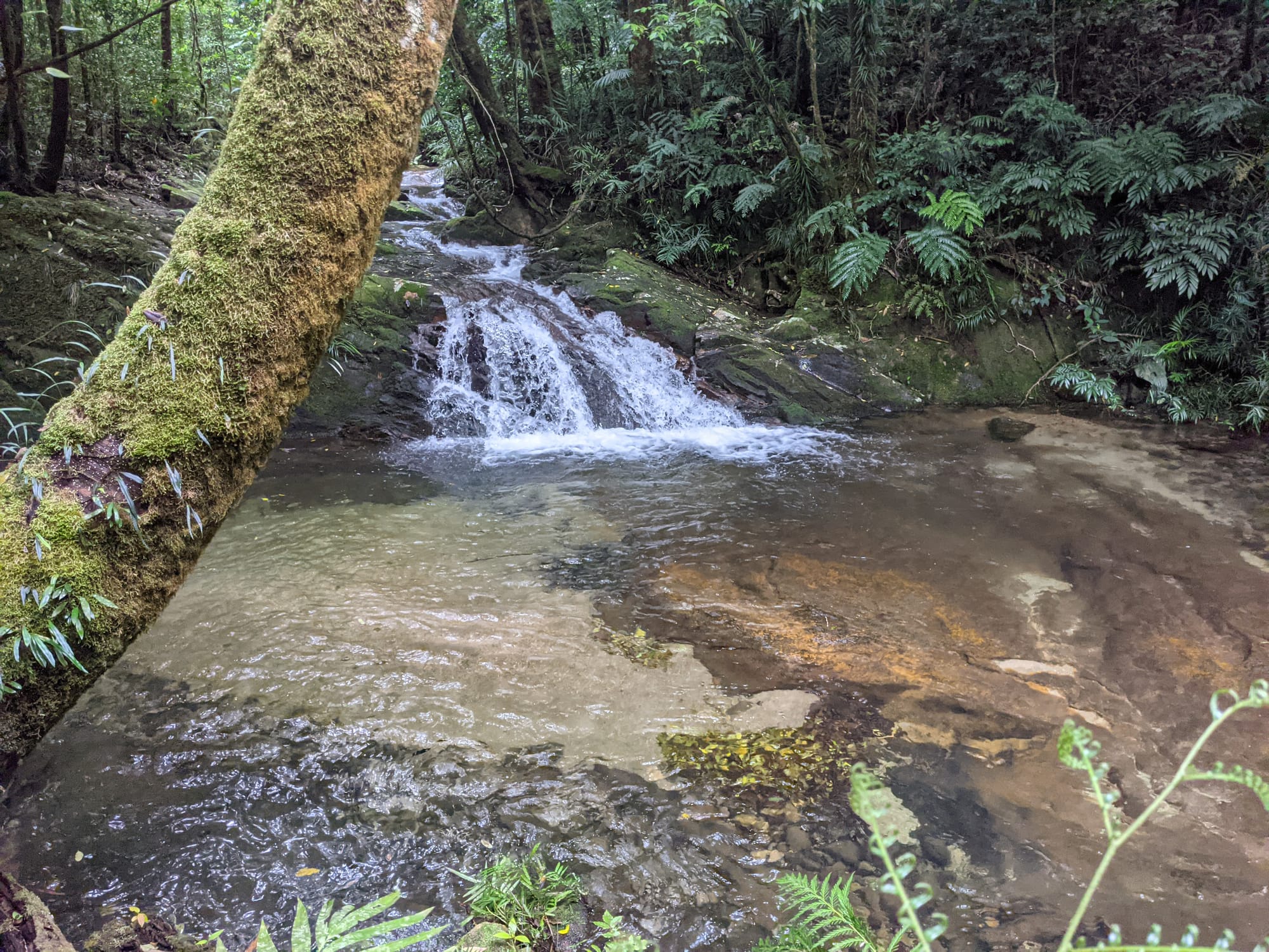 Here the two creeks meet beneath a lovely cascade spilling into a deep, clear pool. The water was irresistible. Packs were dropped and before long several of us were swimming in the cool, refreshing water, enjoying the natural spa-like setting surrounded by rainforest.