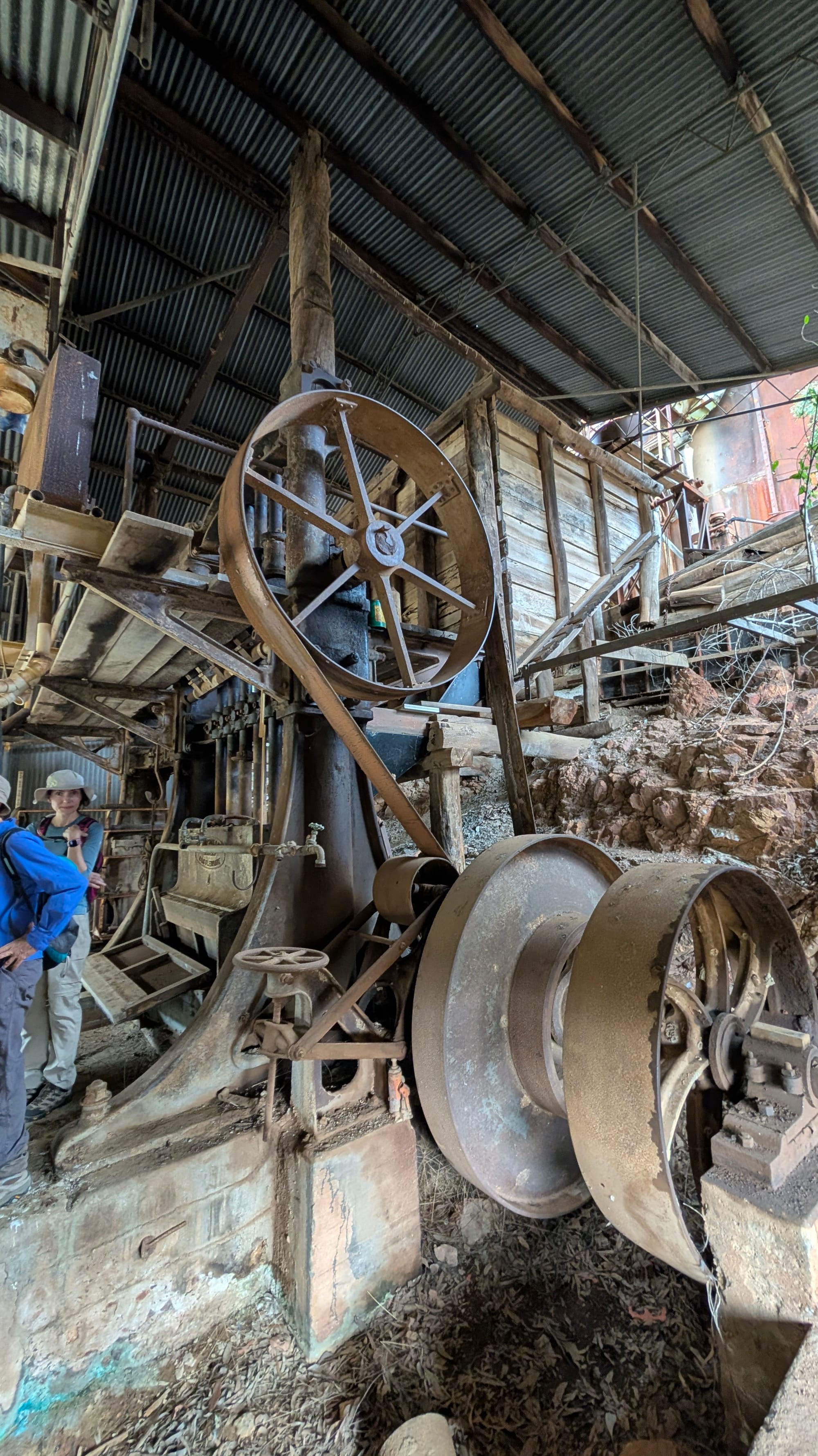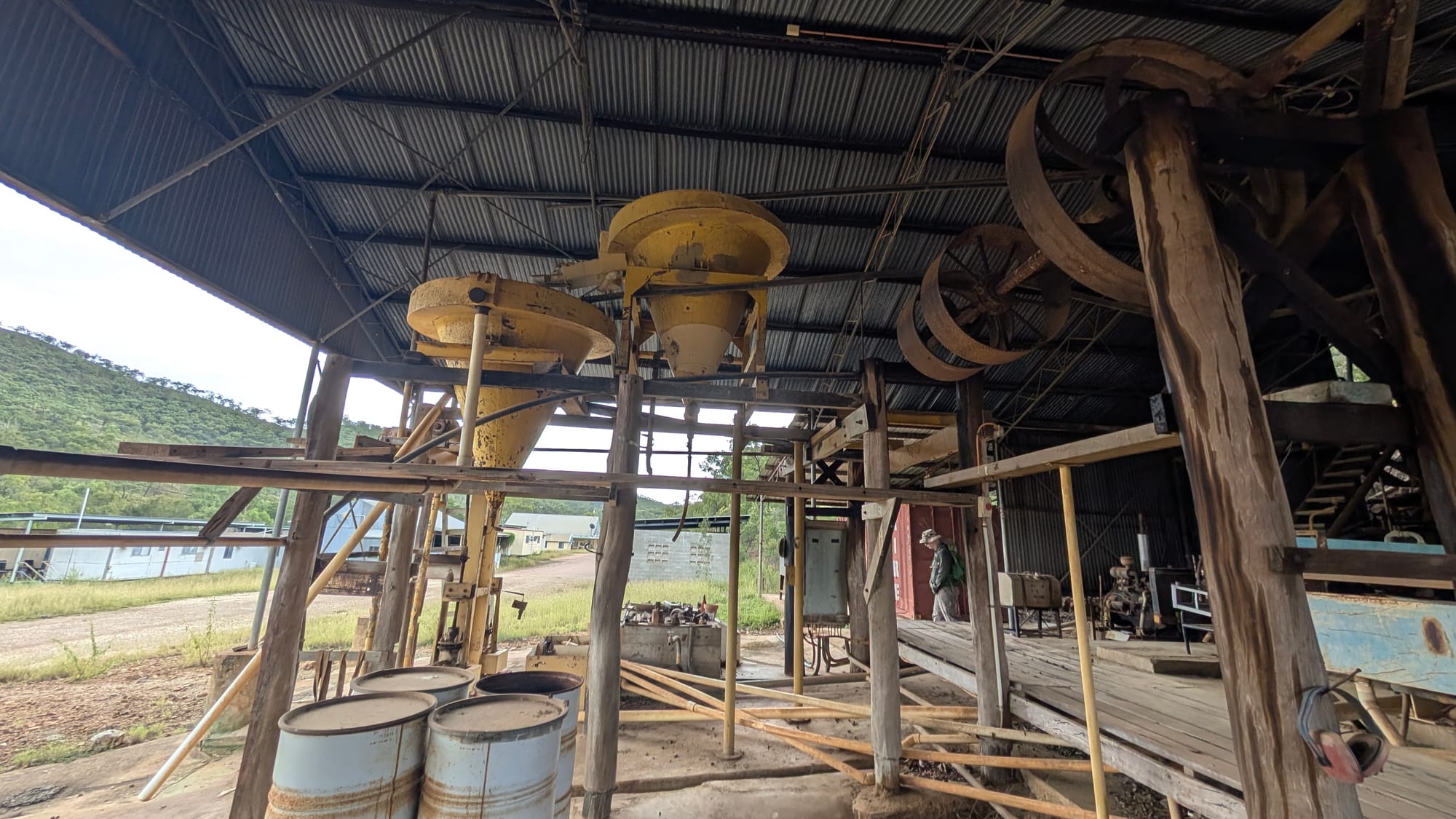 Not long after, we reached a larger creek and decided this would be our camp for the first night. Once camp was set, we headed off on foot to a fairly recently restored historic battery. It was a real highlight of the trip and fascinating to see such a site brought back to life, giving us a much clearer sense of how these batteries once worked. Around the site were very colourful blue and green crushed ore (probably due to oxidation reaction), rusty relics, and plenty to inspect and talk about.