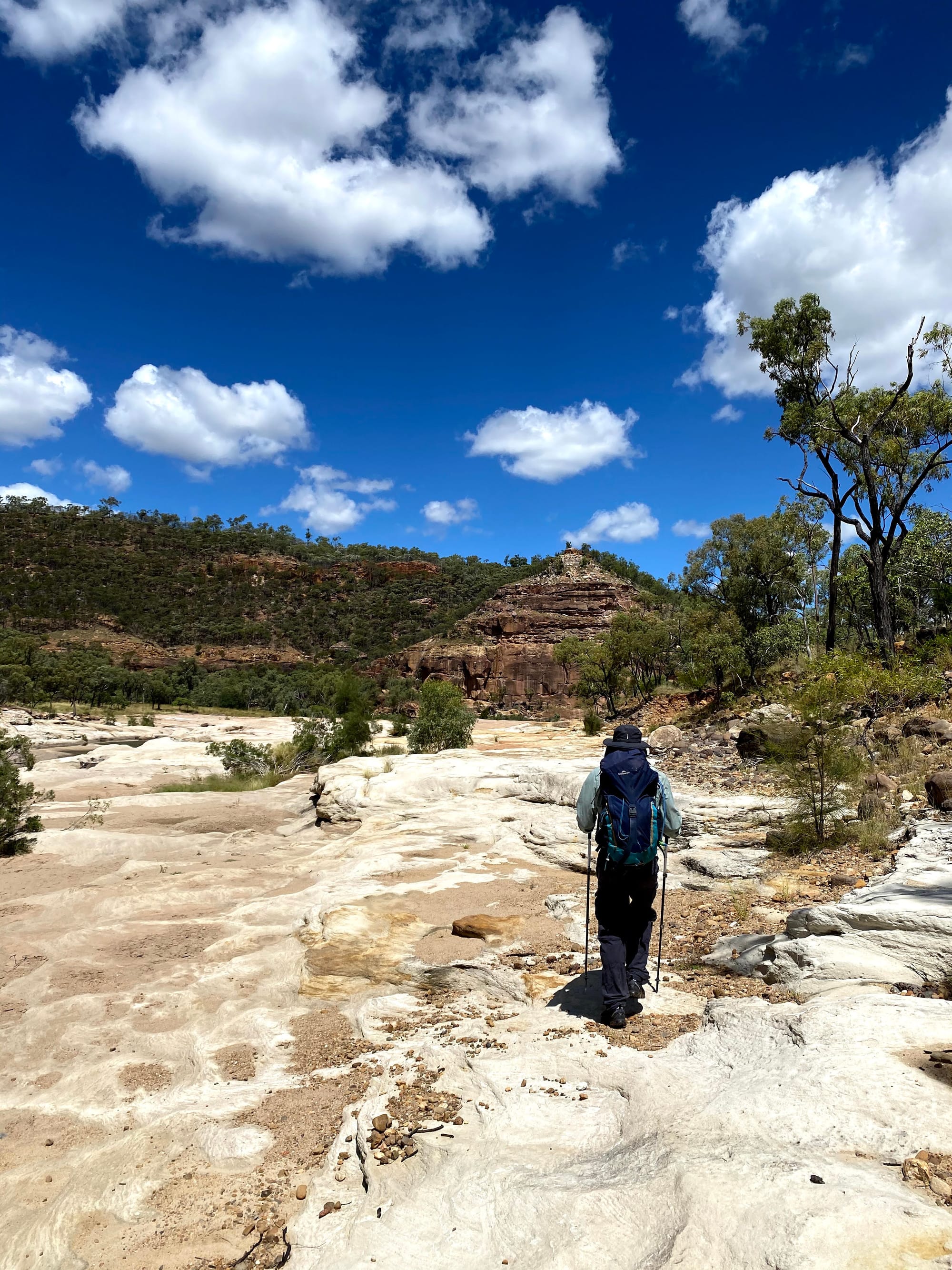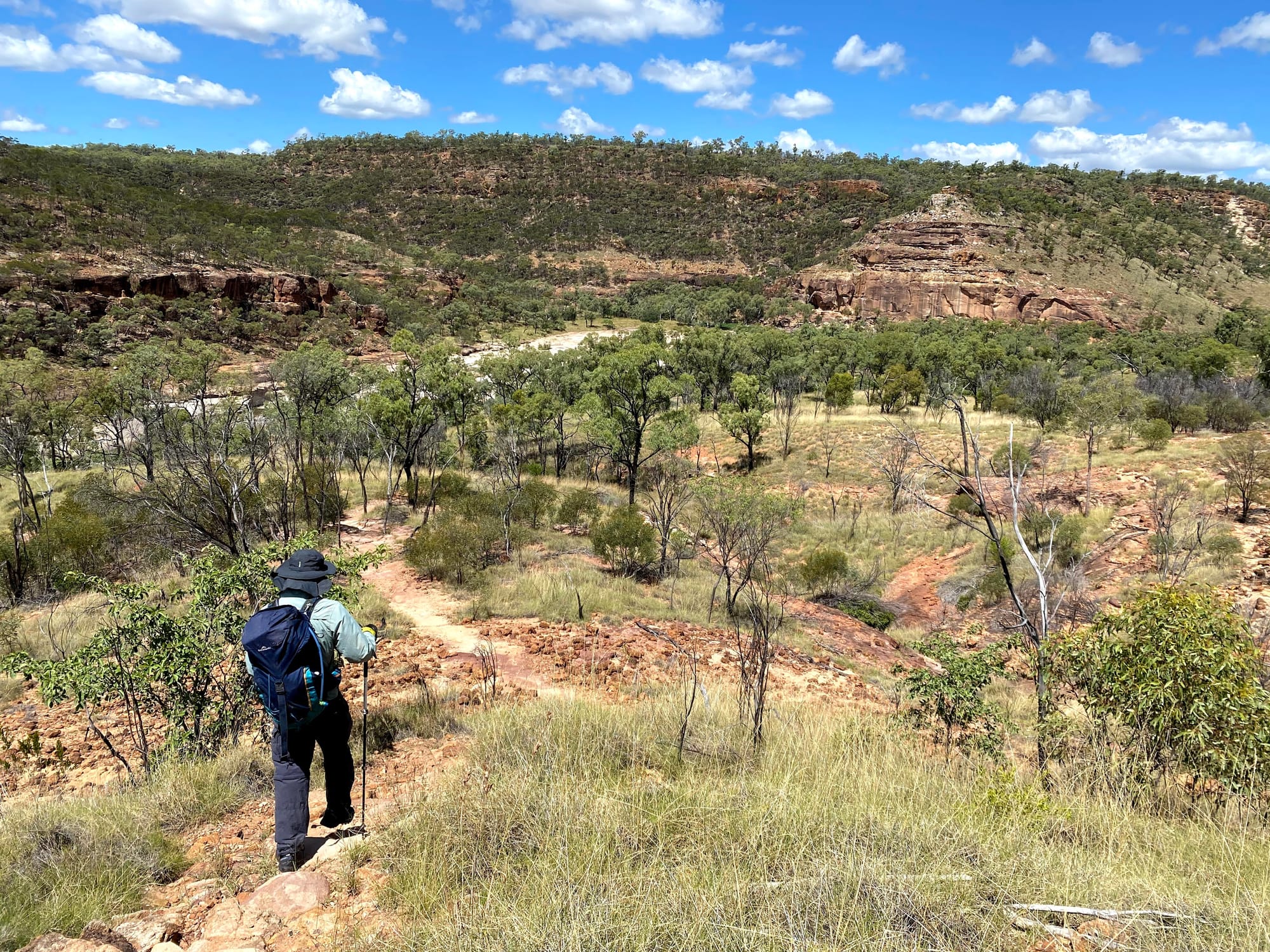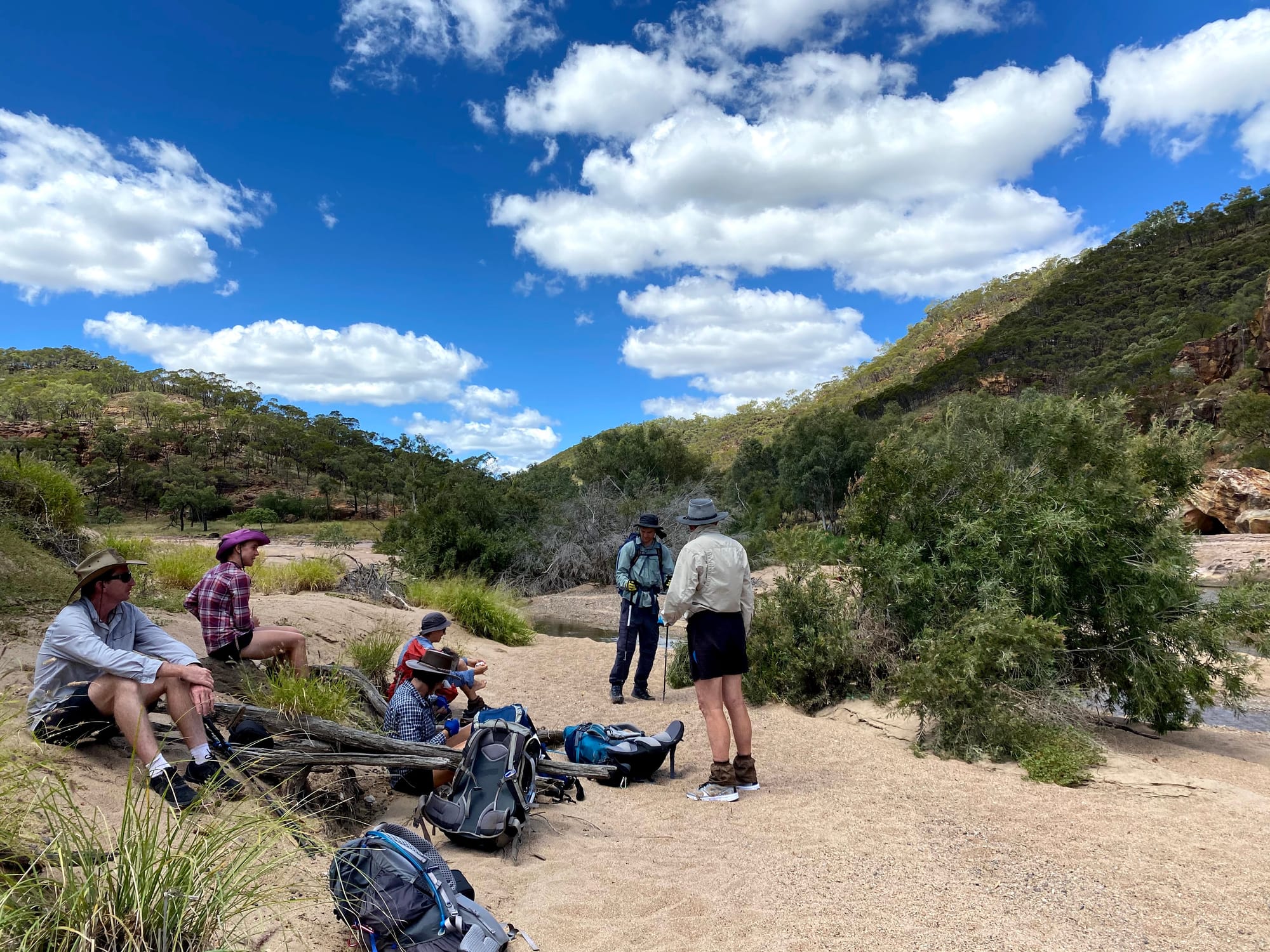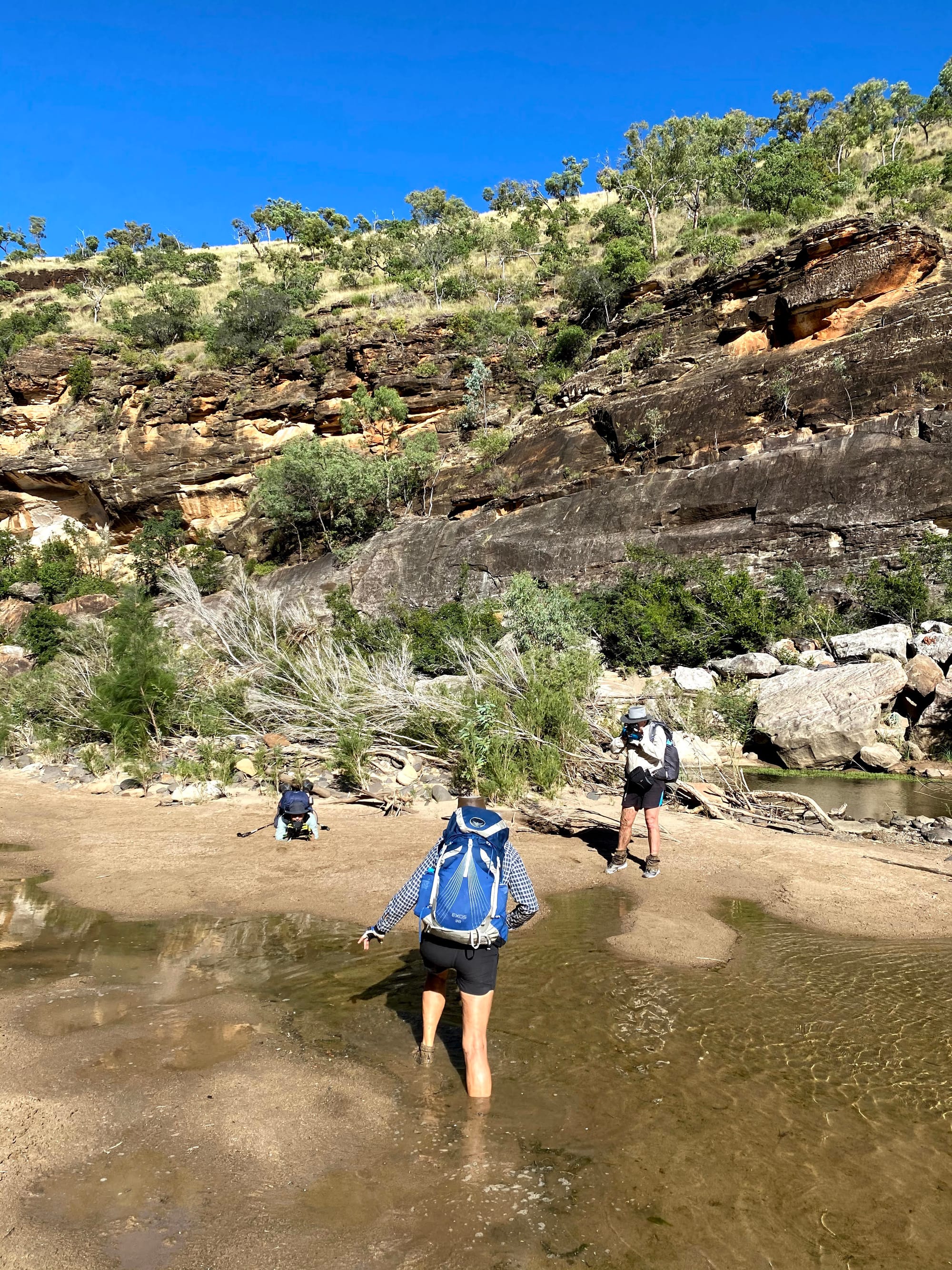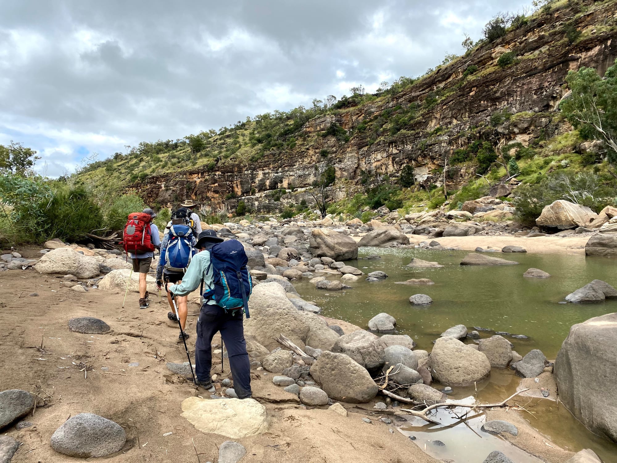 The group met over the Easter long weekend for the drive out to Hughenden country, with the walk starting from The Pyramid day-use area on Good Friday. It is always a striking contrast arriving there - flat, dry open country above, then suddenly a deep, dramatic gorge cut into the earth below. Packs were hoisted, final checks made, and everyone began the descent track into the gorge. Once down at creek level, the real walk began.