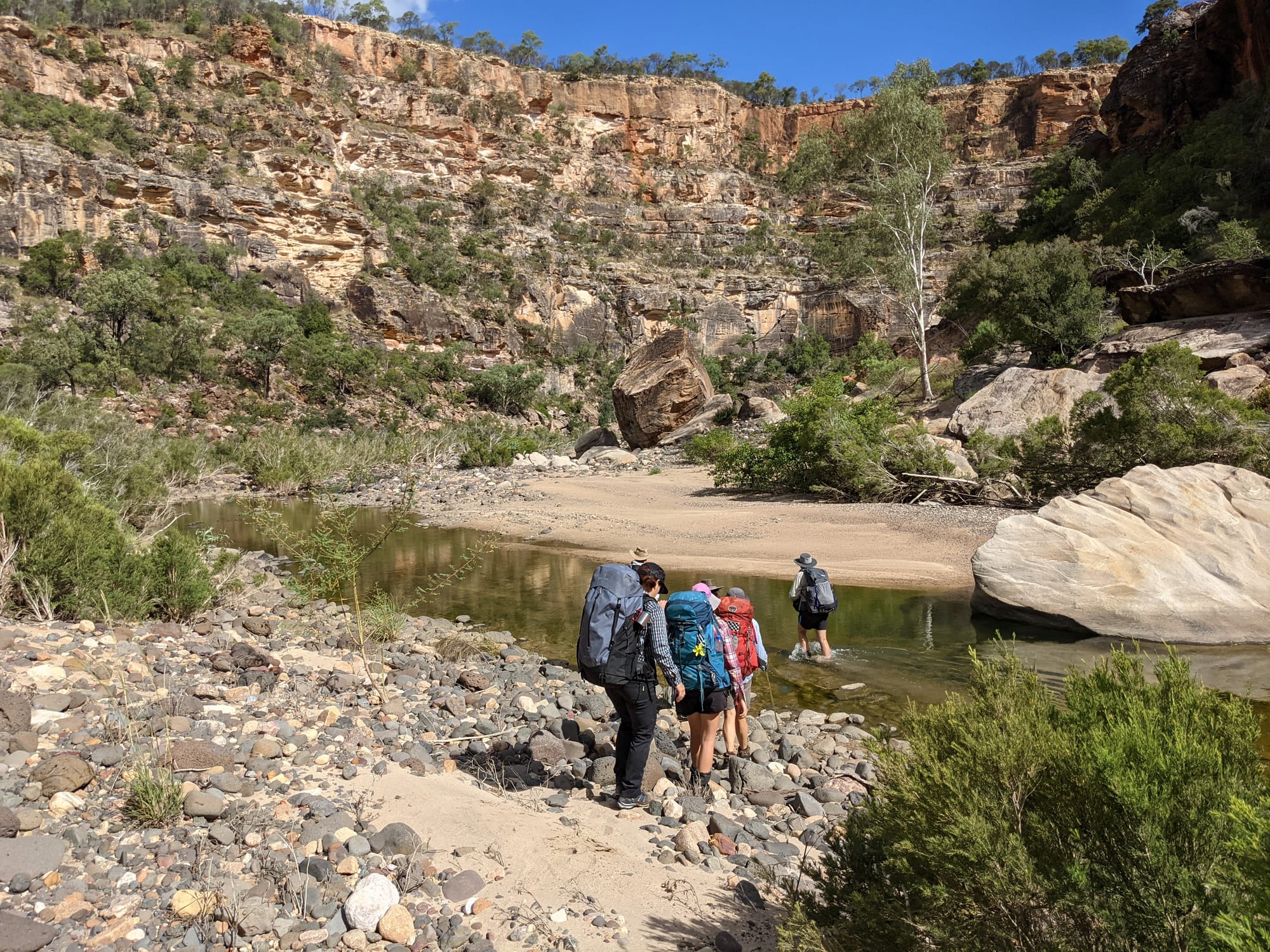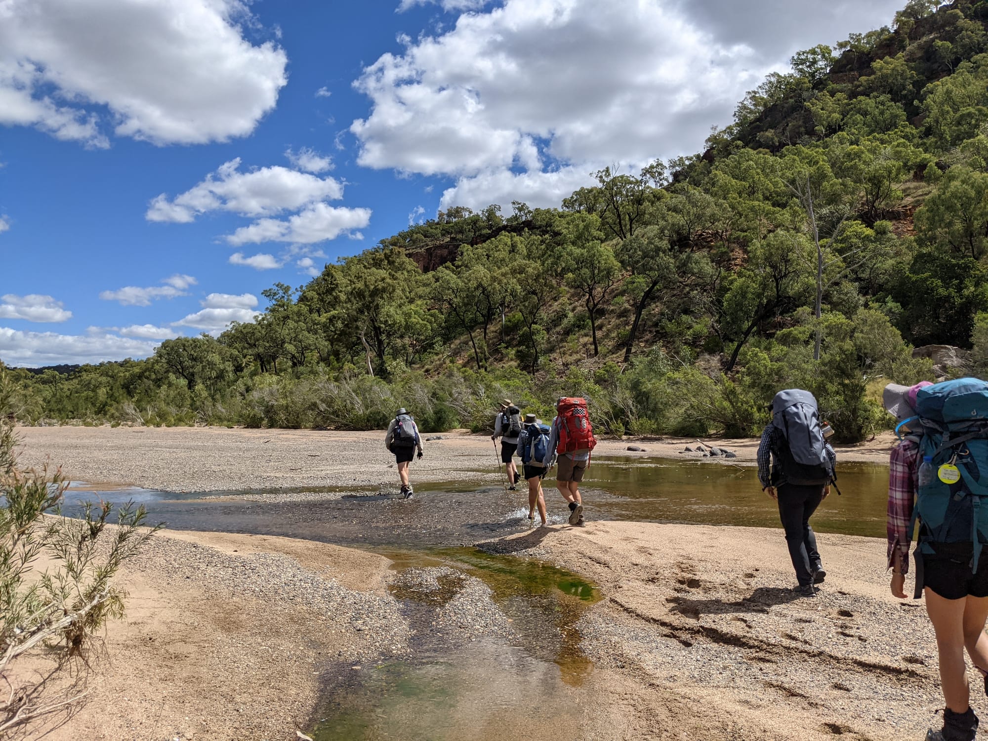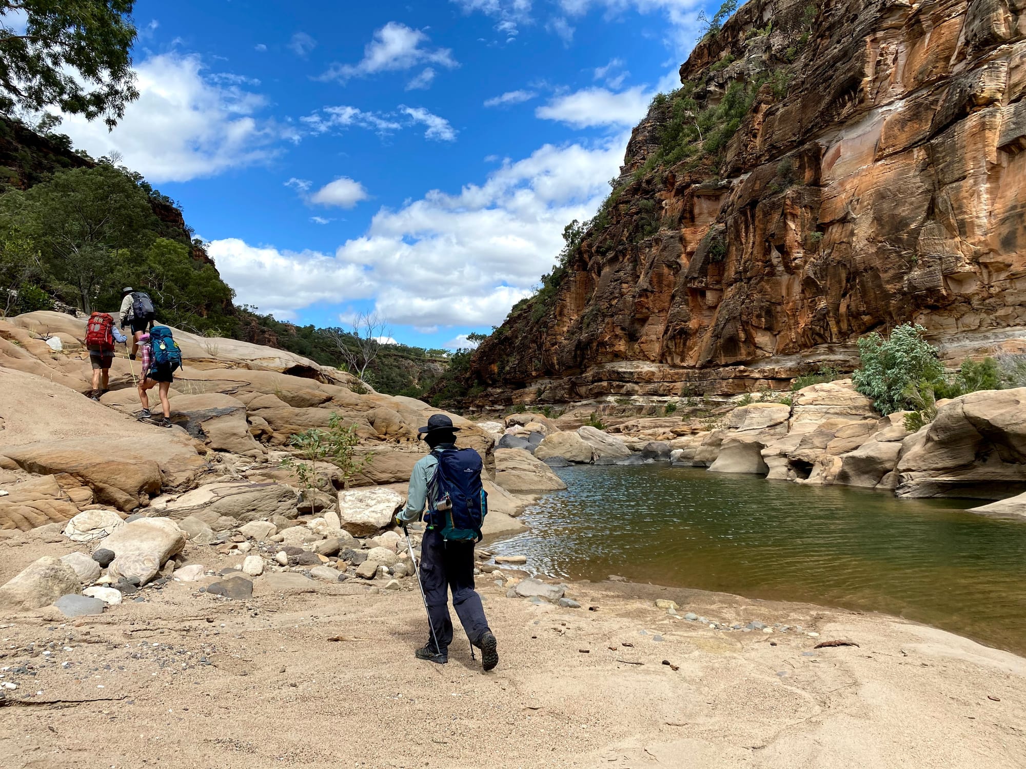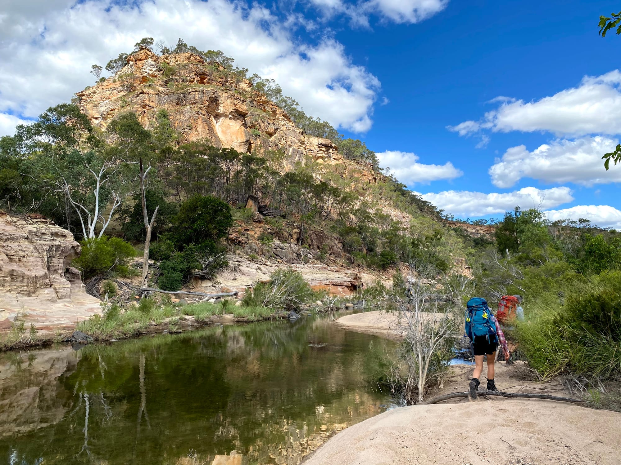 The group met over the Easter long weekend for the drive out to Hughenden country, with the walk starting from The Pyramid day-use area on Good Friday. It is always a striking contrast arriving there - flat, dry open country above, then suddenly a deep, dramatic gorge cut into the earth below. Packs were hoisted, final checks made, and everyone began the descent track into the gorge. Once down at creek level, the real walk began.