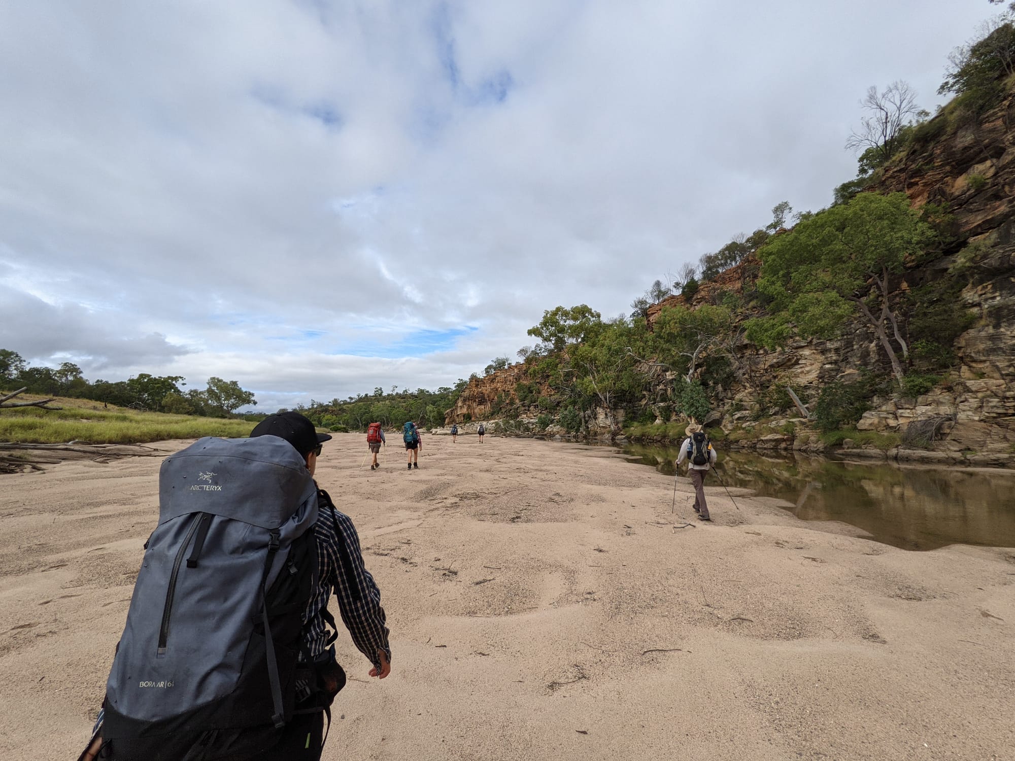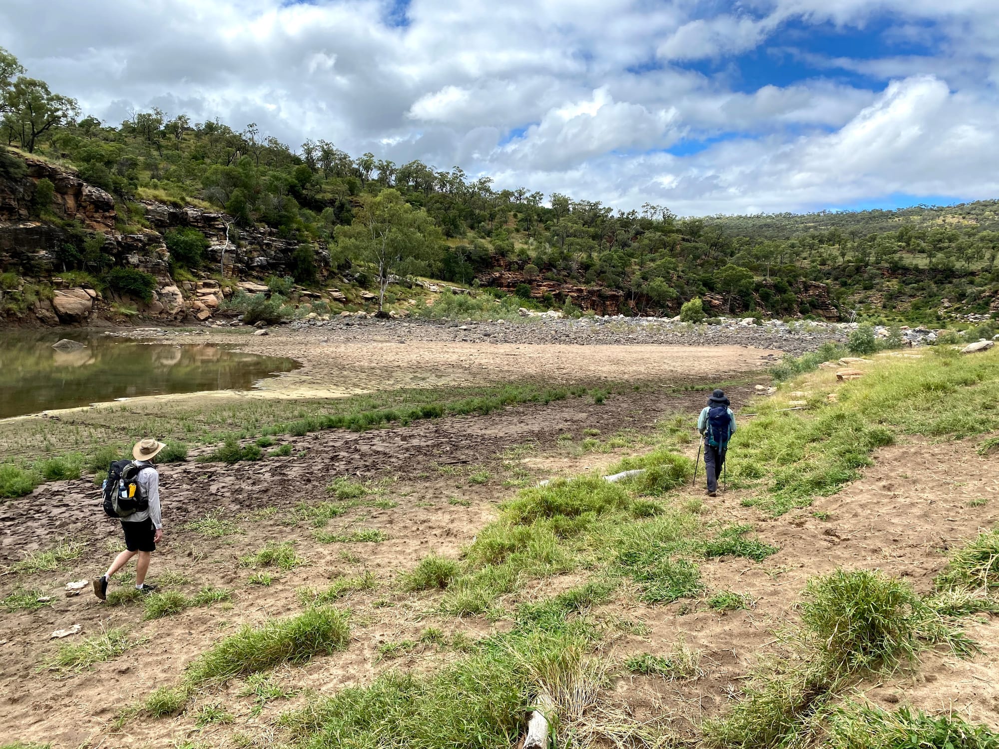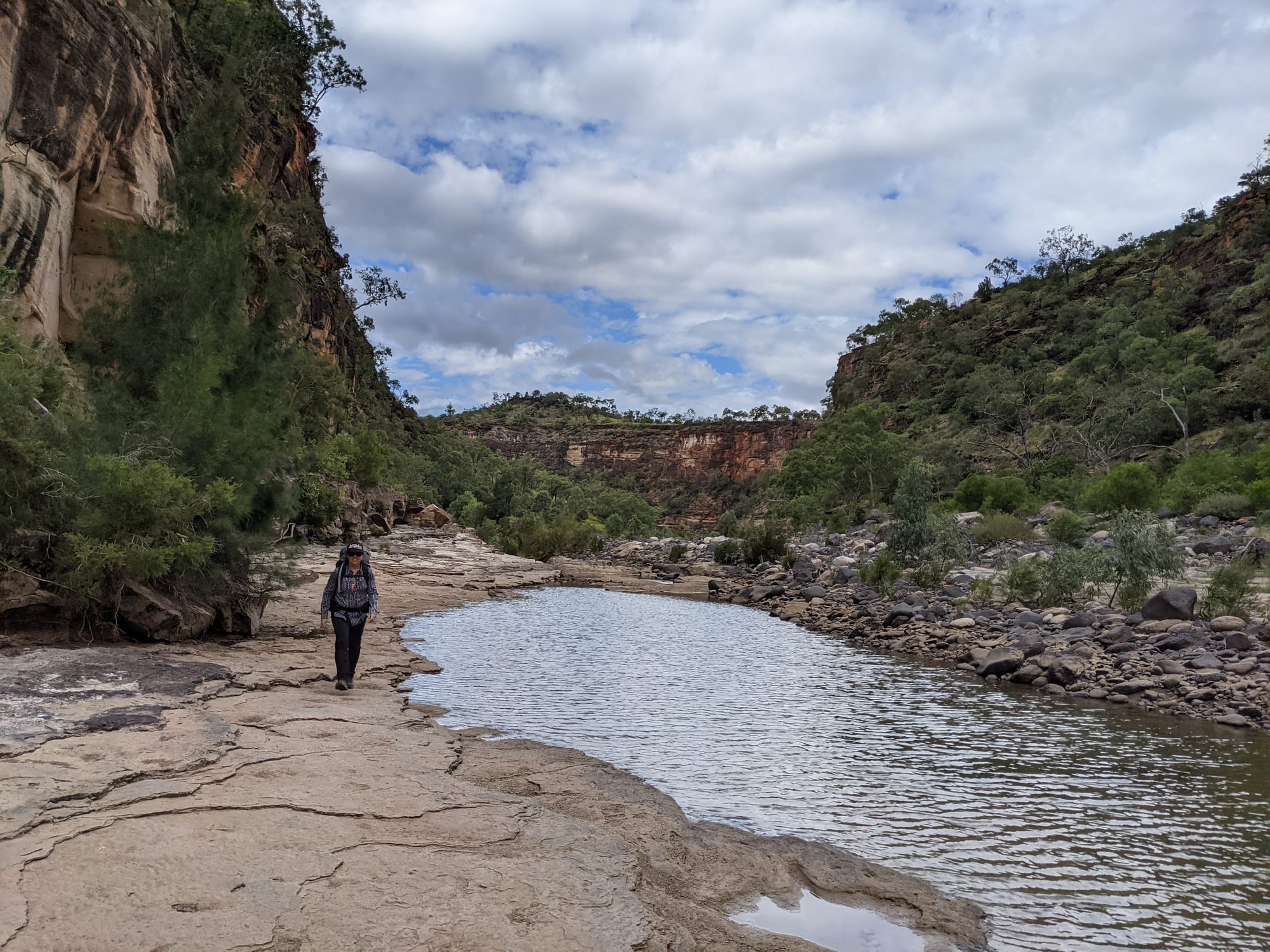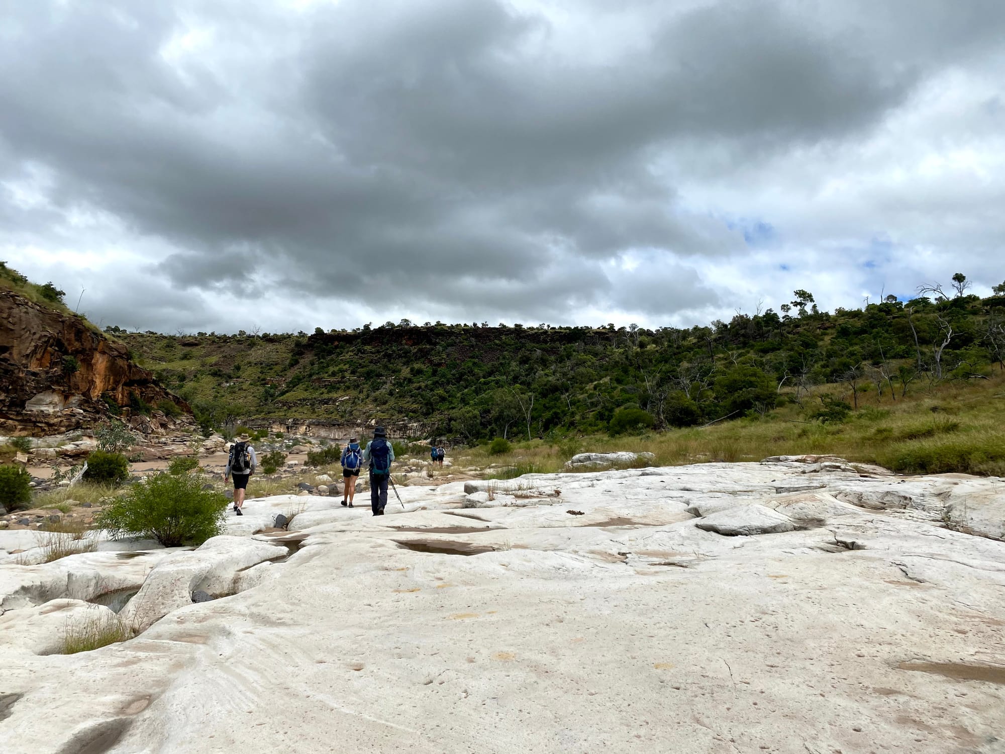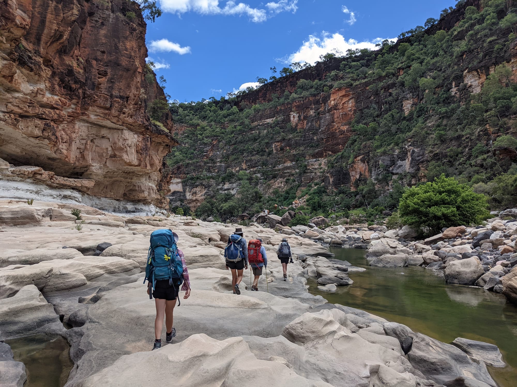 The group met over the Easter long weekend for the drive out to Hughenden country, with the walk starting from The Pyramid day-use area on Good Friday. It is always a striking contrast arriving there - flat, dry open country above, then suddenly a deep, dramatic gorge cut into the earth below. Packs were hoisted, final checks made, and everyone began the descent track into the gorge. Once down at creek level, the real walk began.