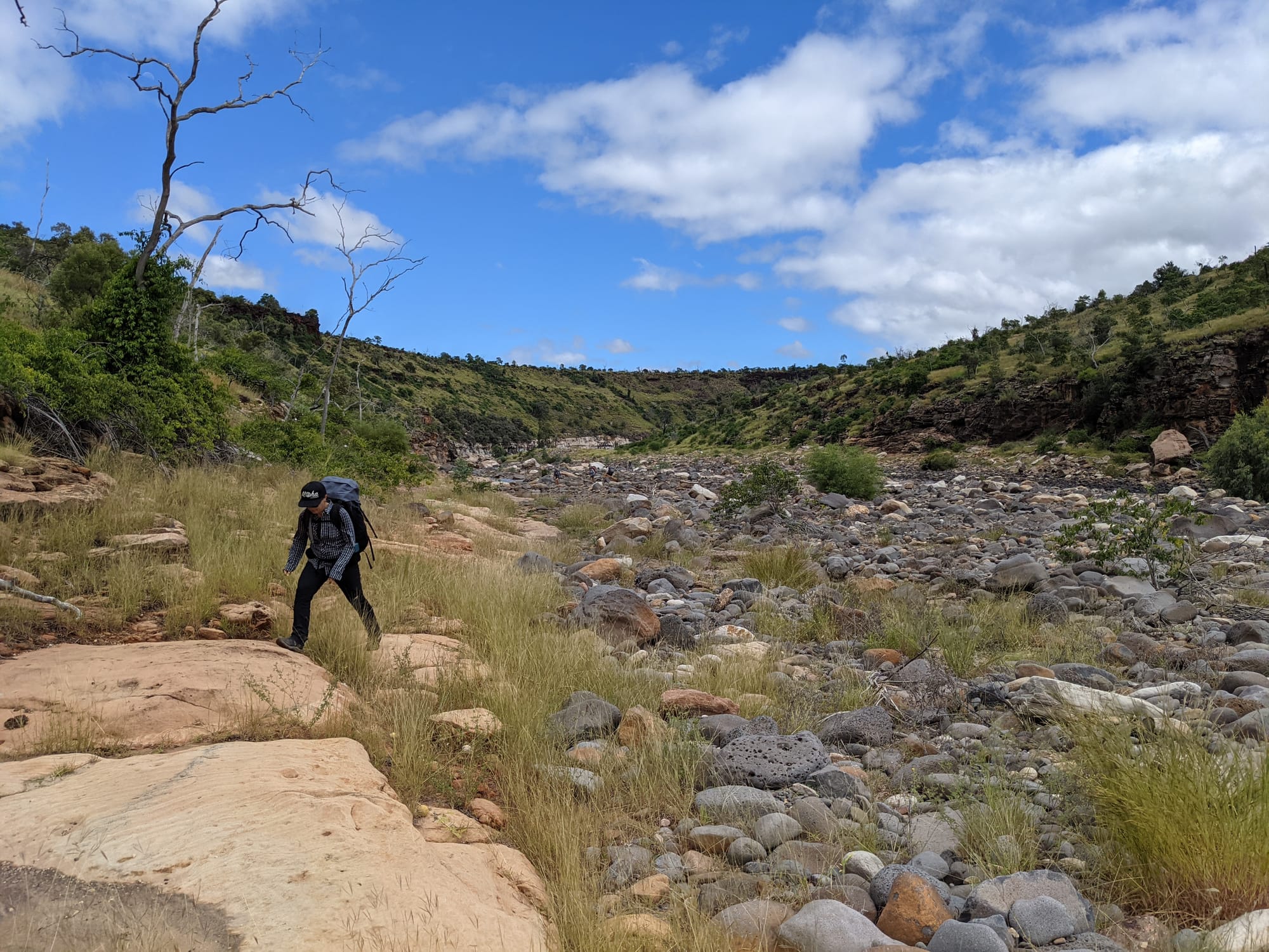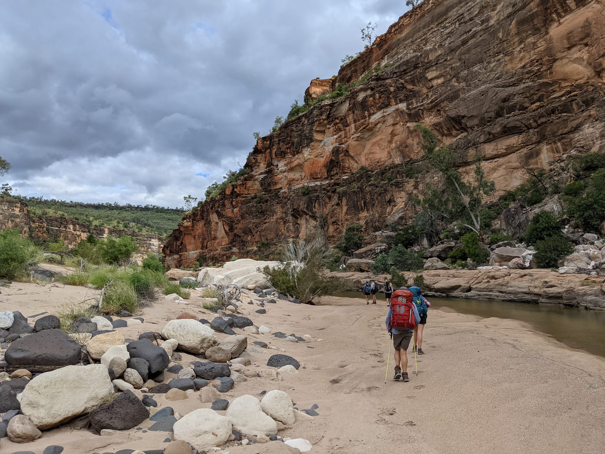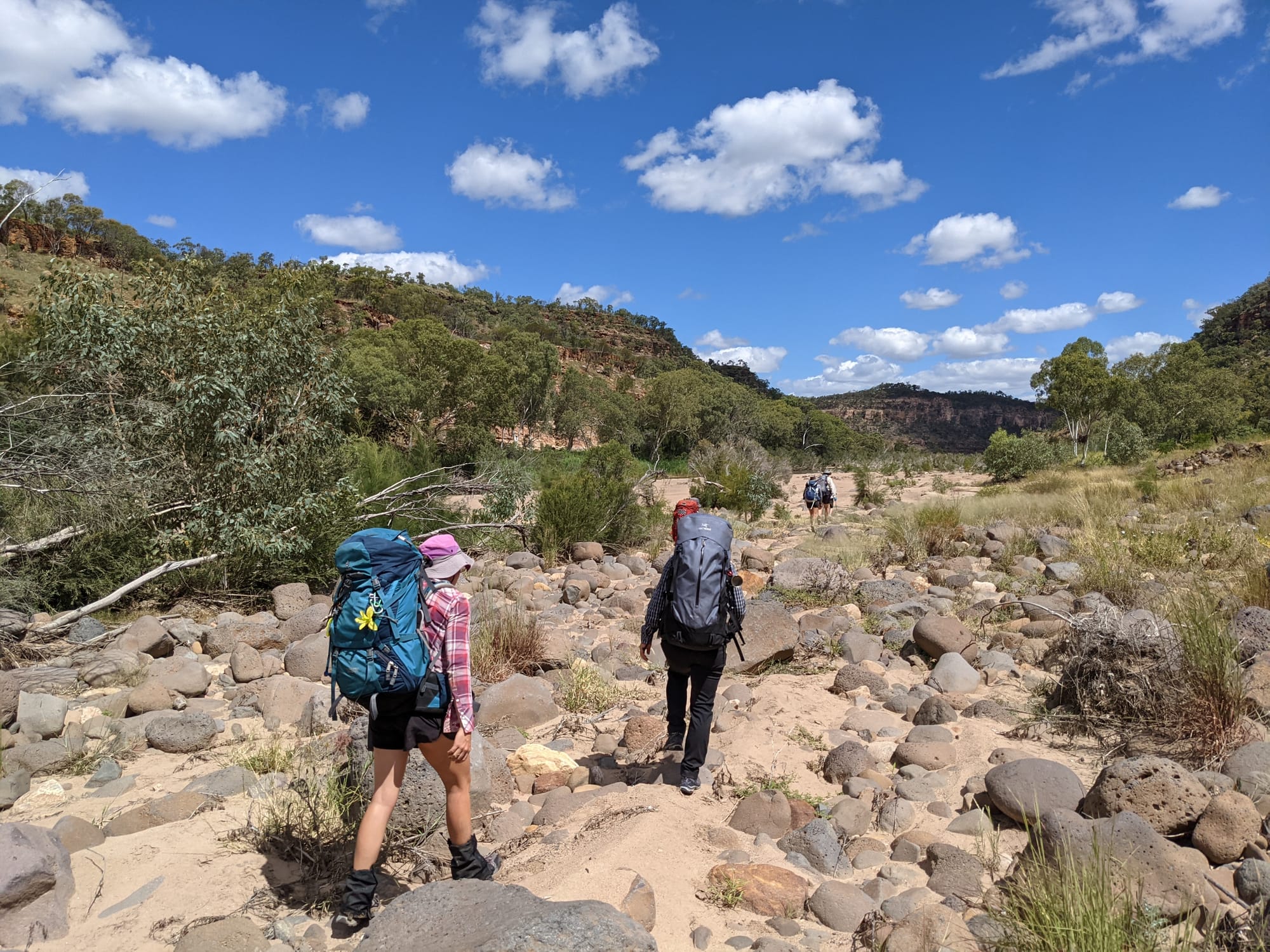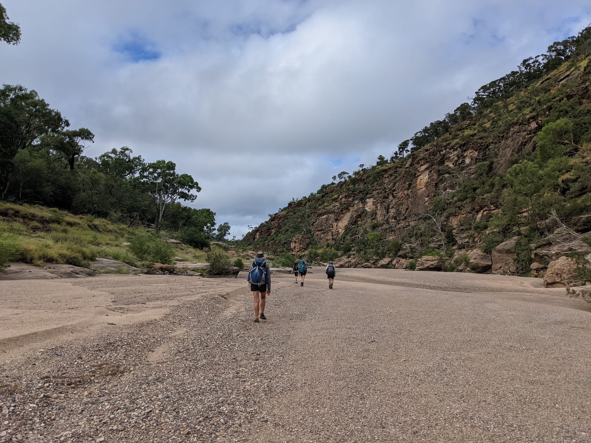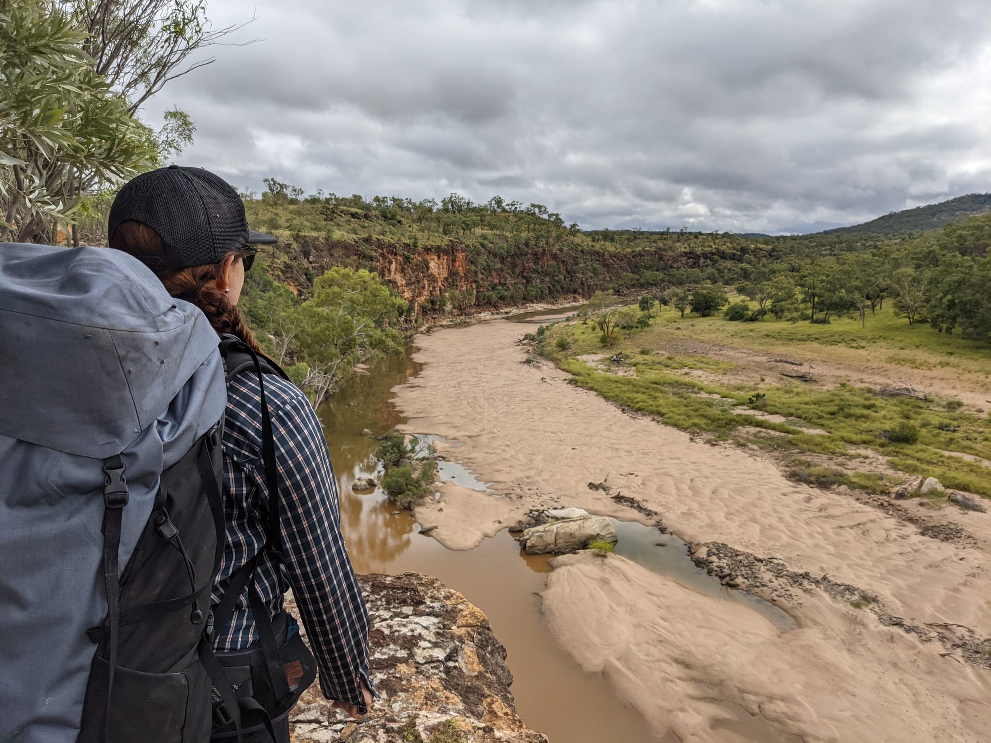 The group met over the Easter long weekend for the drive out to Hughenden country, with the walk starting from The Pyramid day-use area on Good Friday. It is always a striking contrast arriving there - flat, dry open country above, then suddenly a deep, dramatic gorge cut into the earth below. Packs were hoisted, final checks made, and everyone began the descent track into the gorge. Once down at creek level, the real walk began.