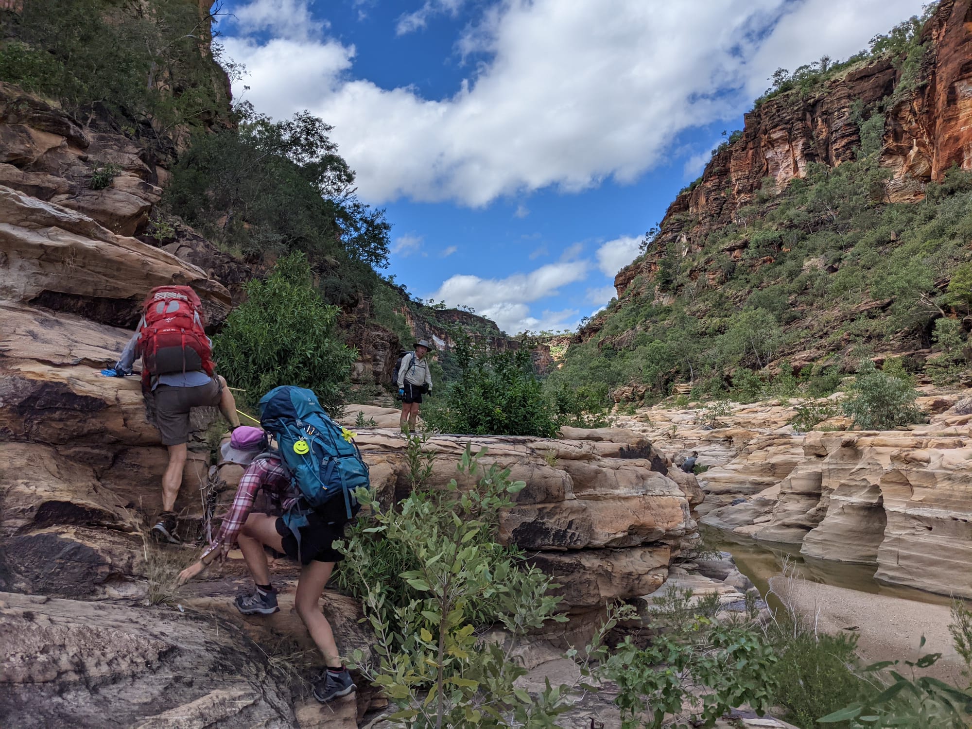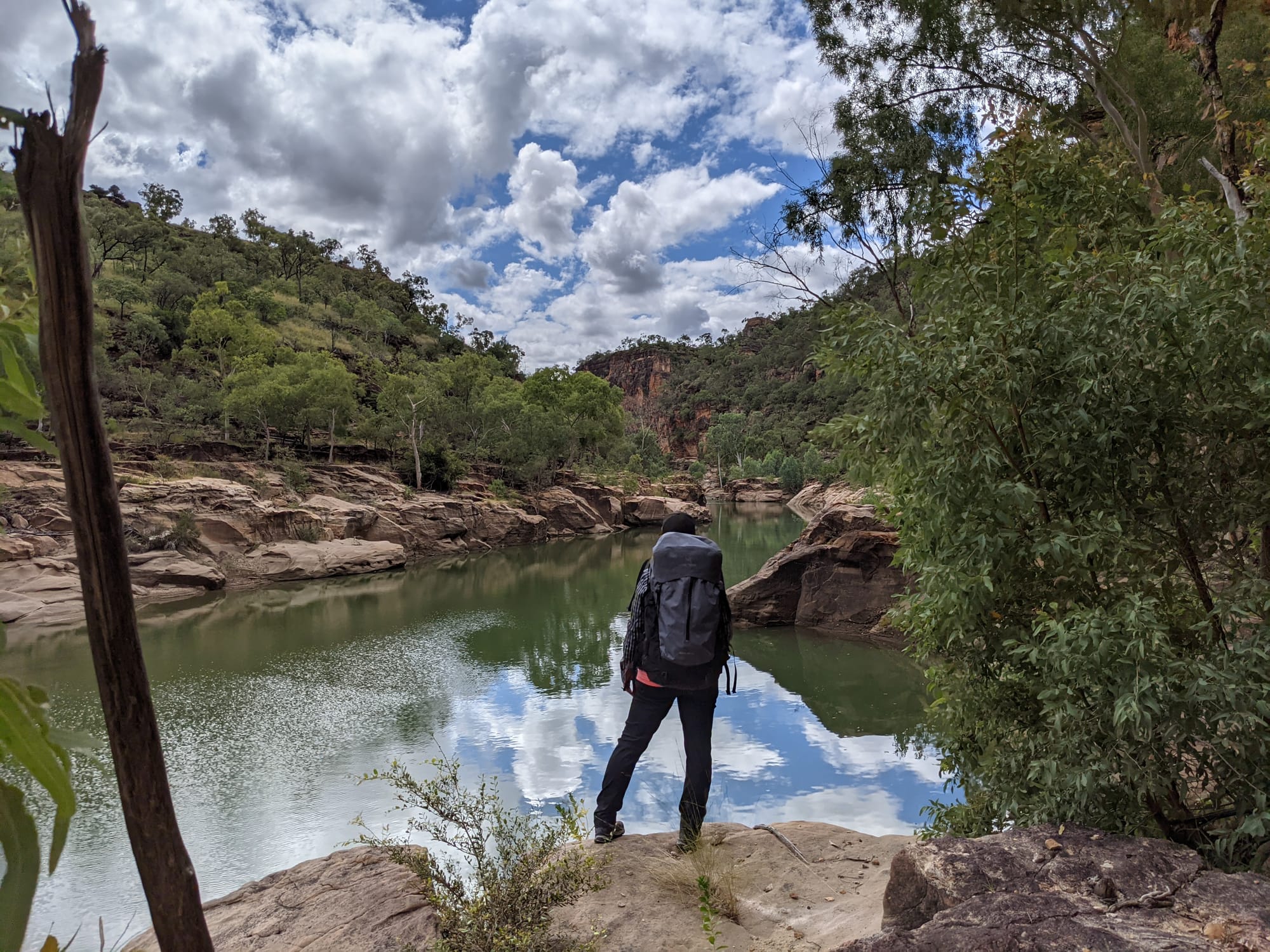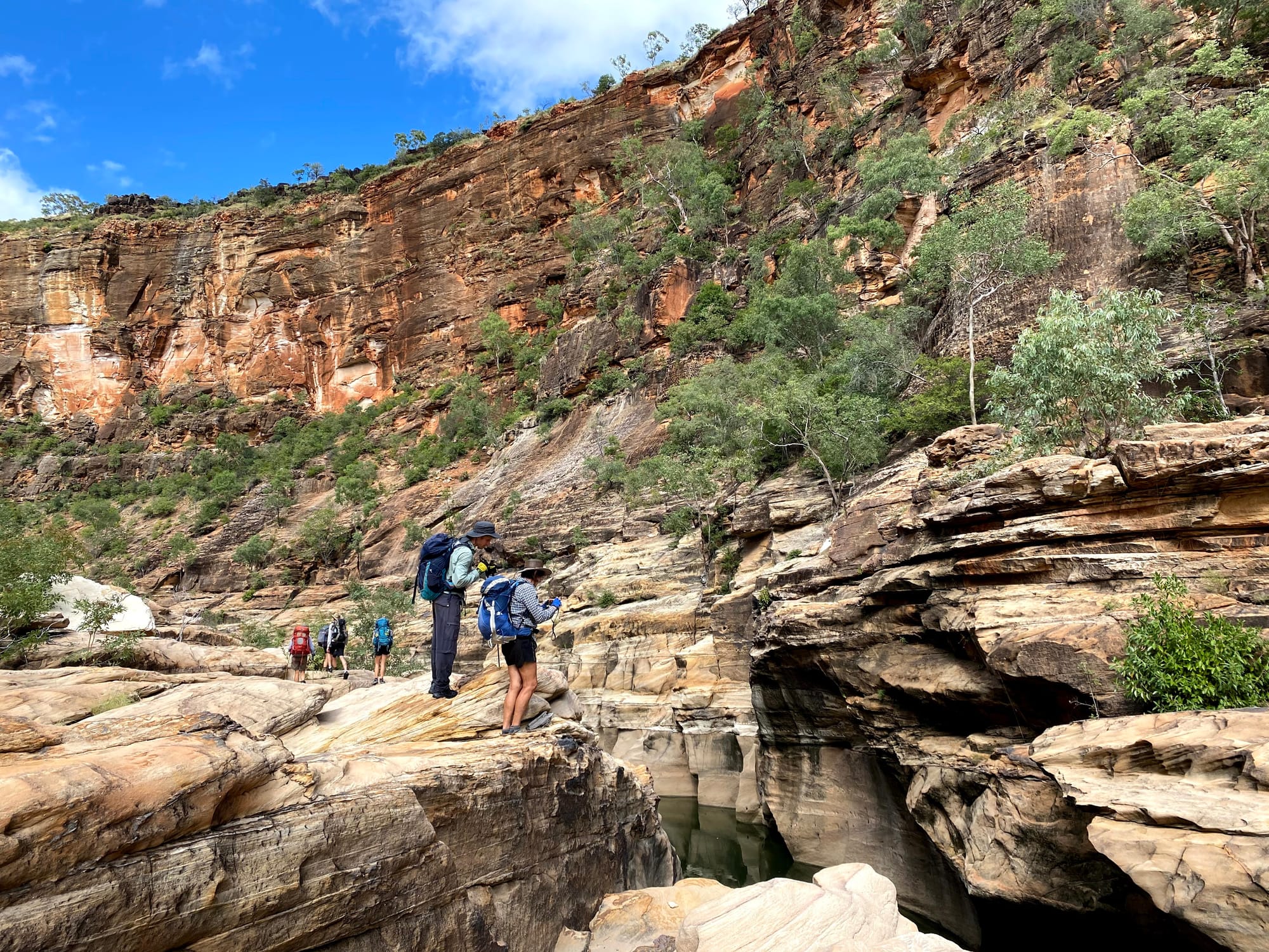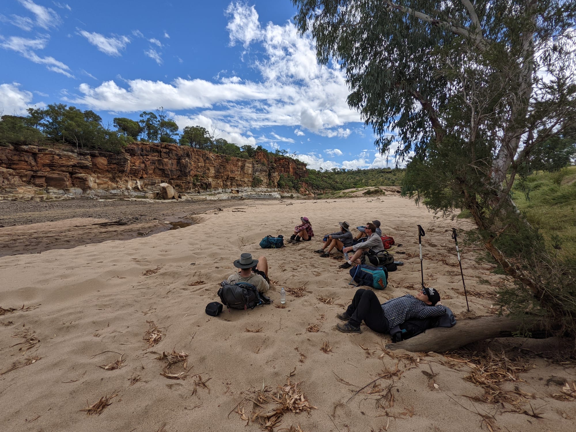 The group met over the Easter long weekend for the drive out to Hughenden country, with the walk starting from The Pyramid day-use area on Good Friday. It is always a striking contrast arriving there - flat, dry open country above, then suddenly a deep, dramatic gorge cut into the earth below. Packs were hoisted, final checks made, and everyone began the descent track into the gorge. Once down at creek level, the real walk began.