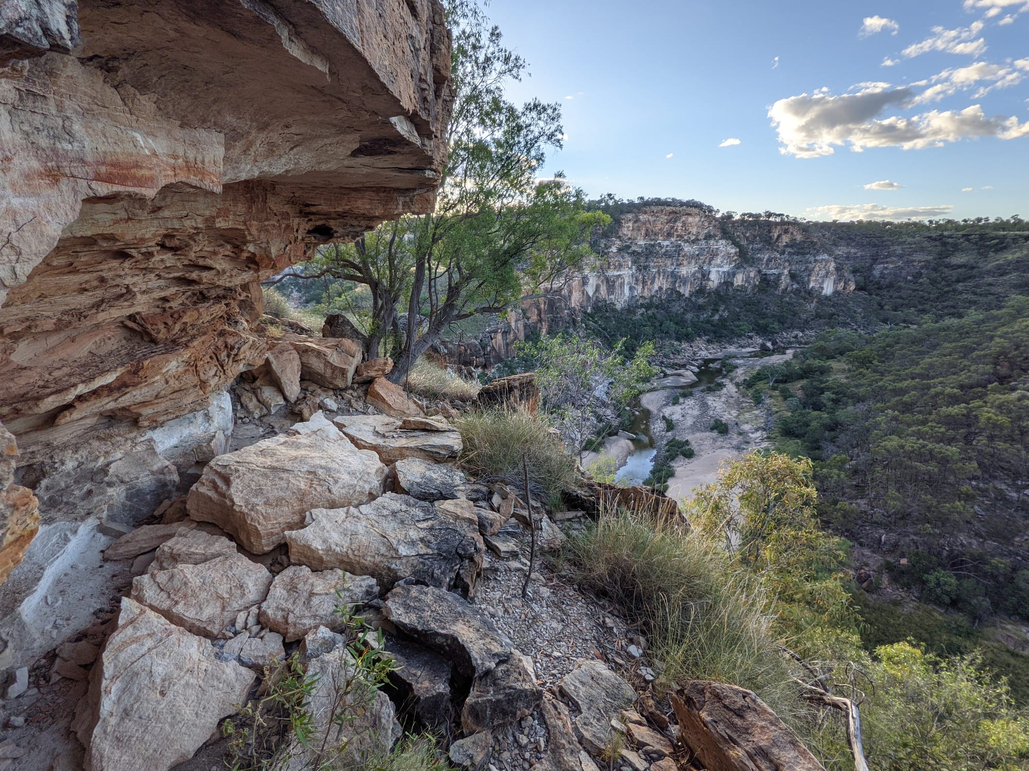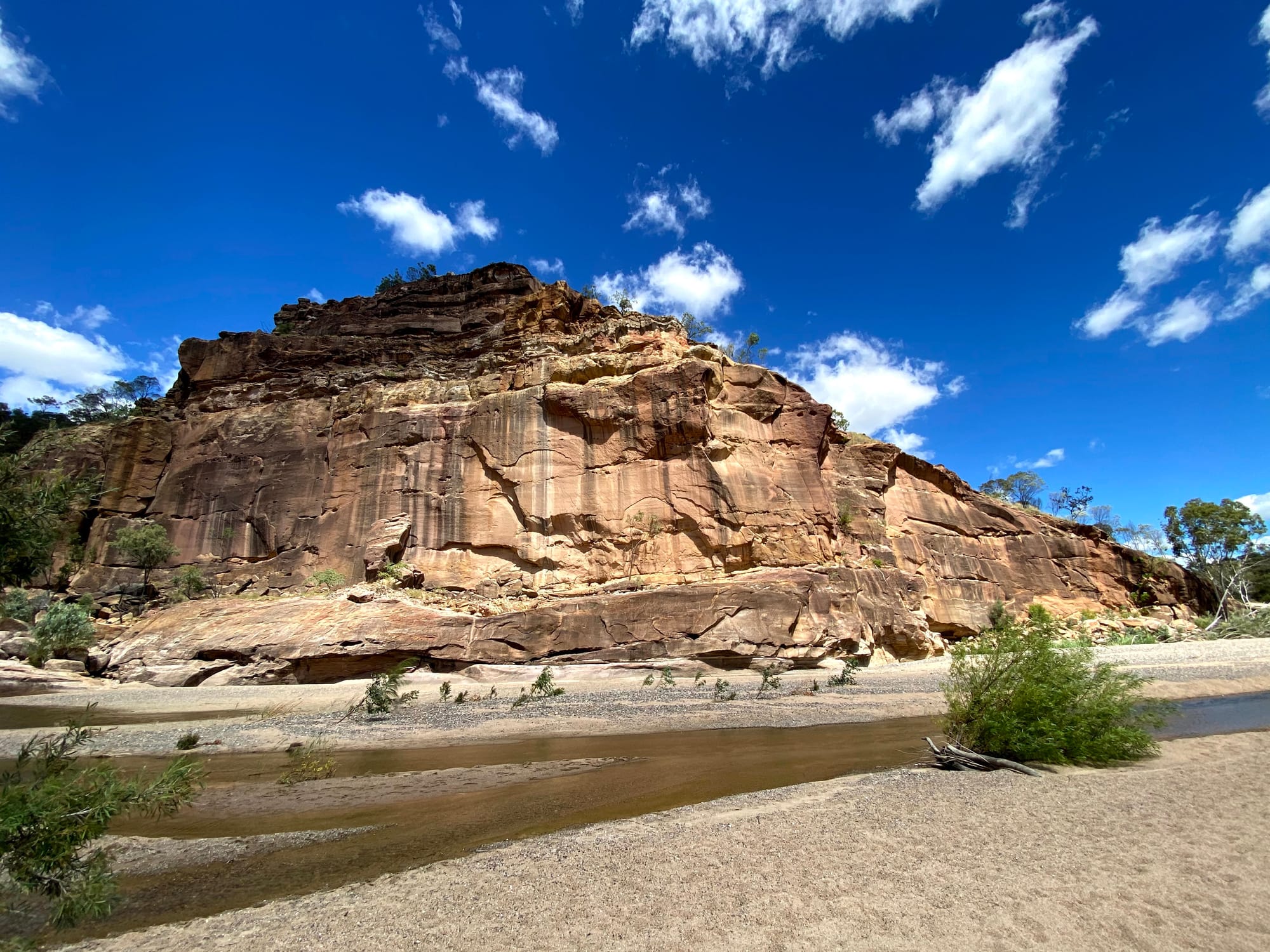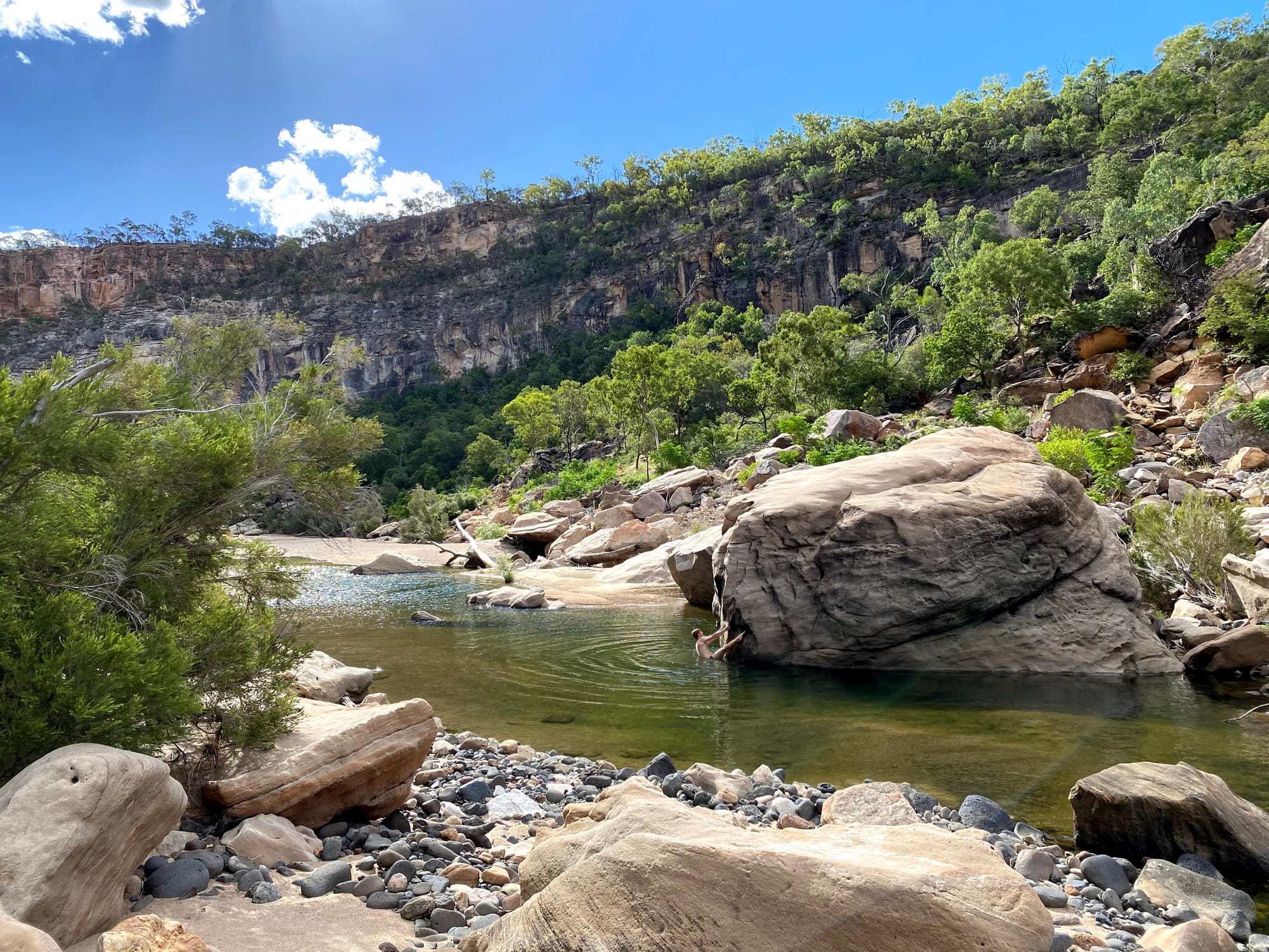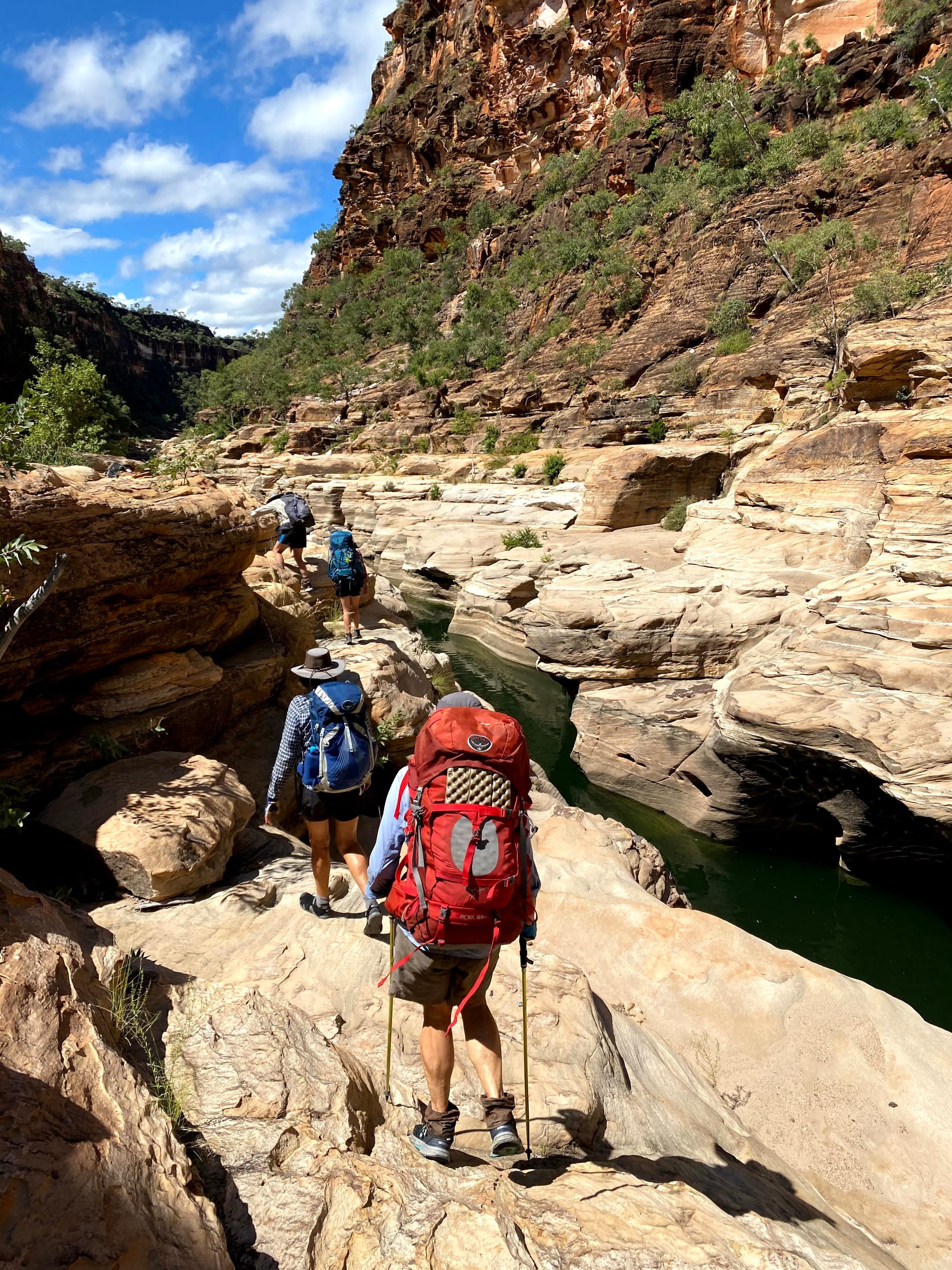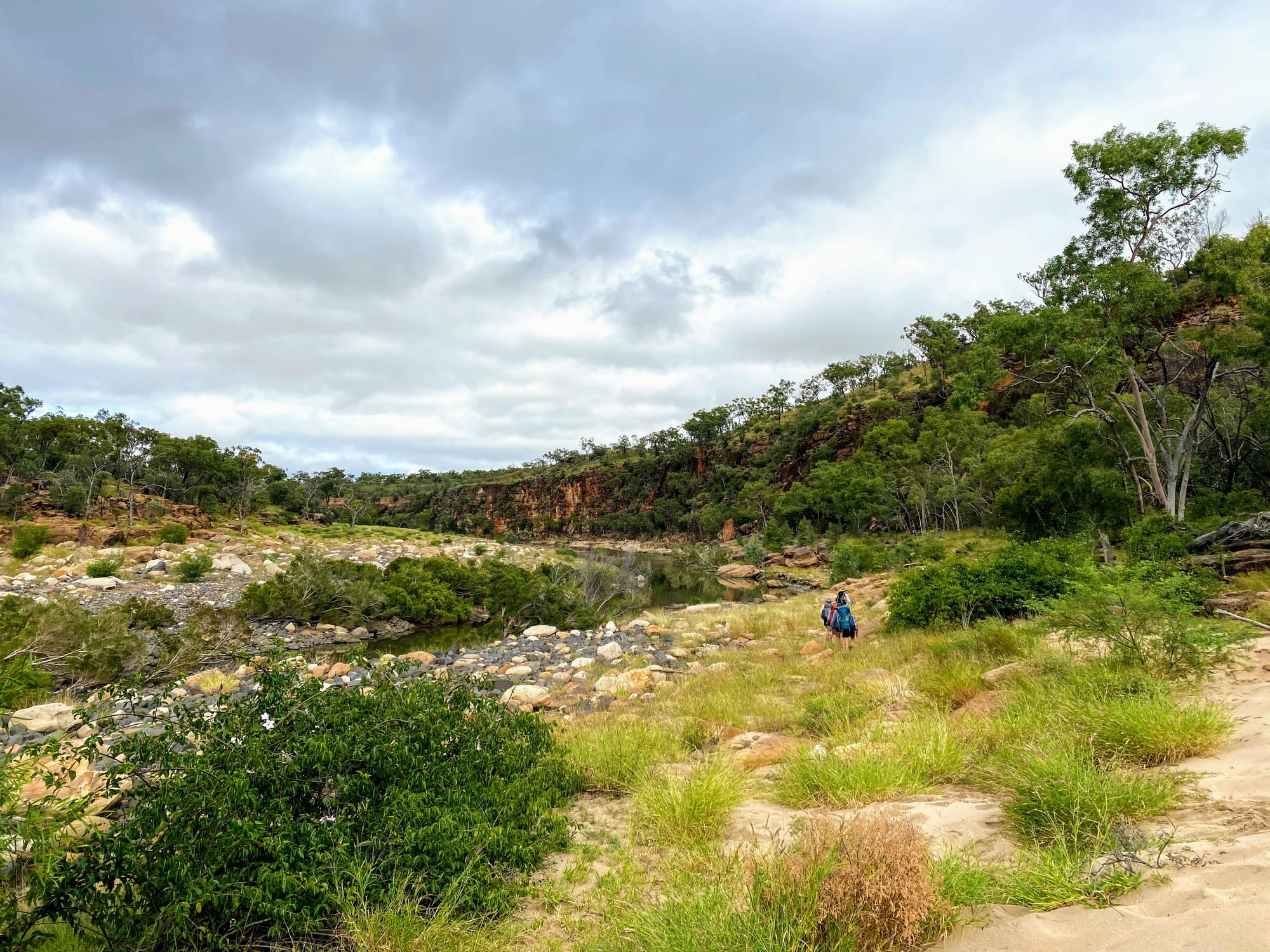 The group met over the Easter long weekend for the drive out to Hughenden country, with the walk starting from The Pyramid day-use area on Good Friday. It is always a striking contrast arriving there - flat, dry open country above, then suddenly a deep, dramatic gorge cut into the earth below. Packs were hoisted, final checks made, and everyone began the descent track into the gorge. Once down at creek level, the real walk began.