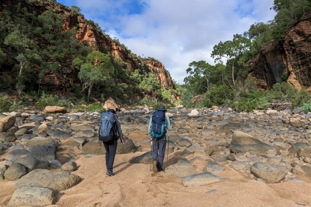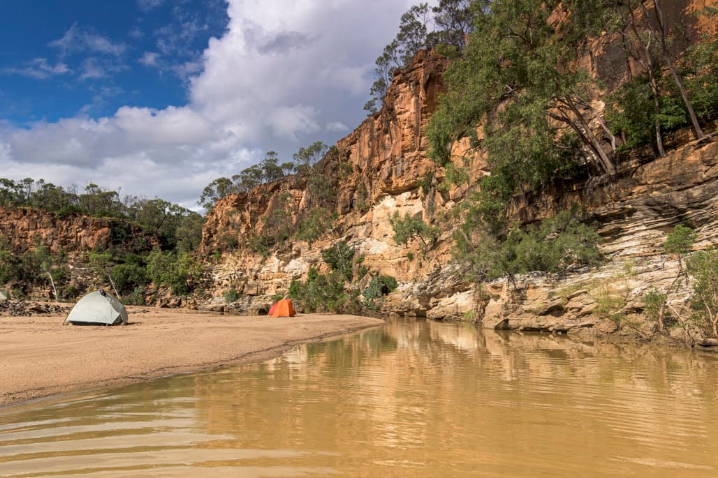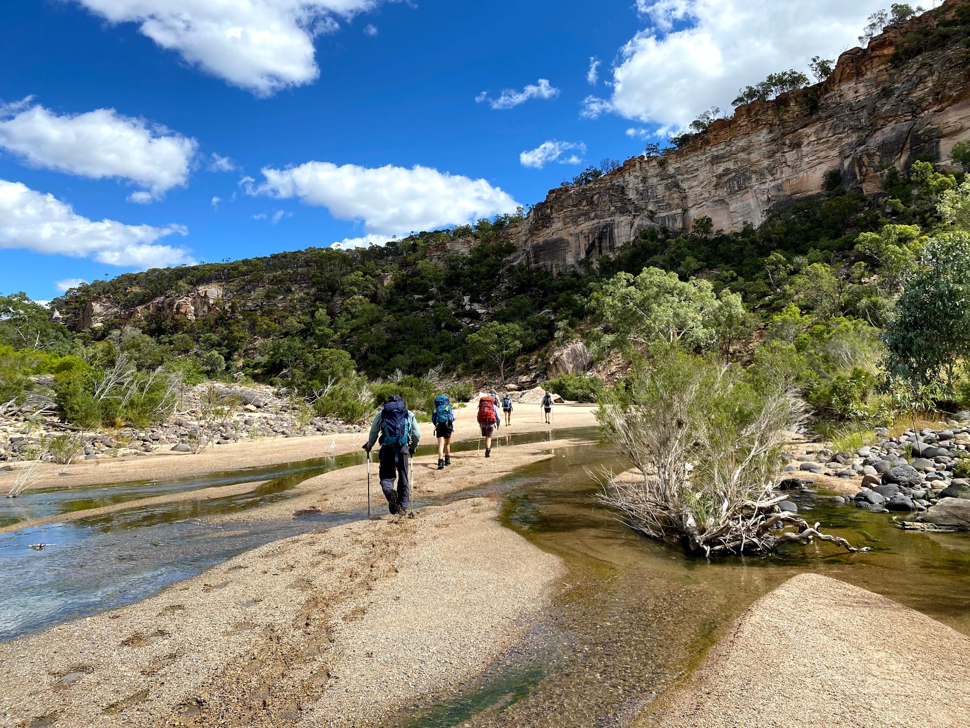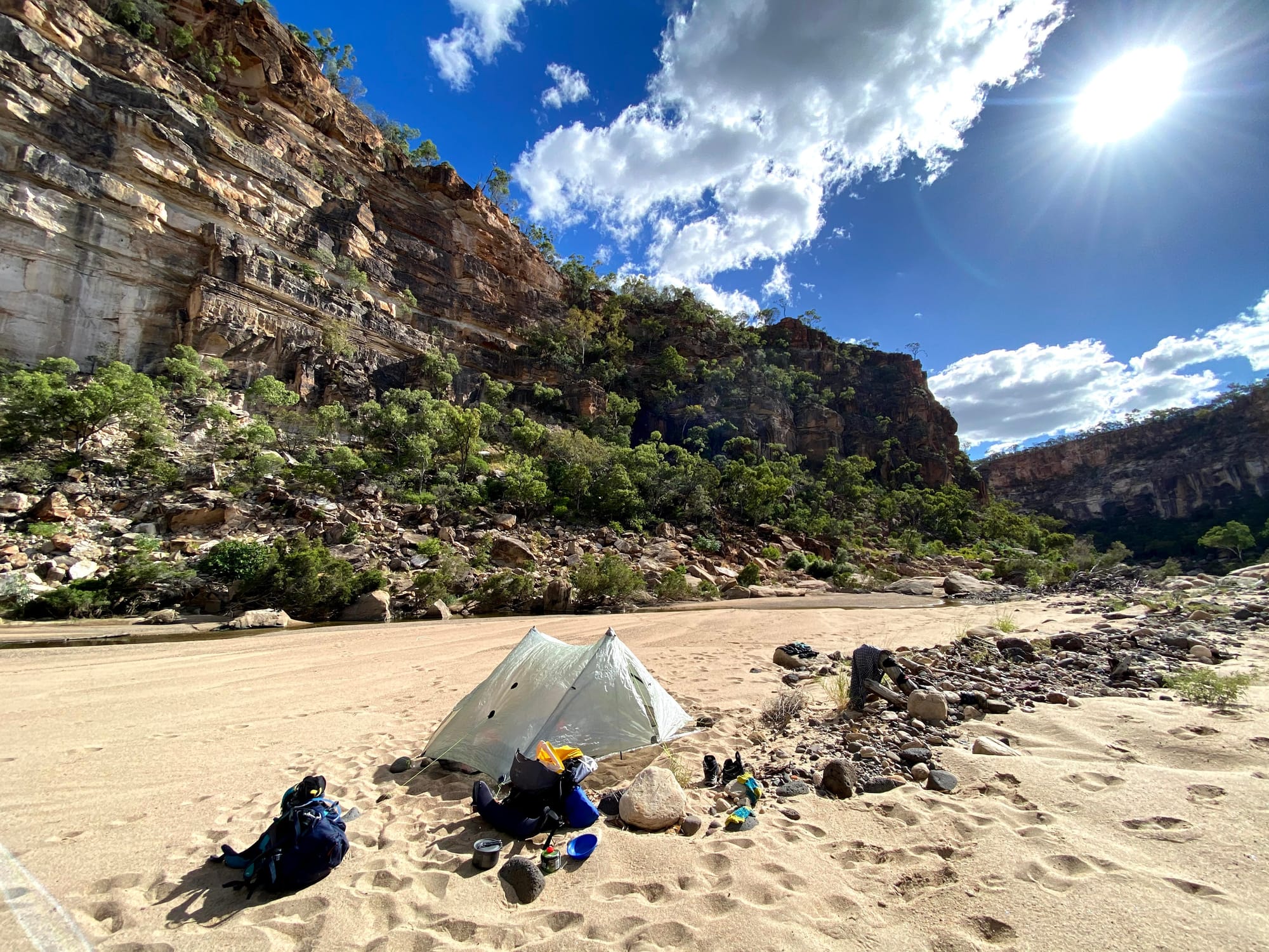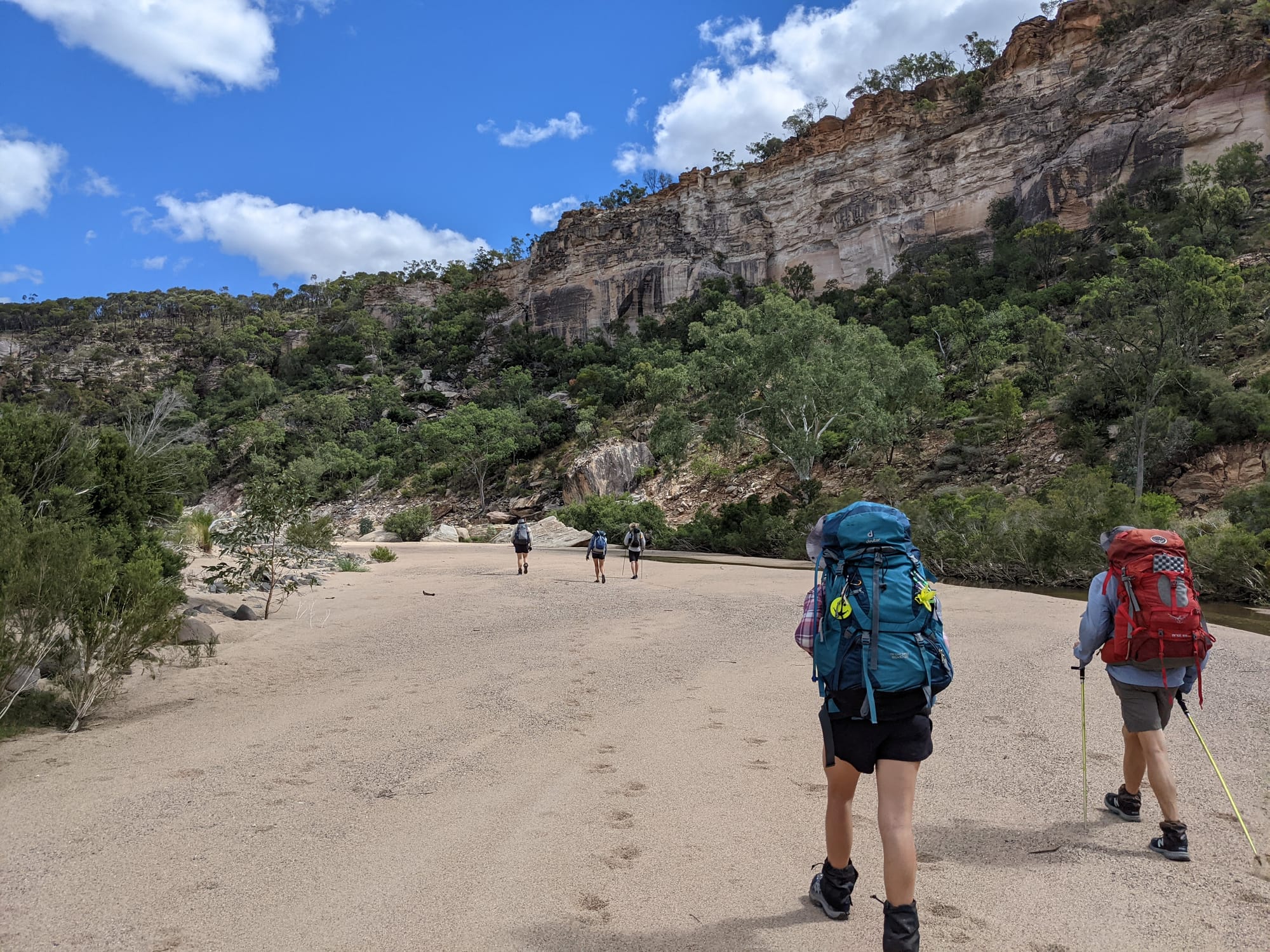 By afternoon, the group reached White Wall, another superb campsite and one of the highlights of the entire walk. The pale cliff face rises above the creek, glowing against the surrounding countryside, and the nearby rapids and beach make it an ideal place to pause, swim, and enjoy the evening. It is one of those campsites that makes people say, only half-jokingly, that you could search a long time and not find anywhere better to camp. After a solid day in the gorge, camp life was relaxed and contented. Wet shoes were lined up, water was filtered and treated, dinner was prepared, and the evening drifted into the usual bushwalking conversation - route talk, gear talk, laughter, and a fair bit of satisfaction at being deep in such a beautiful place.