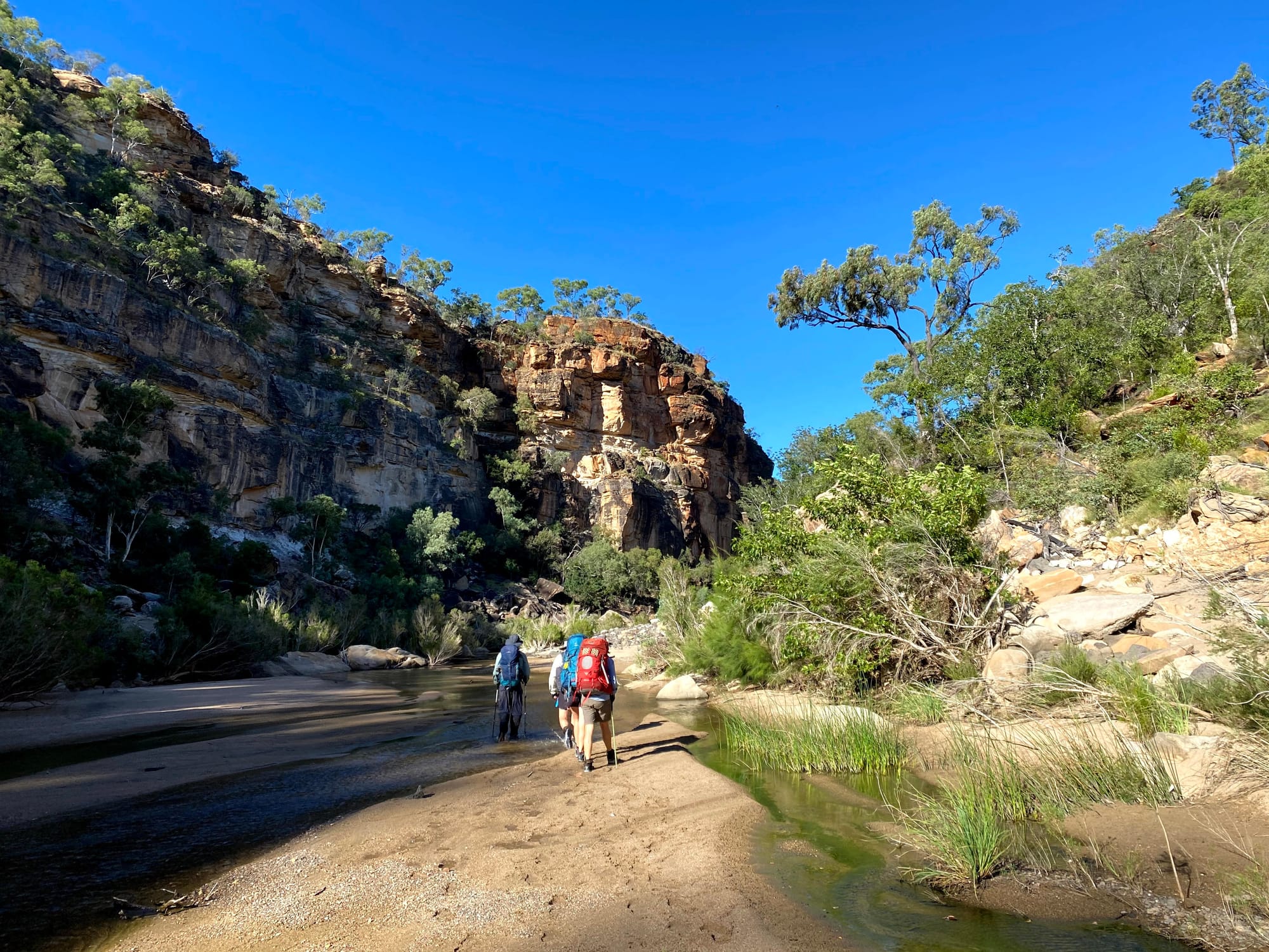 For years, the club had explored Porcupine Gorge as an out-and-back trip, but this time, Keith changed the script. The plan was to go all the way through. That meant a new country beyond White Wall, a proper car-shuttle puzzle, and a few fit volunteers ready to help retrieve vehicles at the end. It also meant wet footwear from the outset. One of the key rules for the trip was that we would not waste time stopping to take off our shoes at every crossing. There were simply too many of them. Shoes on, through we go, and keep moving.