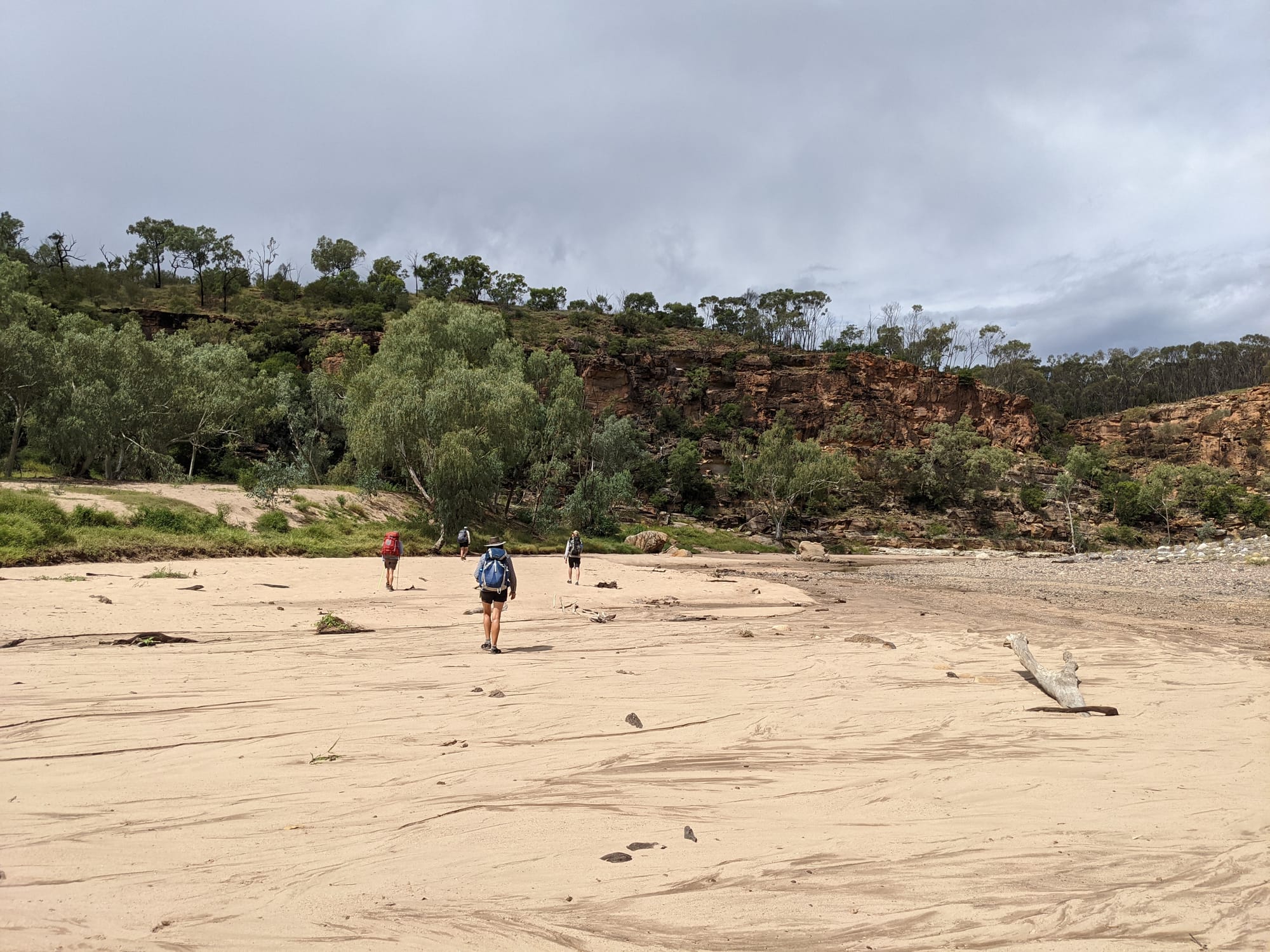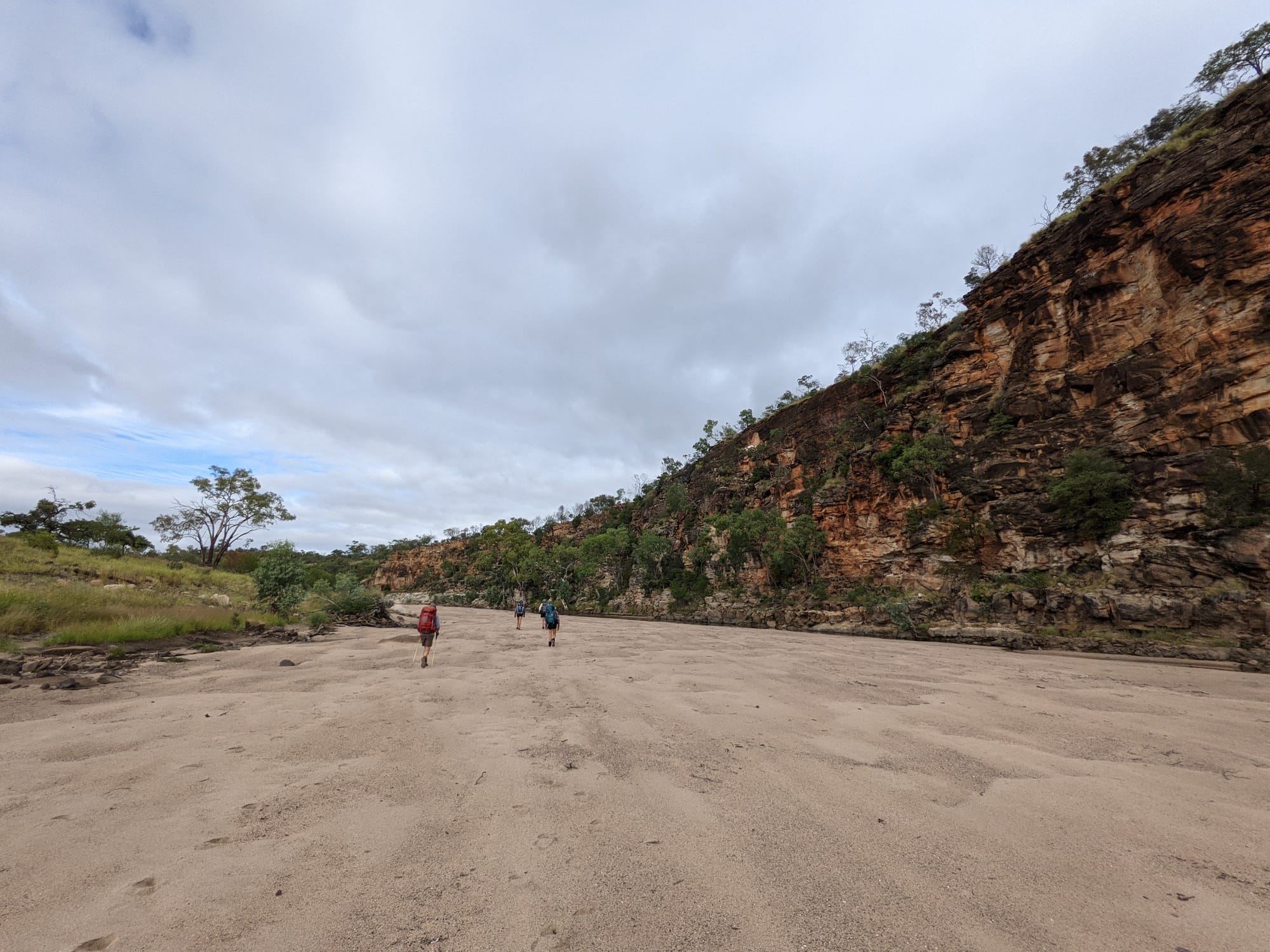 Day three was the big one. Leaving White Wall meant leaving familiar ground. Beyond that point, the group was heading into a country that none of us had explored before. Keith, of course, described it as "virgin territory", and the usual comments followed. The walking remained classic Porcupine Gorge - a mix of creek-bed travel, sand and gravel bars, rocky shelves, low scrub, and crossing after crossing. Some sections opened out and allowed easy progress, while others forced slower route finding around bends, rock barriers, or deeper pools. The scenery kept changing as the gorge evolved downstream. Cliffs shifted in colour and shape, the creek disappeared into stretches of pools and reappeared as flowing runs, and the feeling of remoteness grew stronger as the day wore on.
