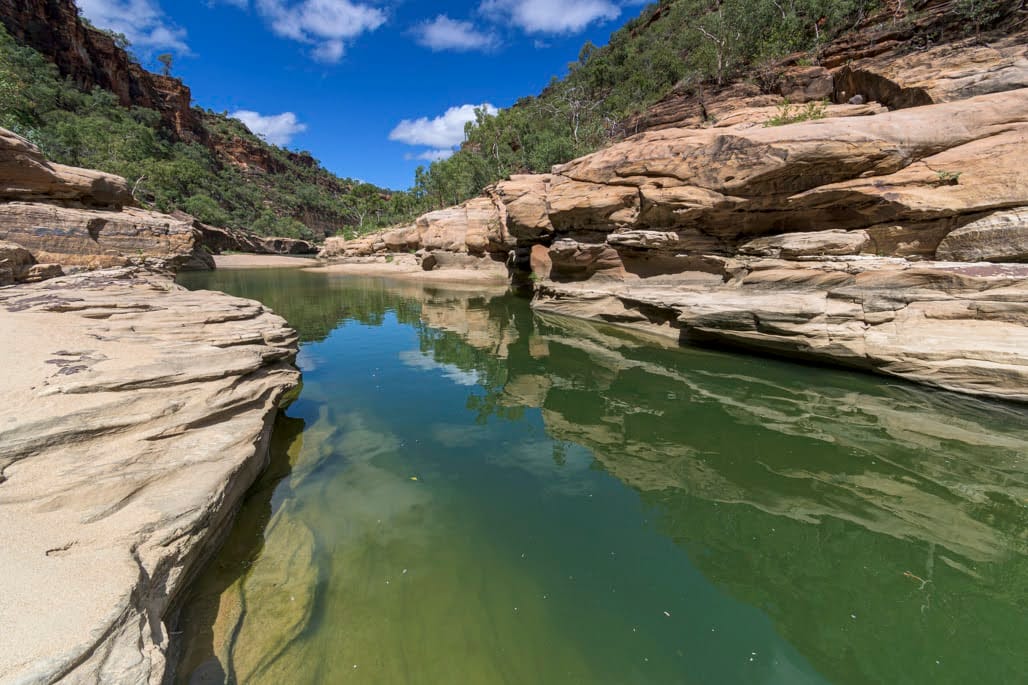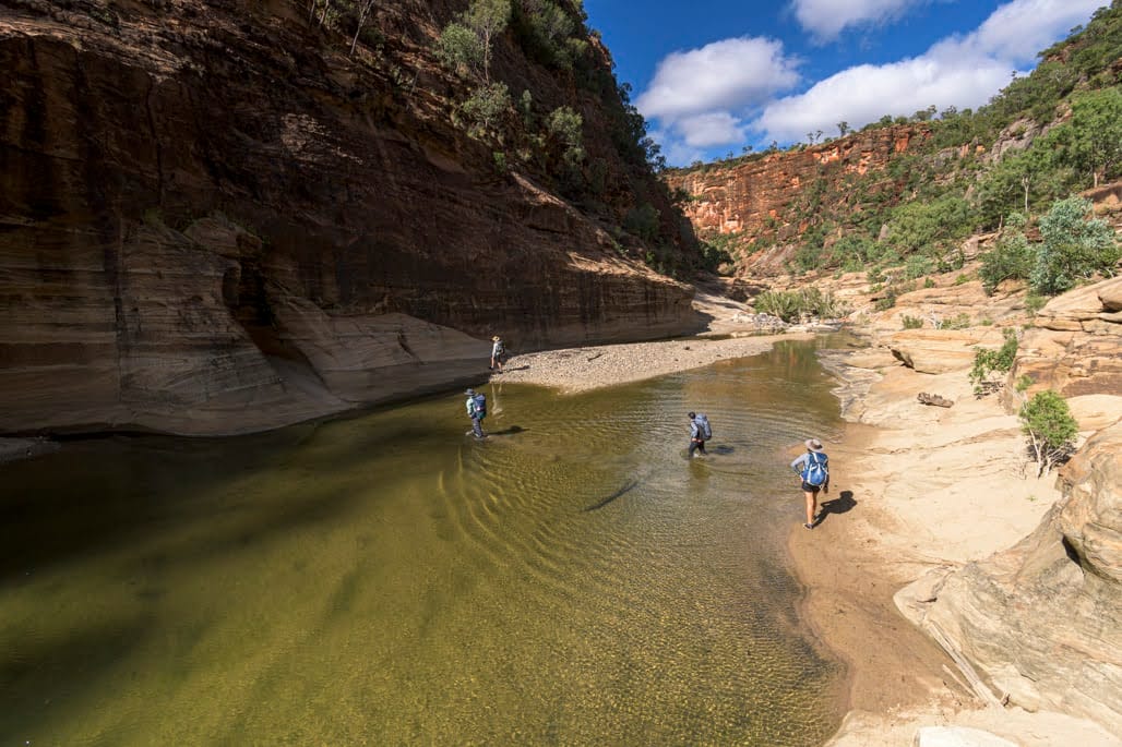 Day two took the group from the Amphitheatre down to White Wall, and this is the day that always reminds people why Porcupine Gorge is such a standout trip. The walking was not especially fast, but that was never the point. This section of the gorge rewards wandering eyes and a willingness to stop and take it all in. There were more crossings, more coloured rock shelves, more sandy bends, and plenty of time spent picking the best line through the terrain. At one point, the gorge below the lookout narrowed into a smaller inner gorge - a remarkable feature, with smooth rock, deeper water, and a real sense of being tucked inside the larger landscape. There was also plenty of fun to be had wherever the creek widened into pools and rapids. A lilo or packraft would be perfect in this country for a bit of extra amusement.