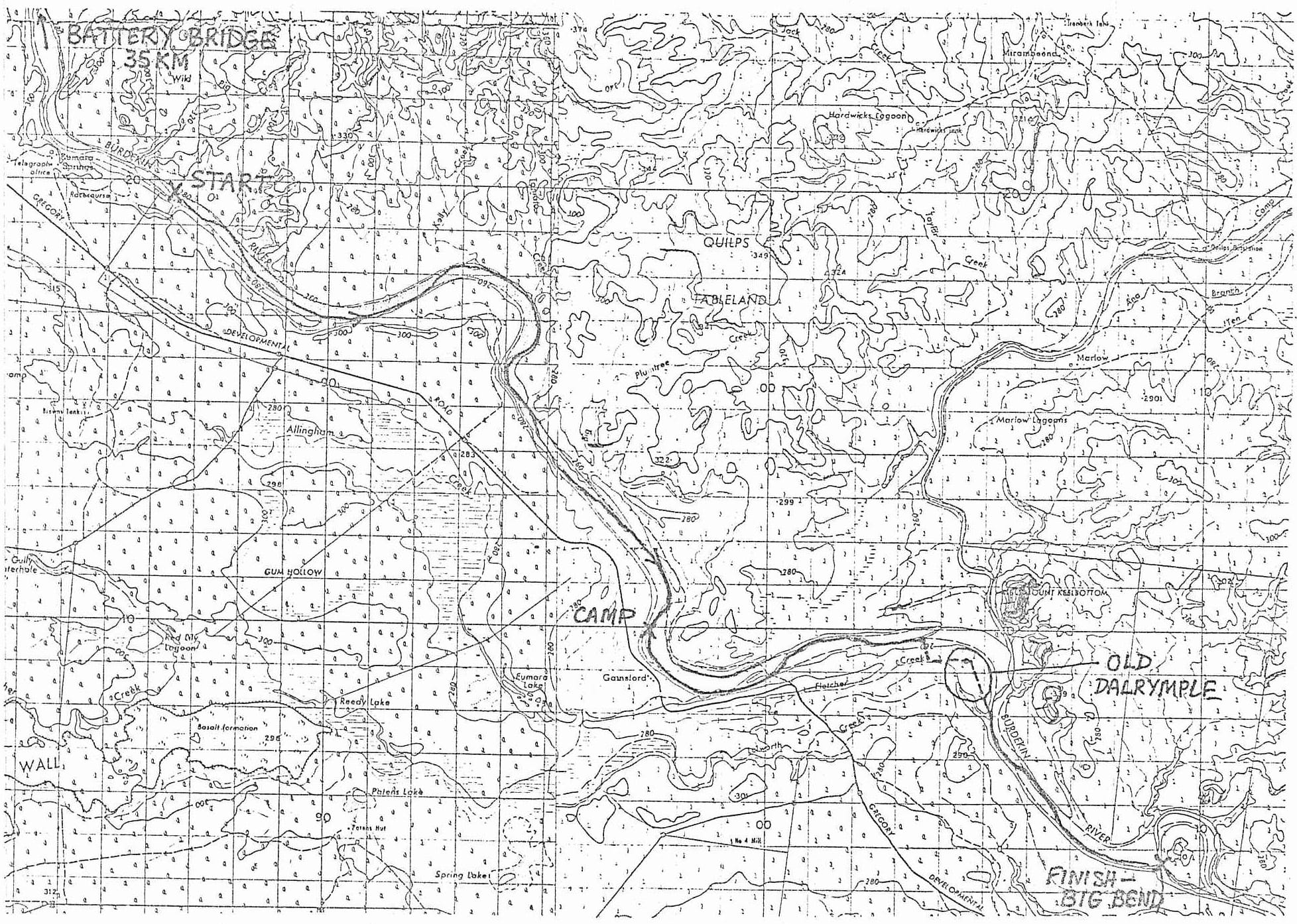 Thwarted but determined to try again, he teamed up with me for another attempt. Since the river was much lower, we decided that we could only get from the Battery Bridge to the Big Bend, a river distance of 76km, in the weekend. The river looked very low at the Macrossan Bridge, so we thought that even this distance might not be possible. We arrived at the Big Bend (40km from Charters Towers) at 9am, looked critically at the sluggish stream, and decided to cut the distance in half and raft from Eumara Springs station (see map) to there. Leaving one car there, we drove to Eumara Springs and wasted some time trying vainly to find someone to get permission to leave the other car there. Eventually, we parked just off the Lynd Road a couple of kilometres away, and carried the gear to the river.