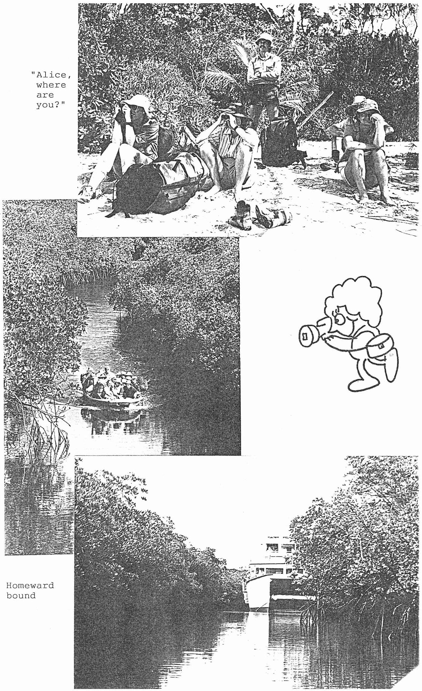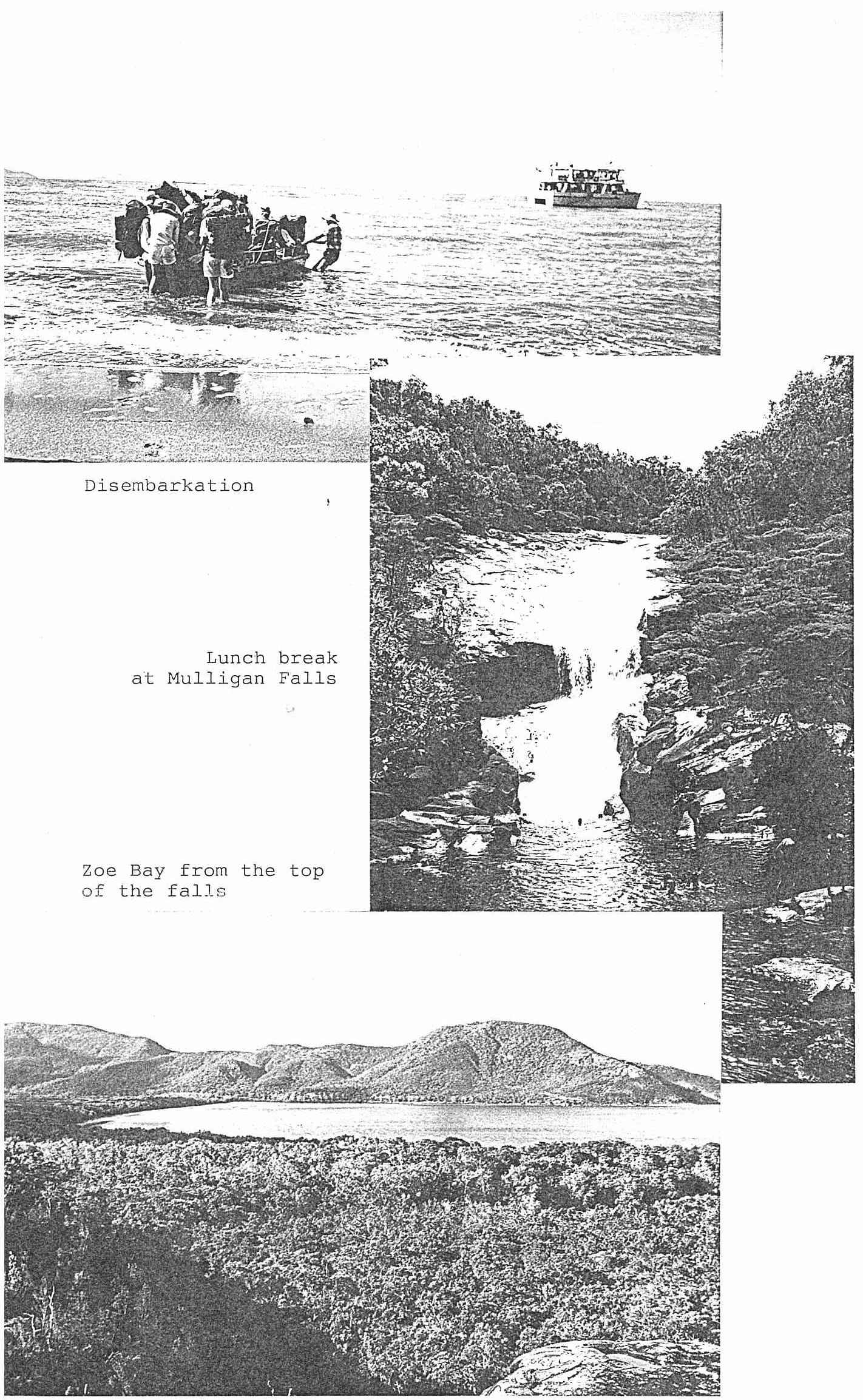 Left: Disembarkation, Lunch break at Mulligan Falls, Zoe Bay from the top of the falls; Right: "Alice,where are you?" Homeward bound;