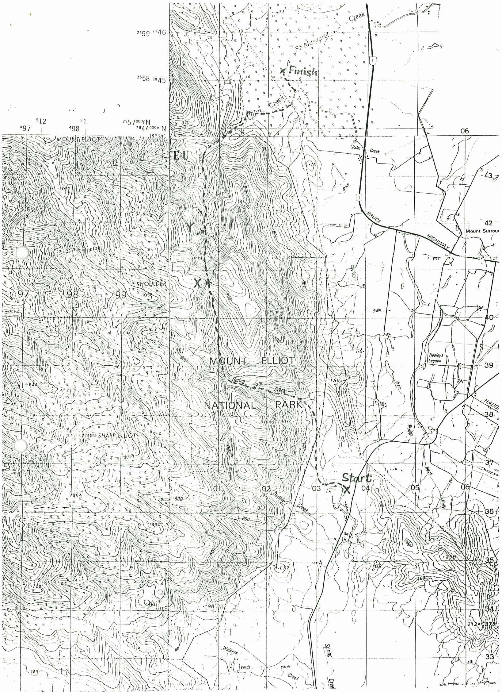 While the main party of walkers were on the Tully Gorge trip, a small, 'select' group, David Fowden (leader), John Hunter and I set out at 7:00 in the morning for Mt. Elliott National Park. The aim was to follow Spring Creek from Pangola Park until it petered out at a 690m saddle (see point X on the map) below 'The Shoulder' of Mt.Elliott, then drop into St.Margaret's Creek and follow it down to the plain. If we had the time and energy, we would also pop up to the Shoulder, 350m above the saddle at the top of Spring Creek.
