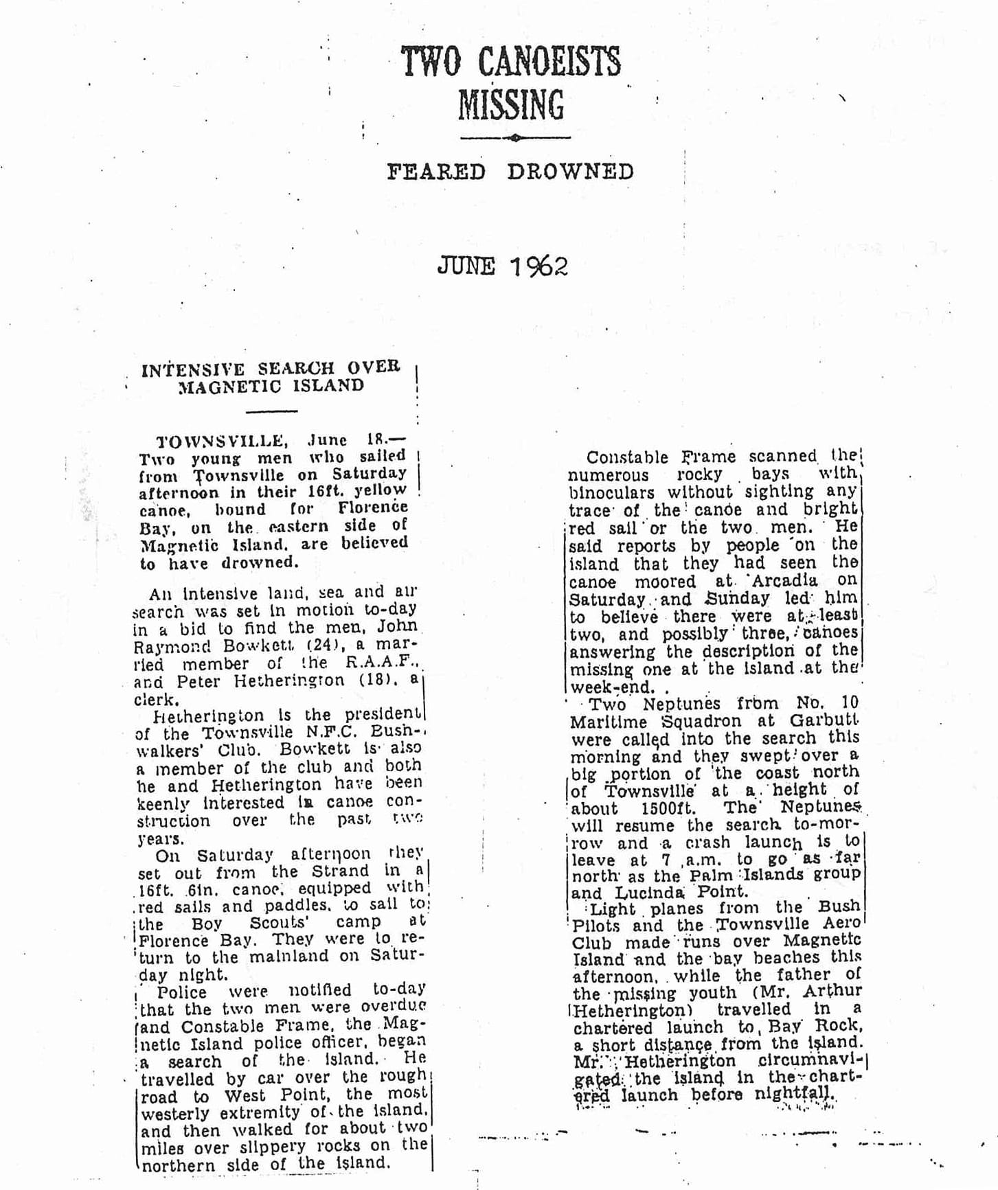 Constable Frame scanned the numerous rocky bays with binoculars without sighting any trace of the canoe and bright red sail or the two men. He said reports by people on the island that they had seen the canoe moored at Arcadia on Saturday and Sunday led him to believe there were at least two, and possibly three, canoes answering the description of the missing one at the island at the week-end. Two Neptunes from No. 10 Maritime Squadron at Garbutt were called into the search this morning and they swept over a big portion of the coast north of Townsville at a height of about 1500ft. The Neptunes will resume the search to-morrow and a crash launch is to leave at 7 a.m. to go as far north as the Palm Islands group and Lucinda Point. Light planes from the Bush Pilots and the Townsville Aero Club made runs over Magnetic Island and the bay beaches this afternoon, while the father of the missing youth (Mr. Arthur Hetherington) travelled in a chartered launch to Bay Rock, a short distance from the island. Mr. Hetherington circumnavigated the island in the chartered launch before nightfall. |