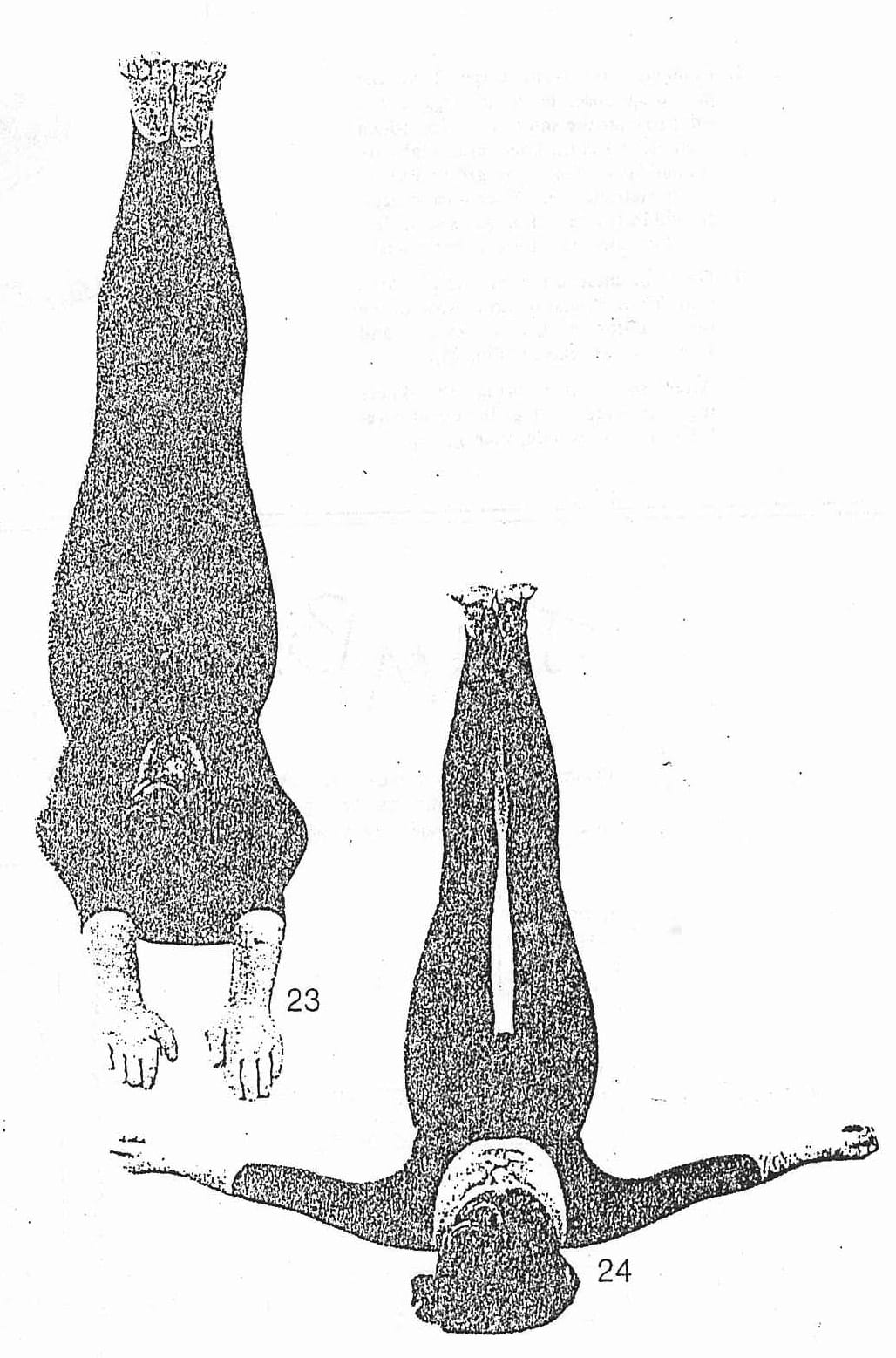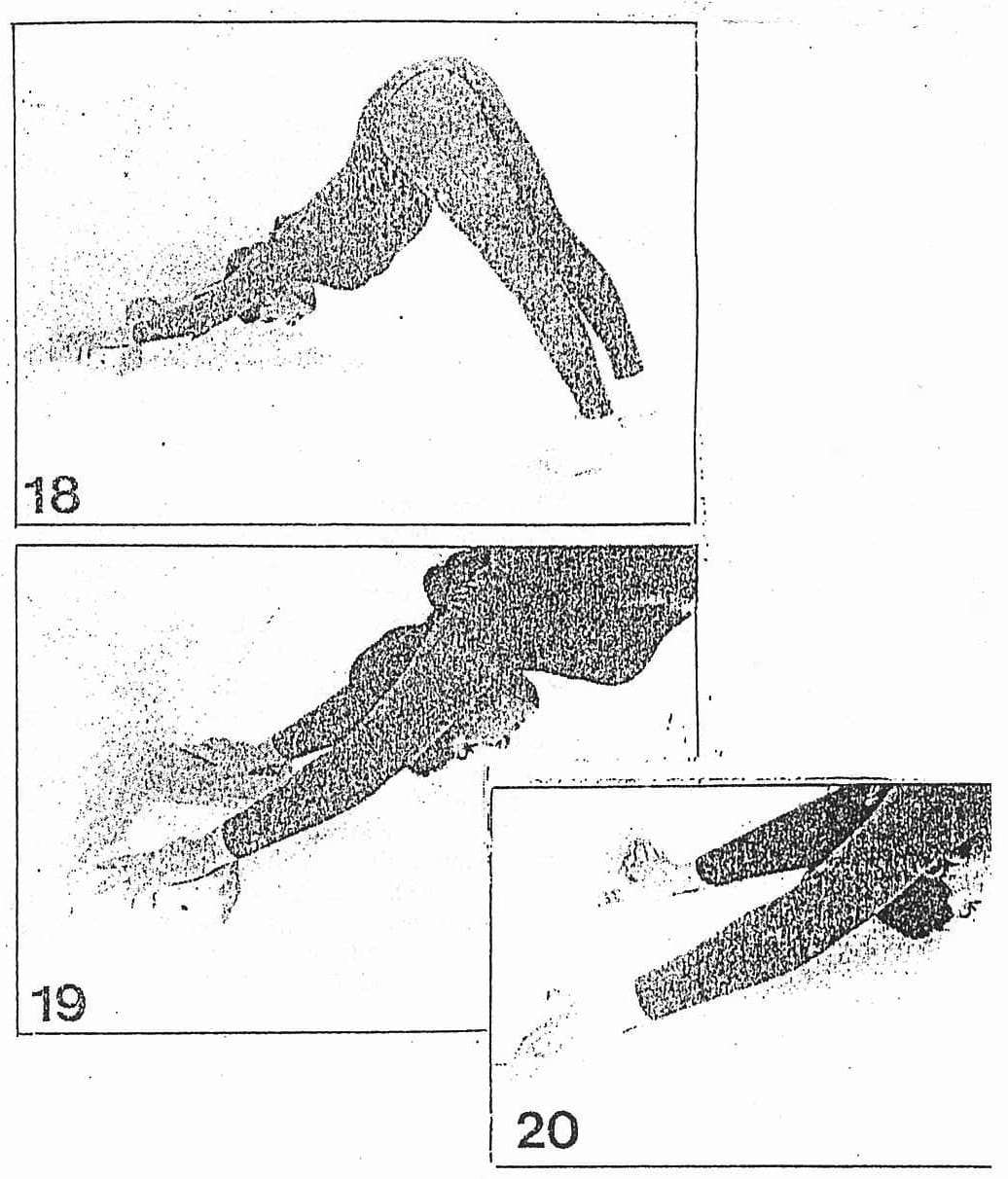 - Do the same posture as before, but without using the bricks. Follow the same procedure, but place the palms on the floor with the fingers against the wall to stop you from sliding and also to help get a firmer grip of the hands, which is necessary to control the arms (Fig. 20). Compare close-up of 19 and 20; in the latter the head is further down and the shoulderblades are working harder. Come up when you feel you have worked well.