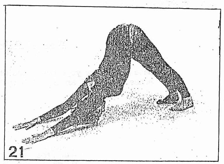 - With an in breath press the toes and palms into the floor, lift up the trunk and kneel. Then straighten the legs and the arms, lift the trunk, and stretch the heels down. Press the shoulderblades into the back ribs and take the head down (Fig. 21). In this variation there is a more complete extension of the whole body. When you are ready, come up.